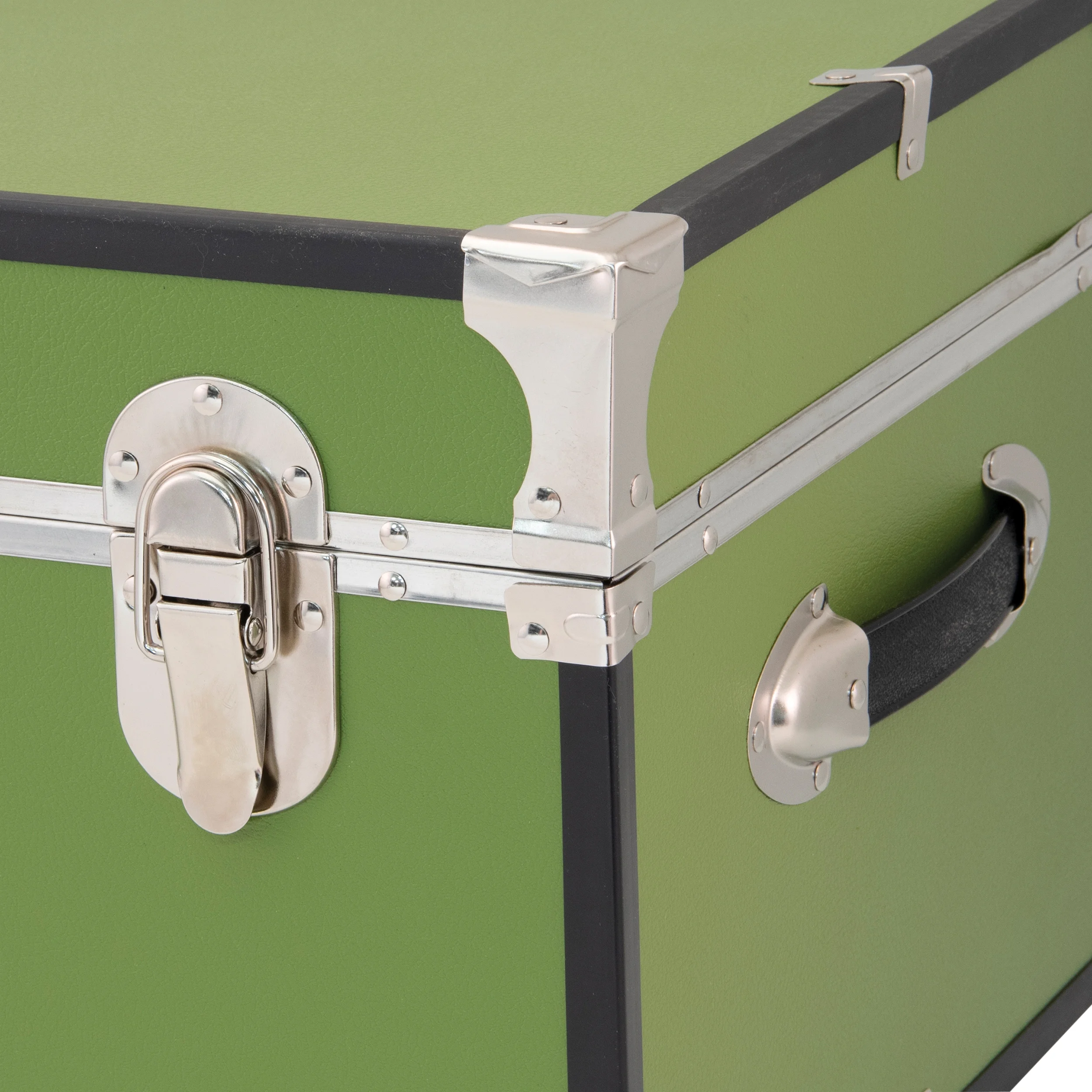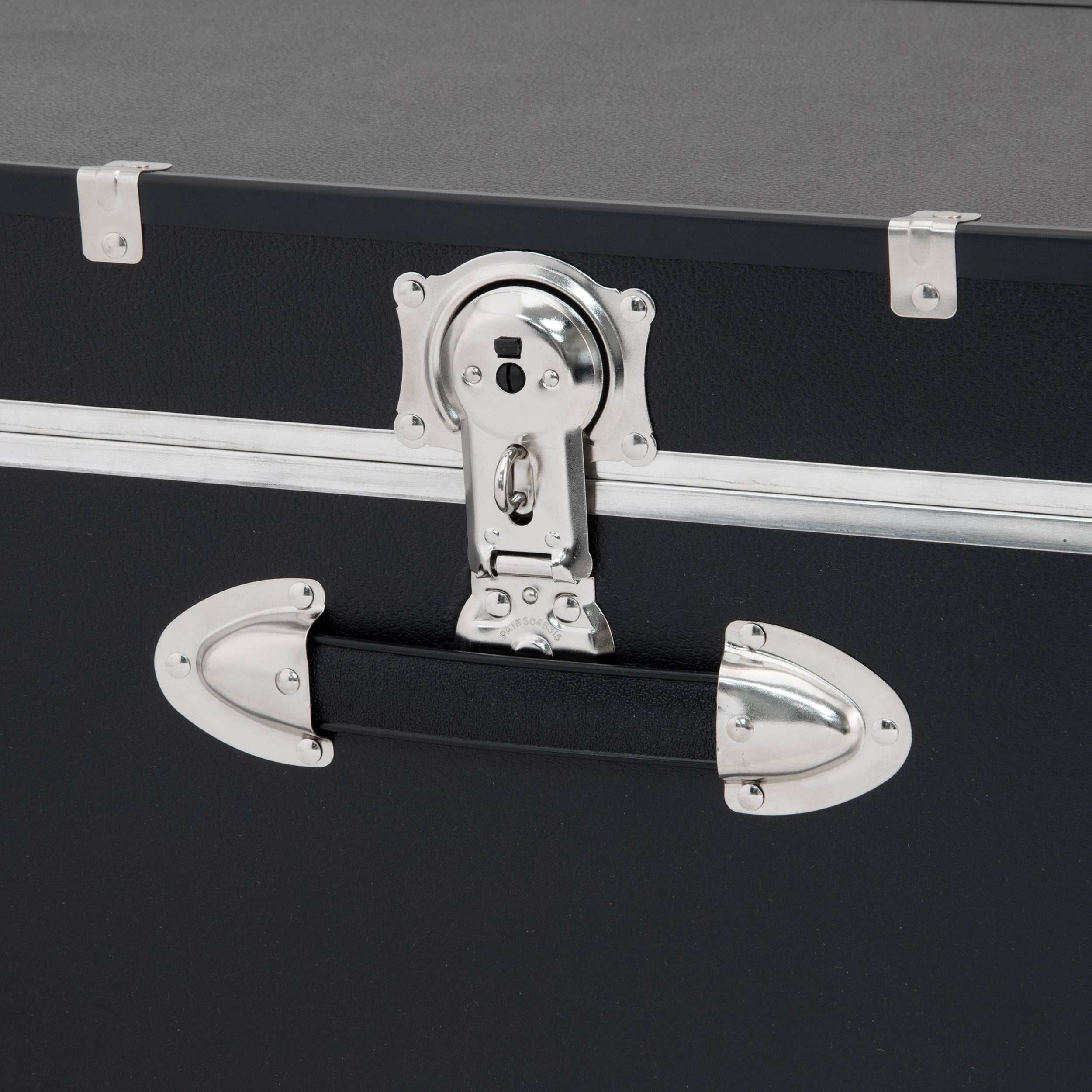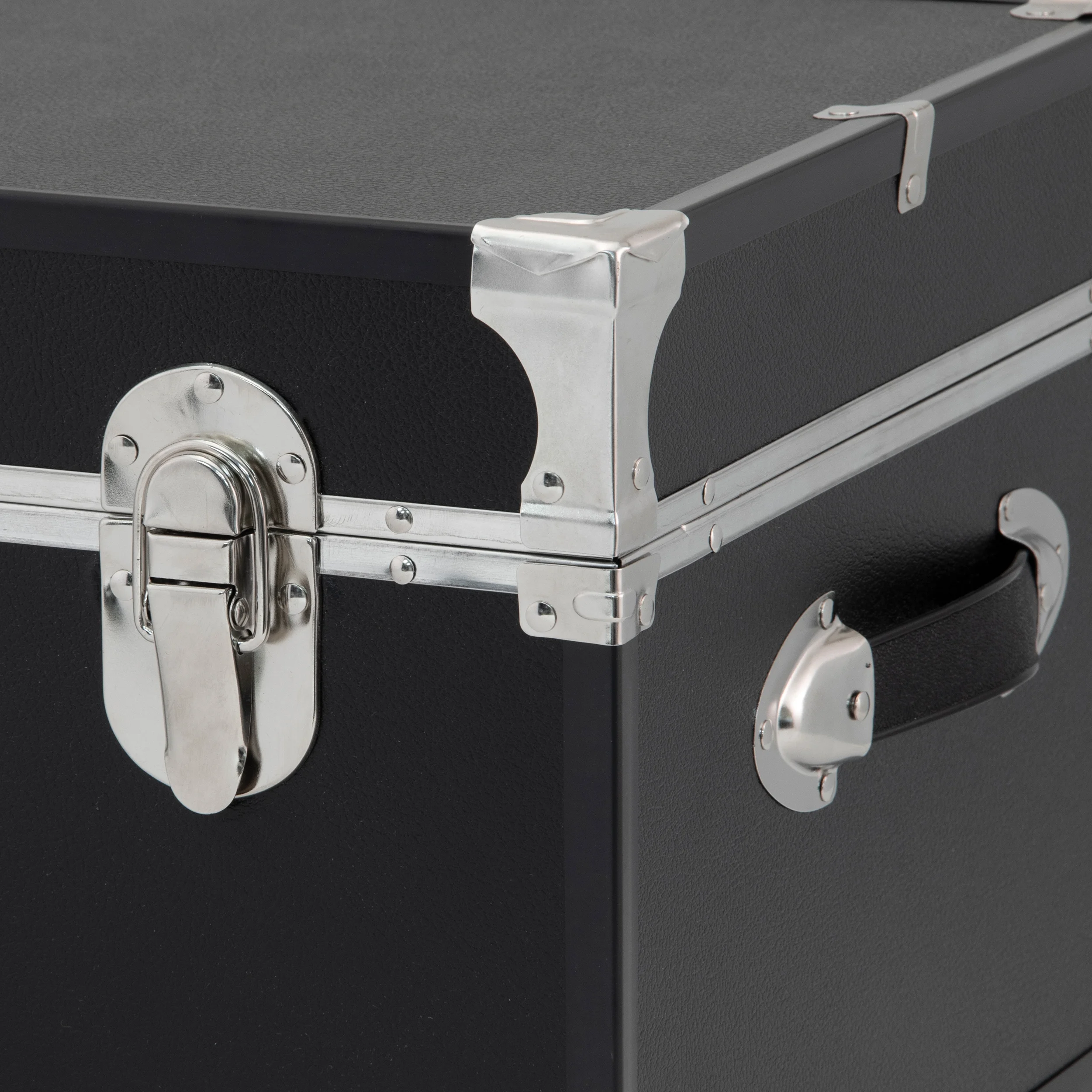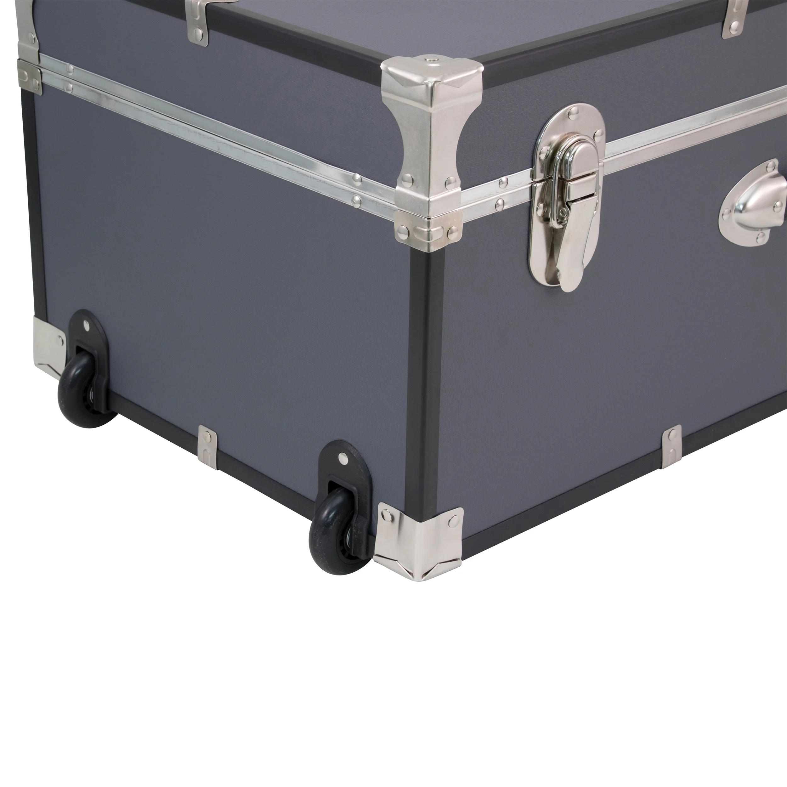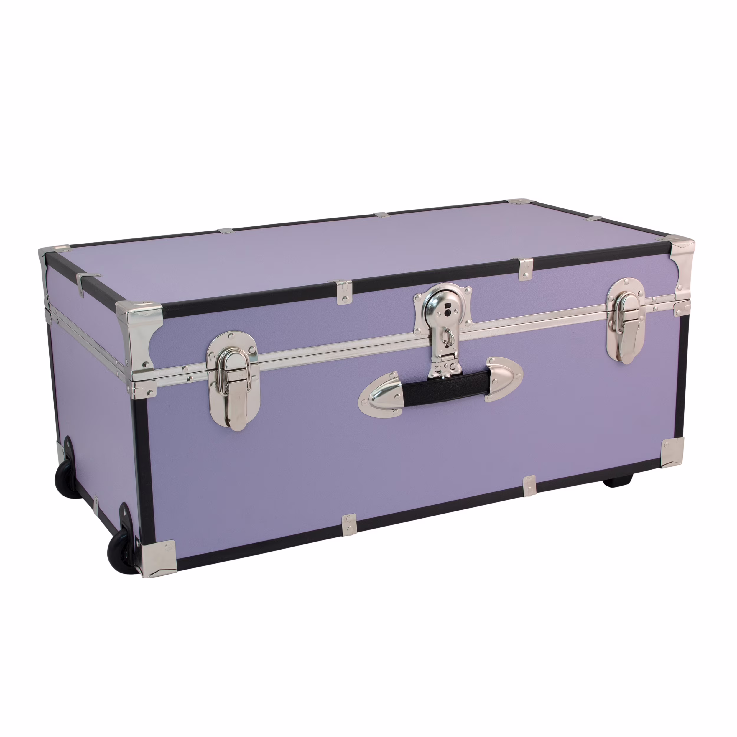 Expand your storage solutions with this Seward Collegiate Collection Footlocker Trunk with Wheels. Durable wooden construction, a heavy gauge vinyl covering and a paper-lined interior to protect contents make this trunk a reliable solution for all of your storage and organizational needs. Designed with durability in mind, the Seward Collegiate Collection Footlocker Trunk with Wheels is made with black high impact styrene bindings, nickel plated hardware and two durable recessed wheels. It also features an easy open push button key lock (includes two keys) and can also be locked with a padlock for added security.Constructed of durable wood and covered with heavy, easy-care vinyl