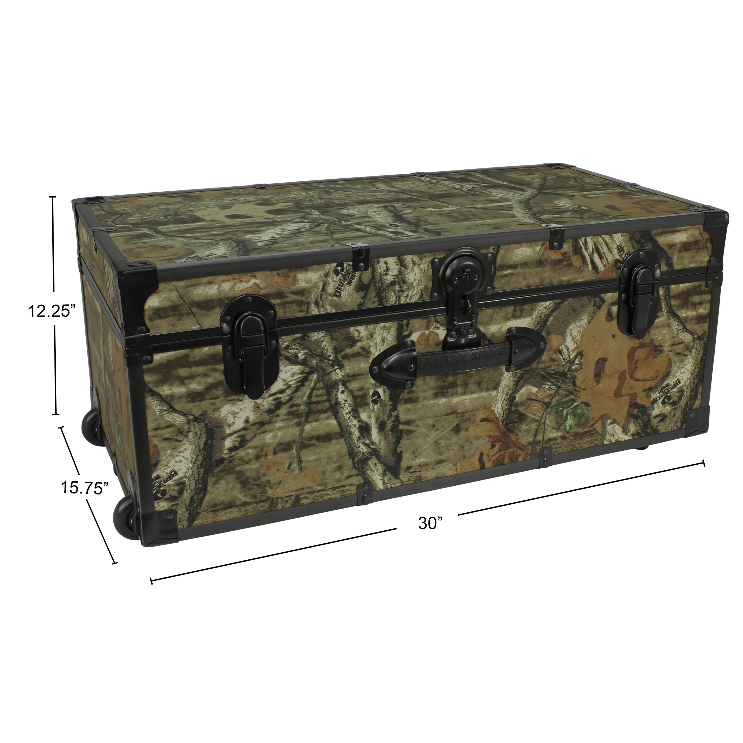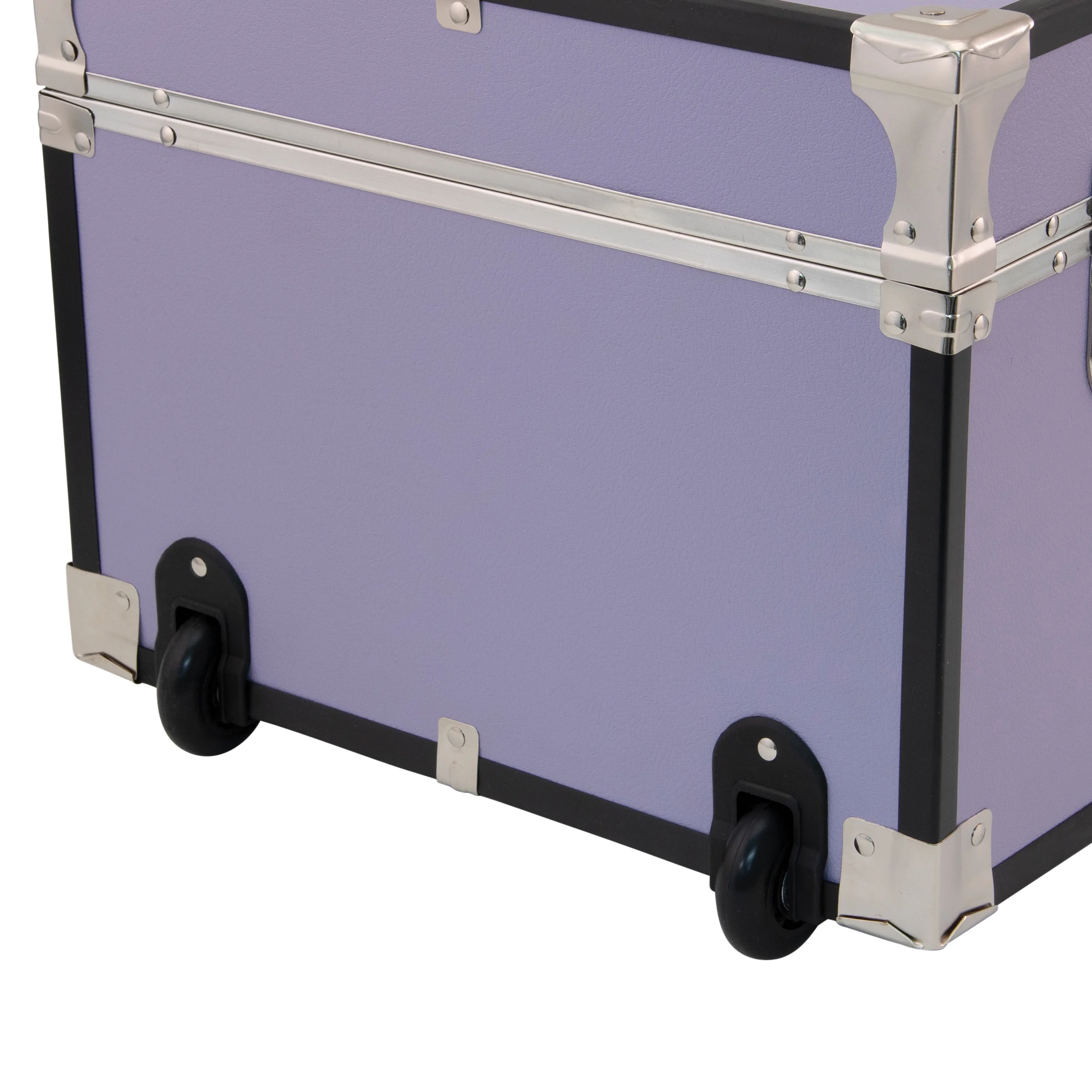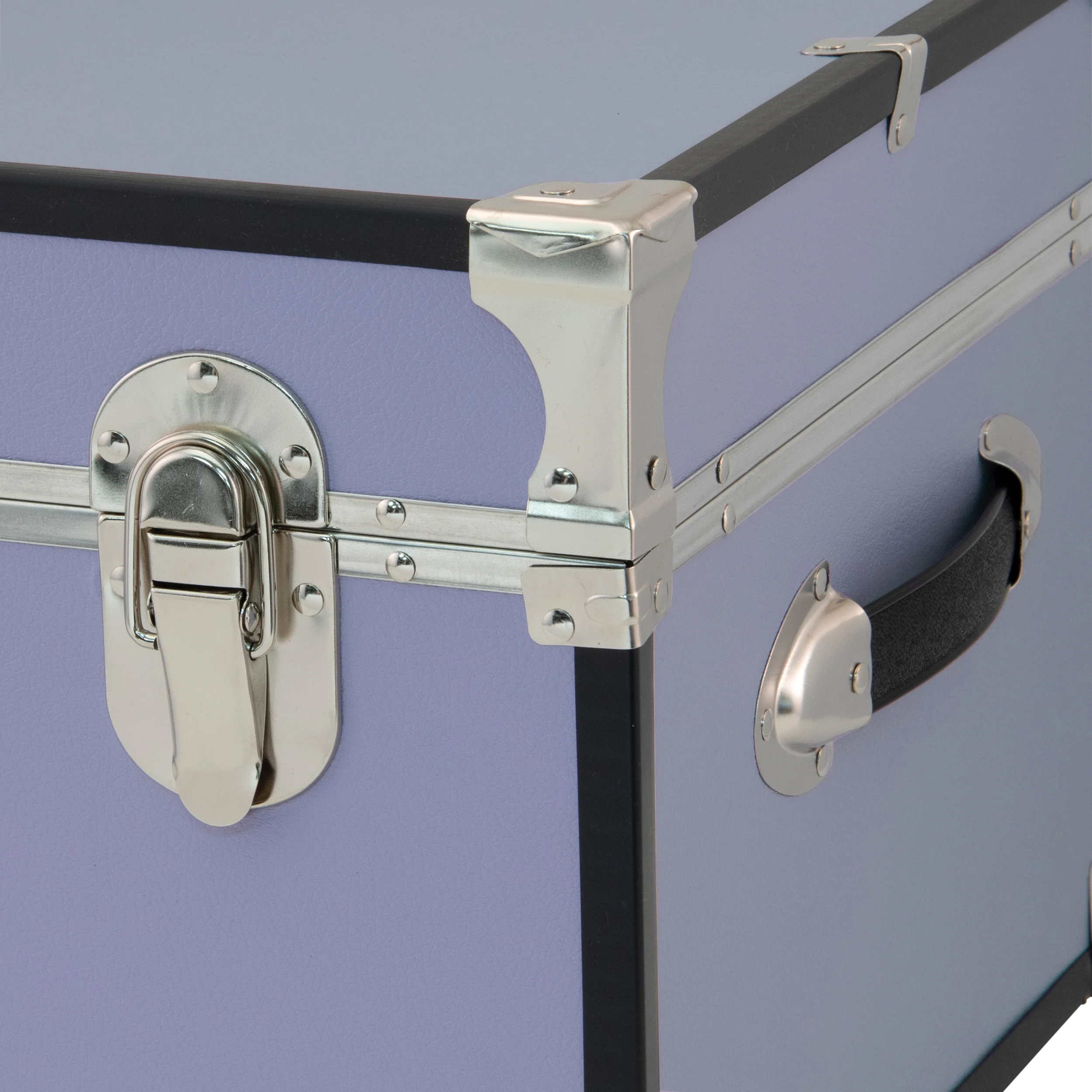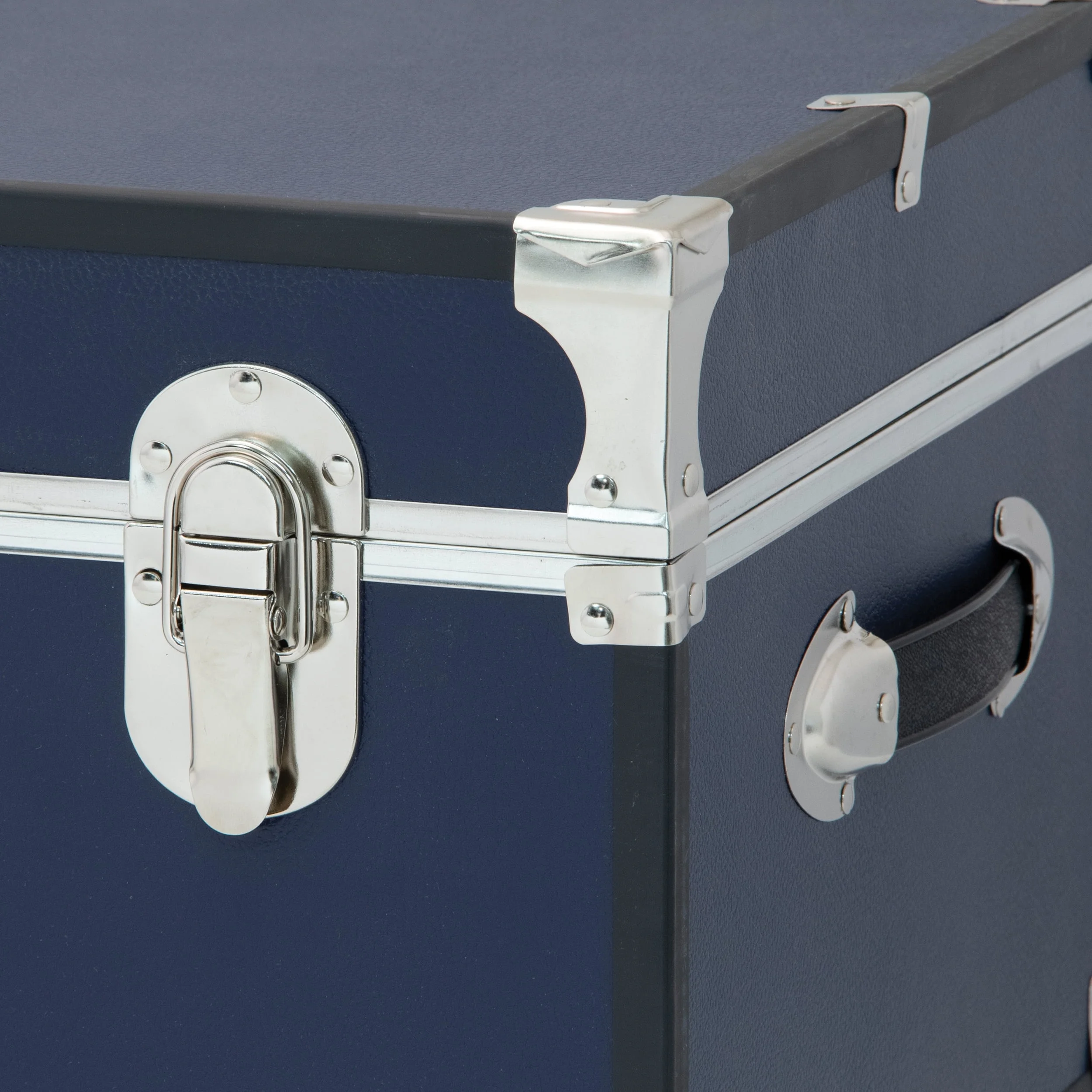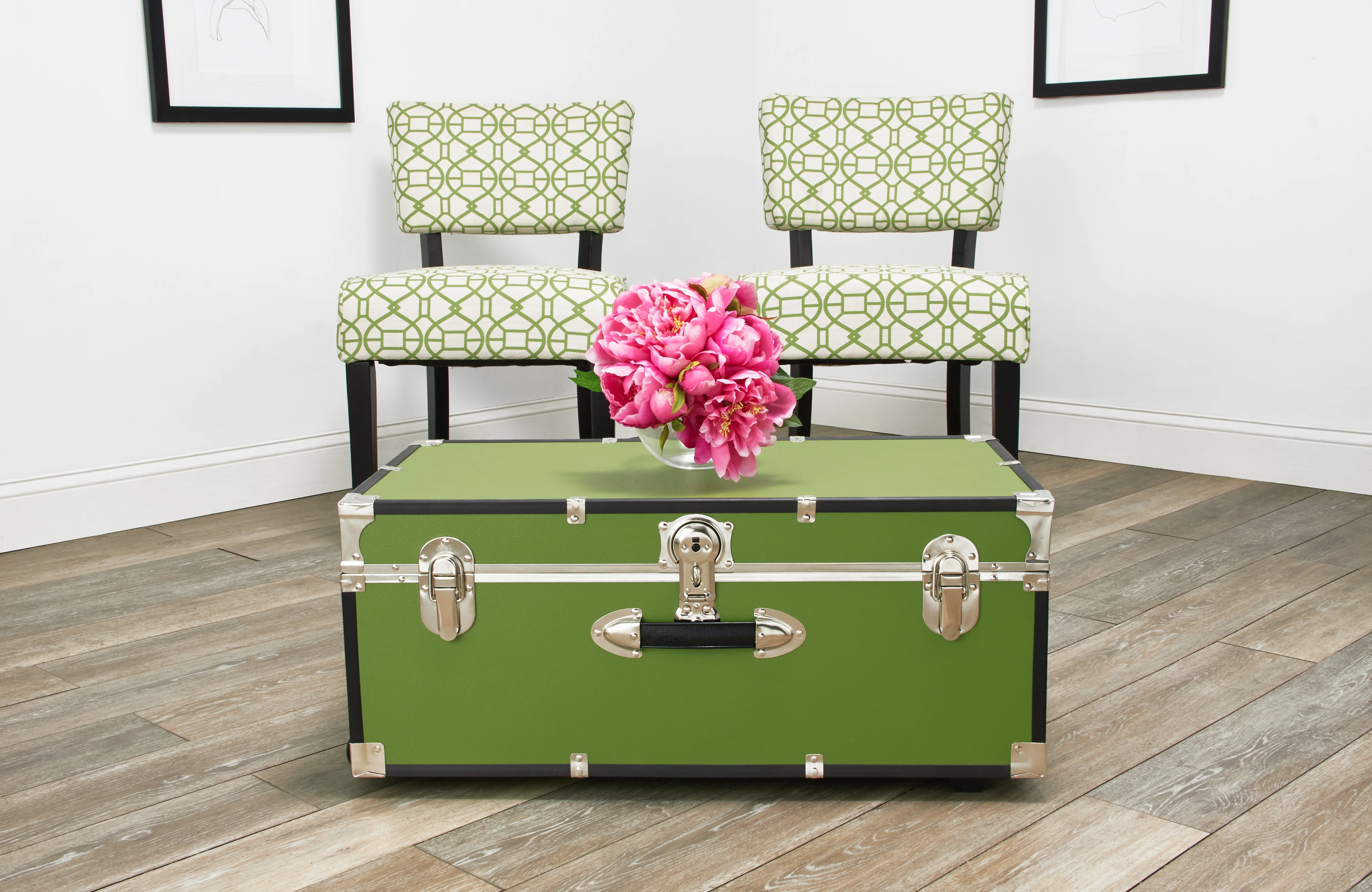 Expand your storage solutions with this Seward Collegiate Collection Footlocker Trunk with Wheels. Durable wooden construction, a heavy gauge vinyl covering and a paper-lined interior to protect contents make this trunk a reliable solution for all of your storage and organizational needs. Designed with durability in mind, the Seward Collegiate Collection Footlocker Trunk with Wheels is made with black high impact styrene bindings, nickel plated hardware and two durable recessed wheels. It also features an easy open push button key lock (includes two keys) and can also be locked with a padlock for added security.Constructed of durable wood and covered with heavy, easy-care vinyl