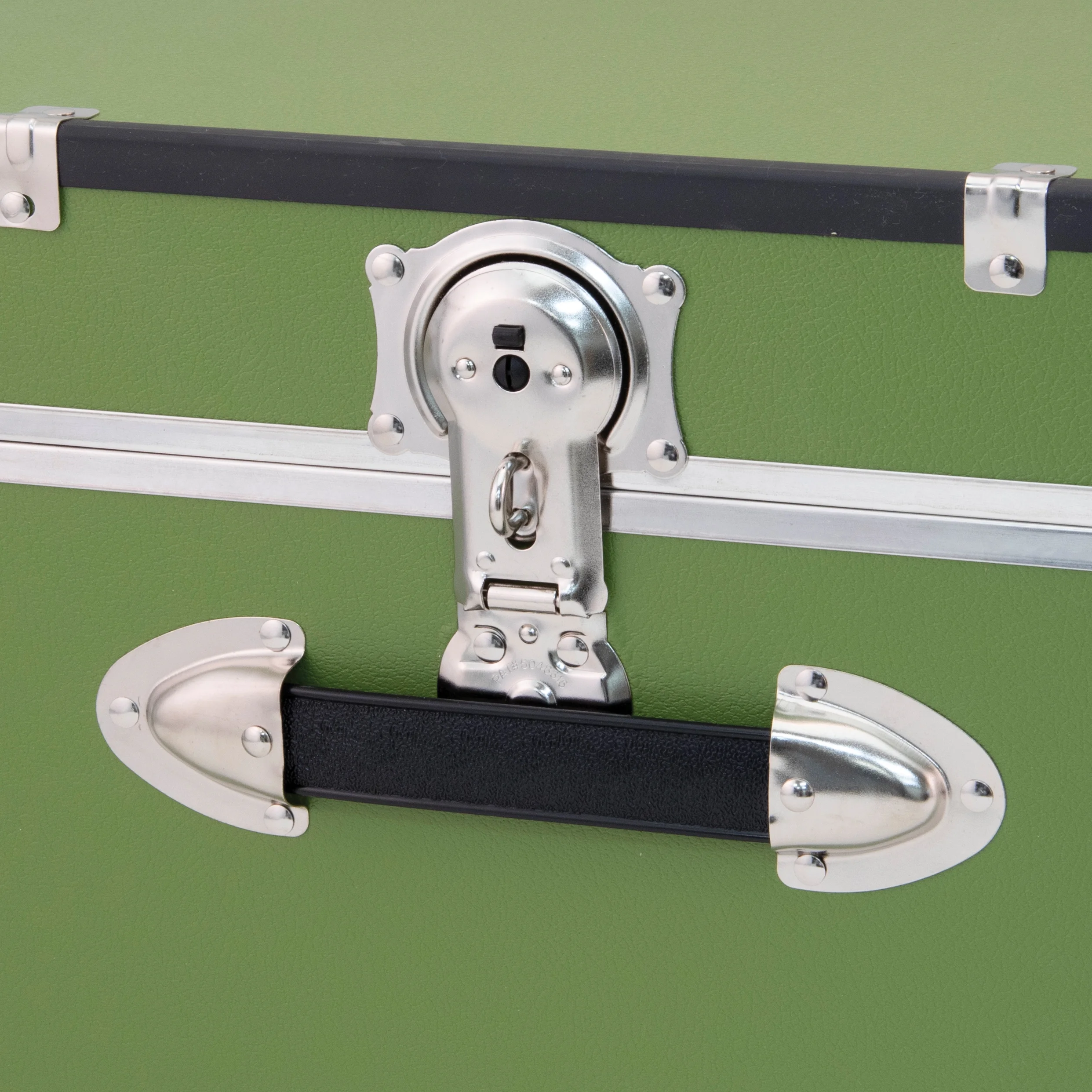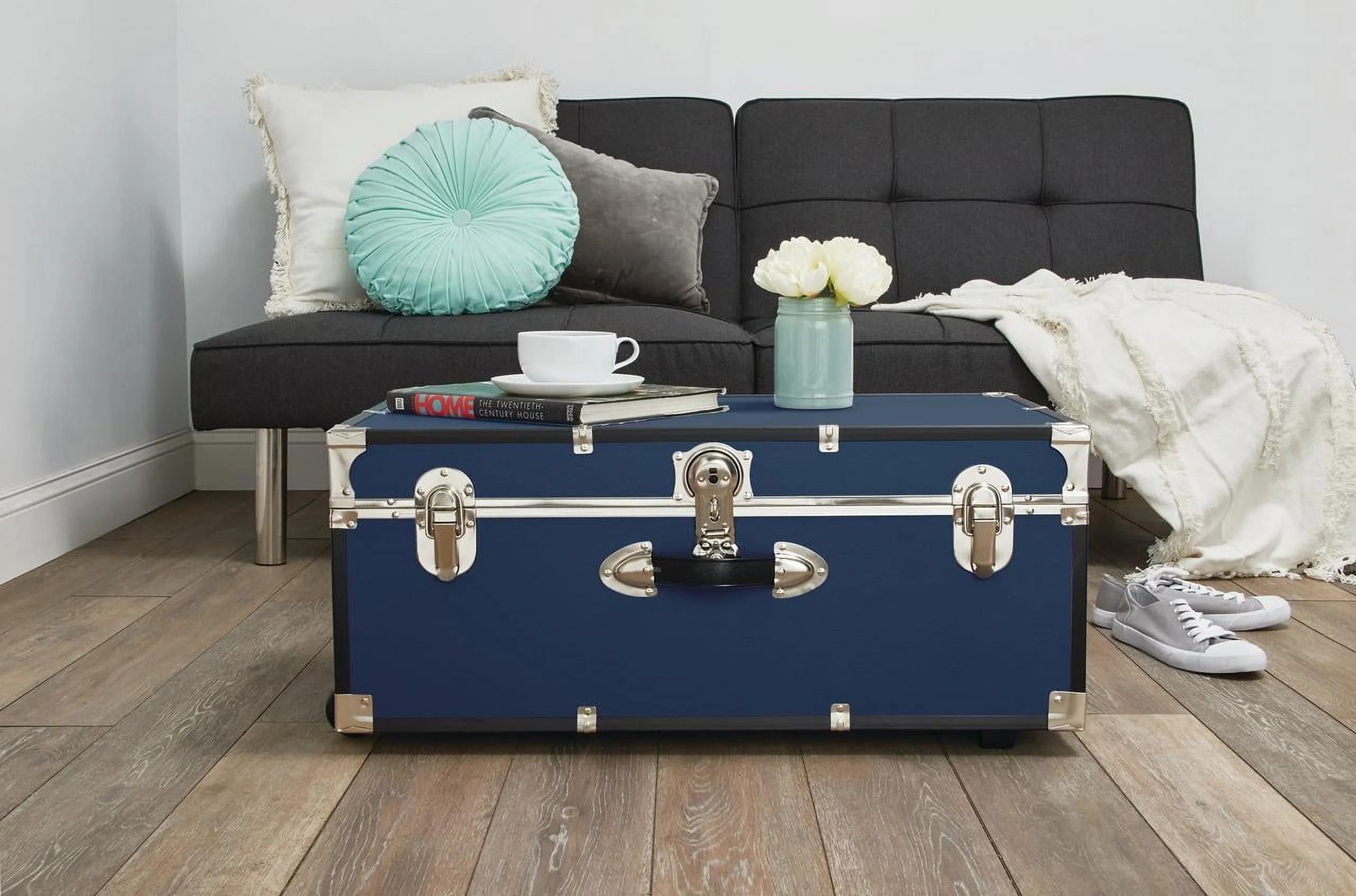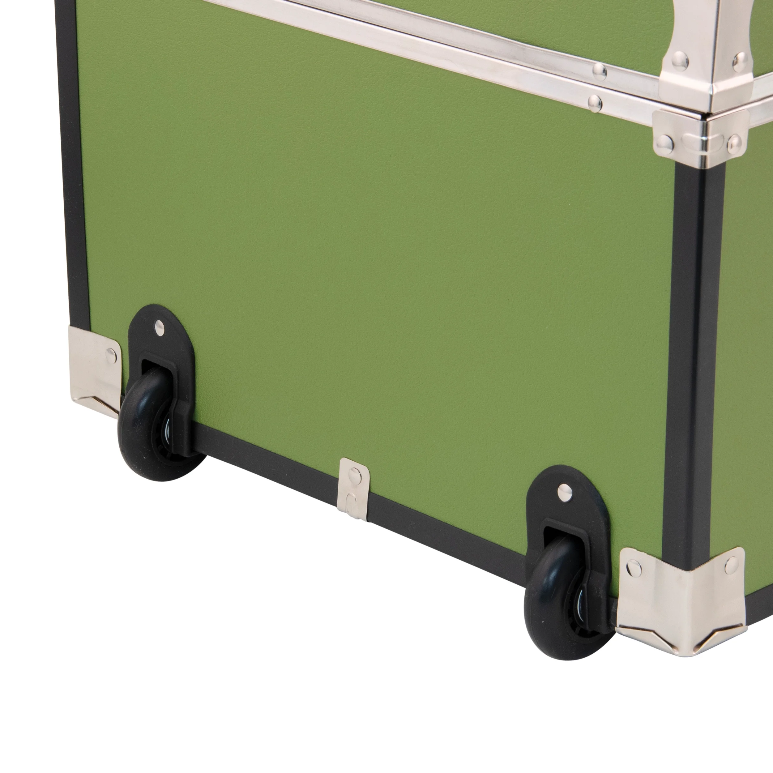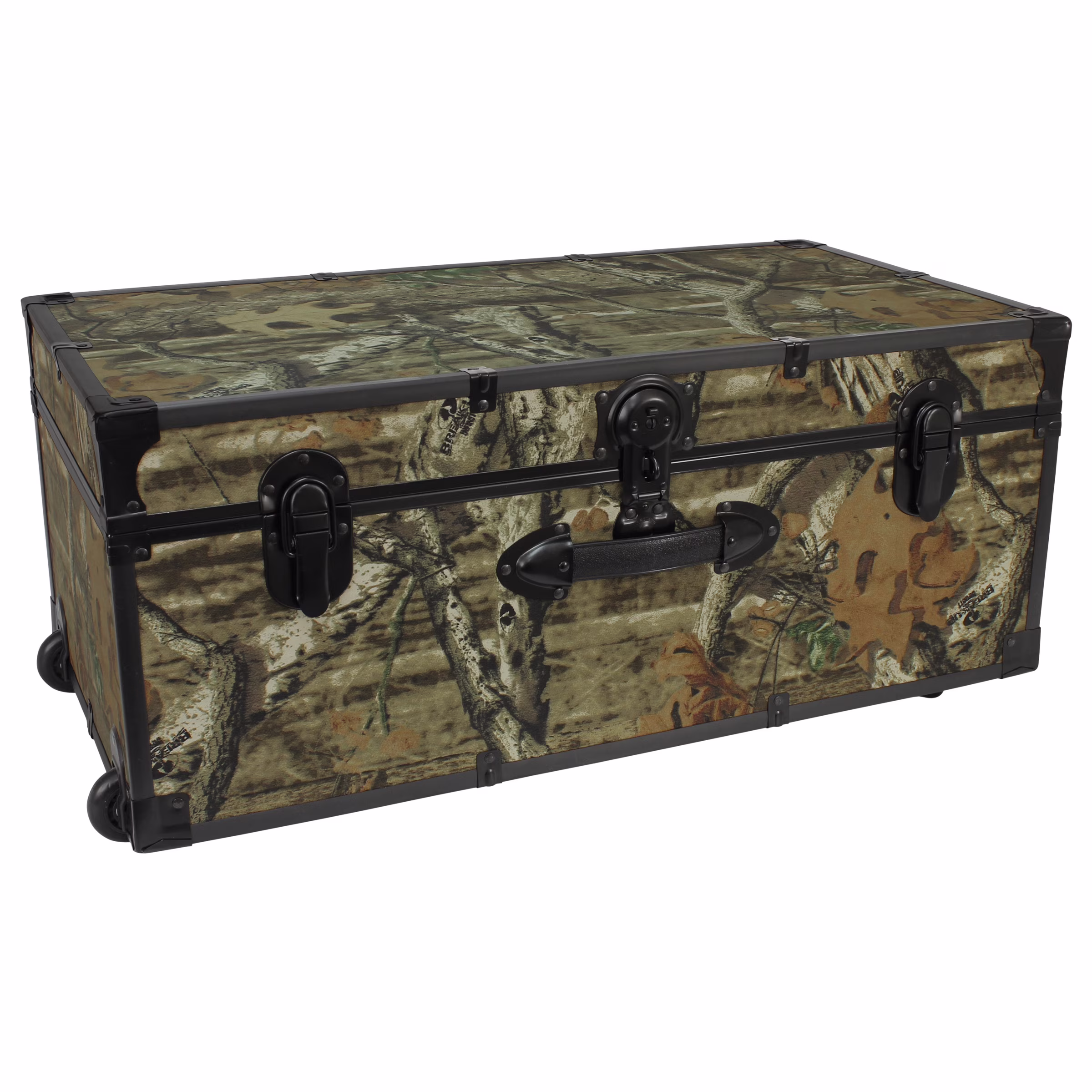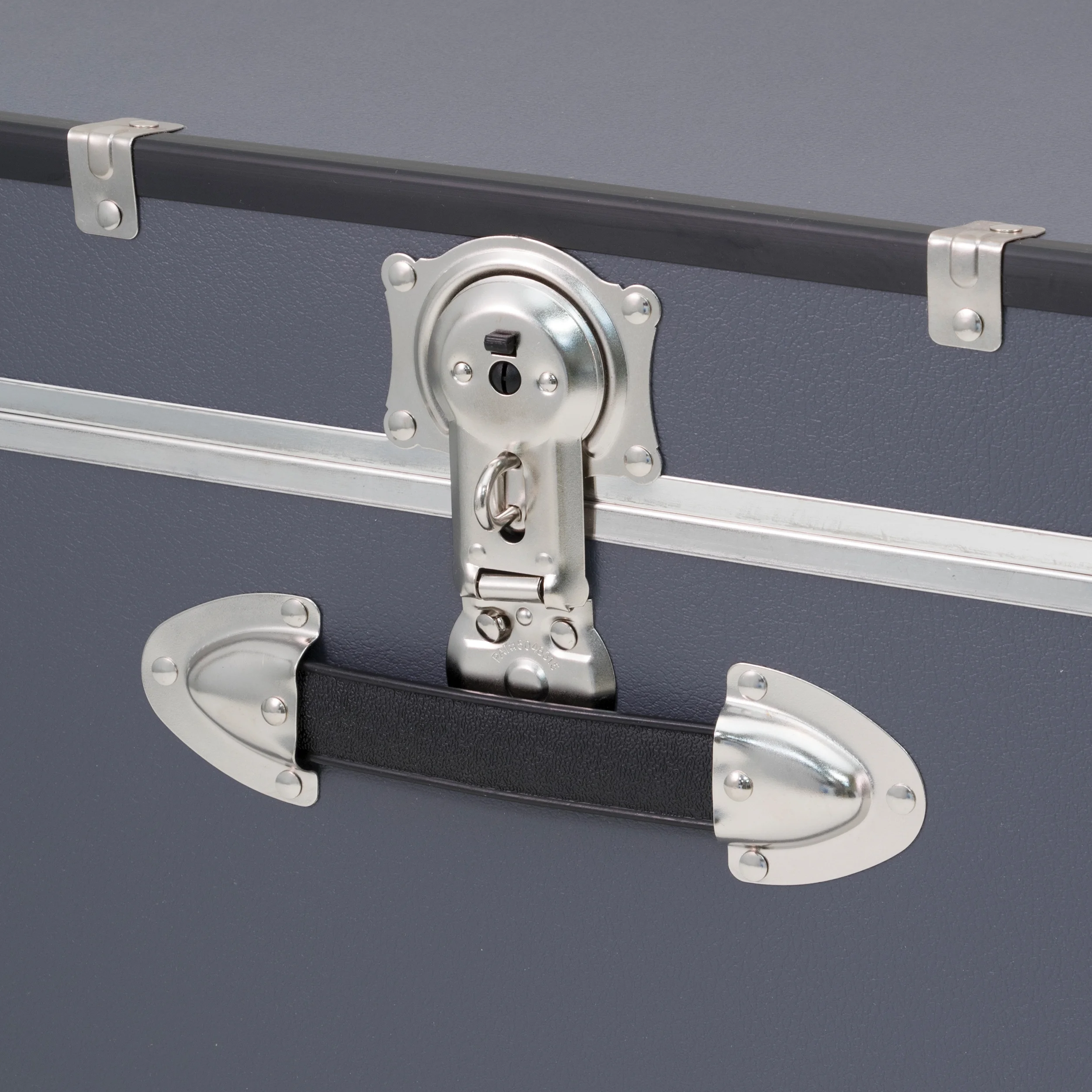 Expand your storage solutions with this Seward Collegiate Collection Footlocker Trunk with Wheels. Durable wooden construction, a heavy gauge vinyl covering and a paper-lined interior to protect contents make this trunk a reliable solution for all of your storage and organizational needs. Designed with durability in mind, the Seward Collegiate Collection Footlocker Trunk with Wheels is made with black high impact styrene bindings, nickel plated hardware and two durable recessed wheels. It also features an easy open push button key lock (includes two keys) and can also be locked with a padlock for added security.Constructed of durable wood and covered with heavy, easy-care vinyl