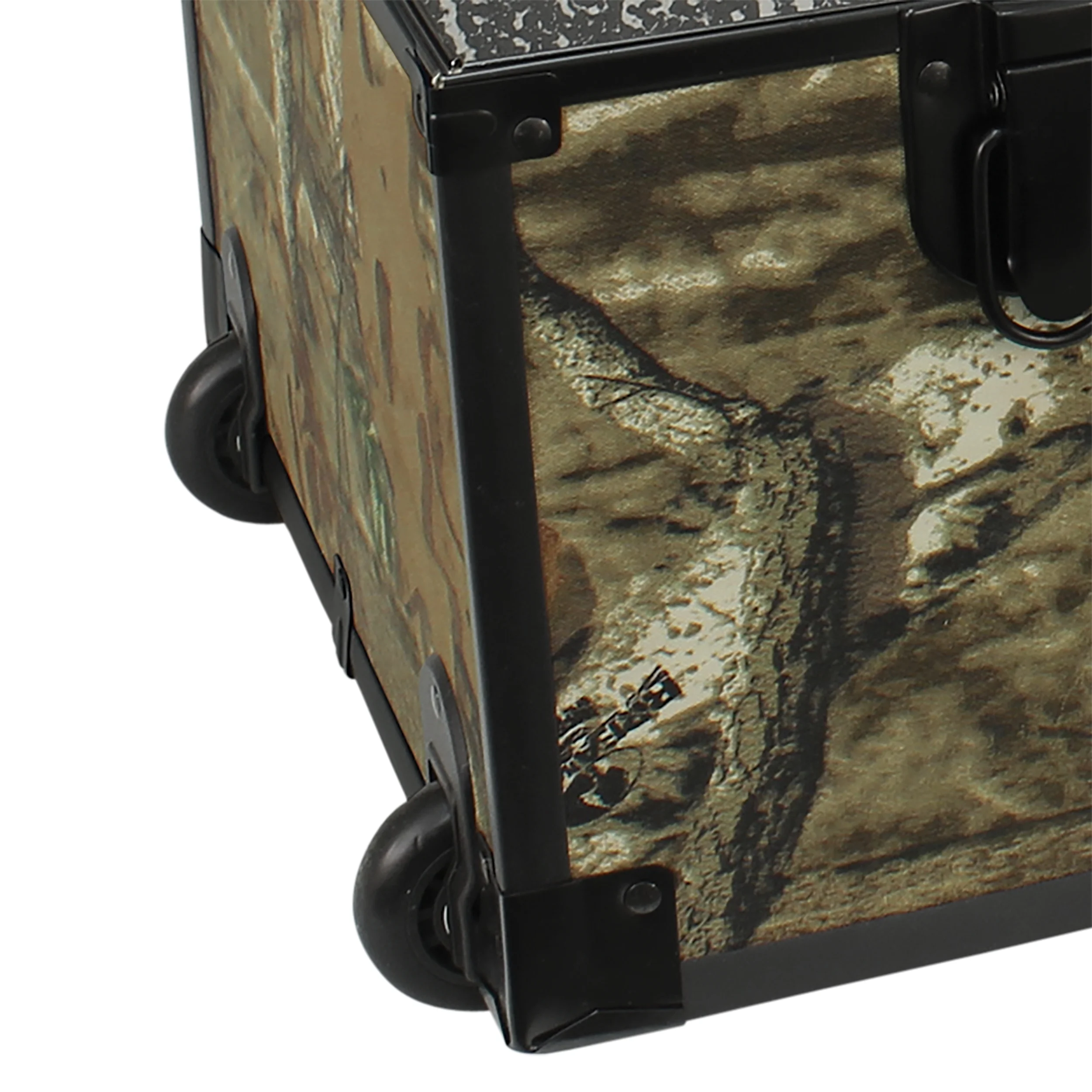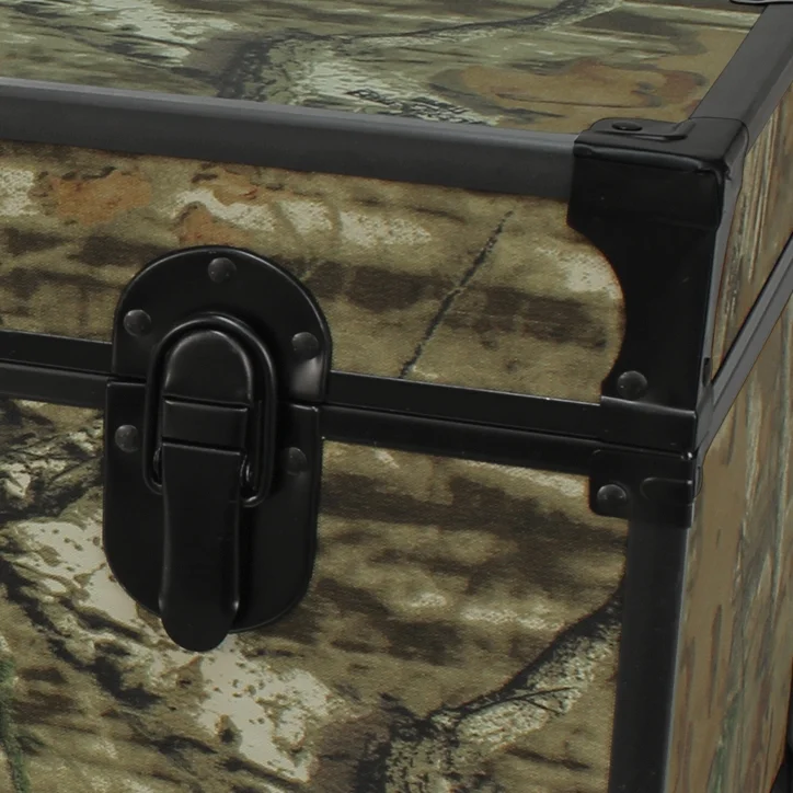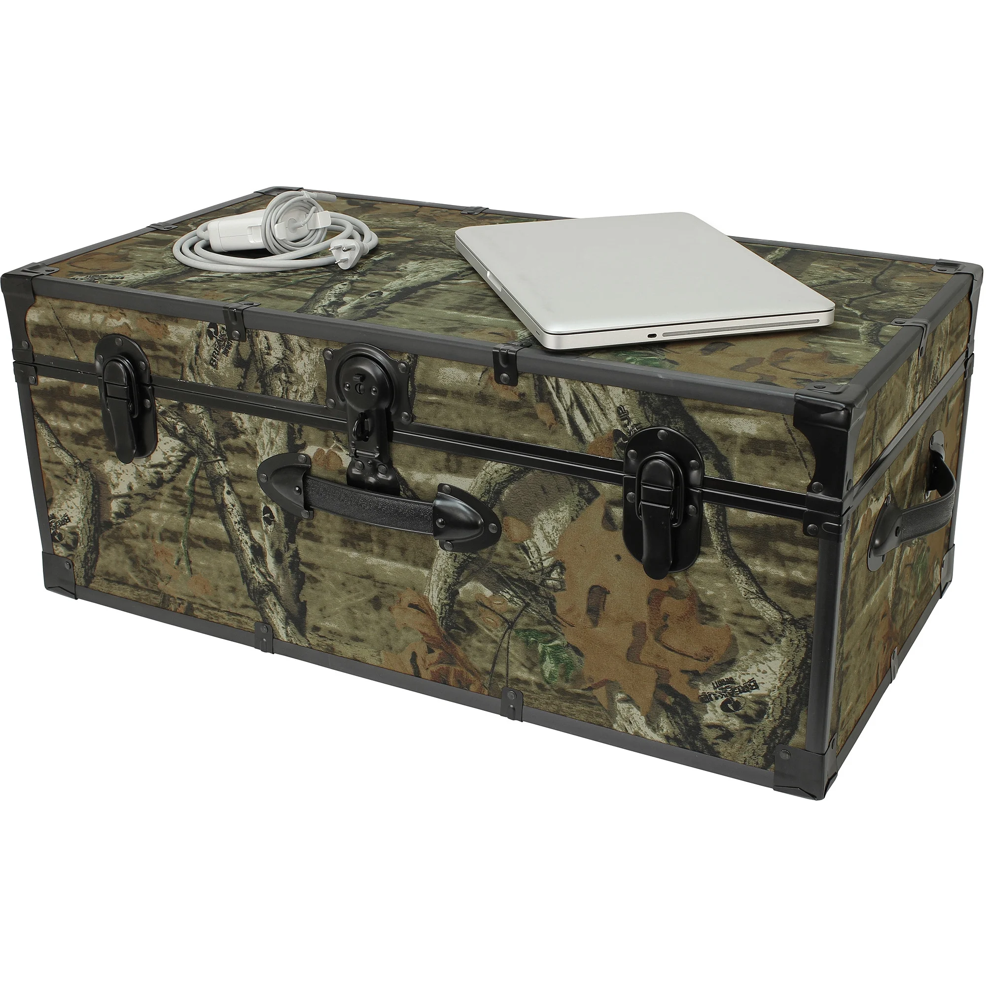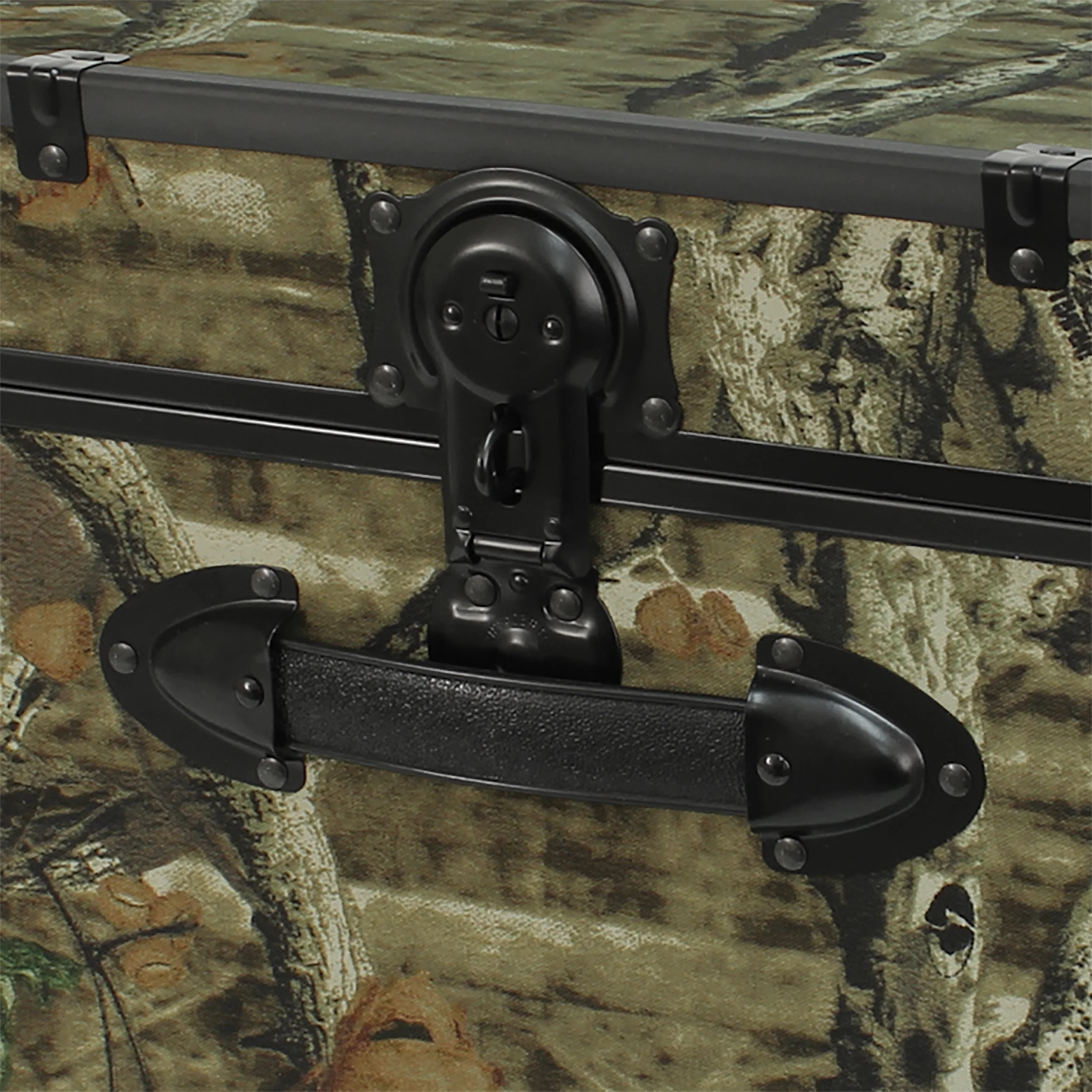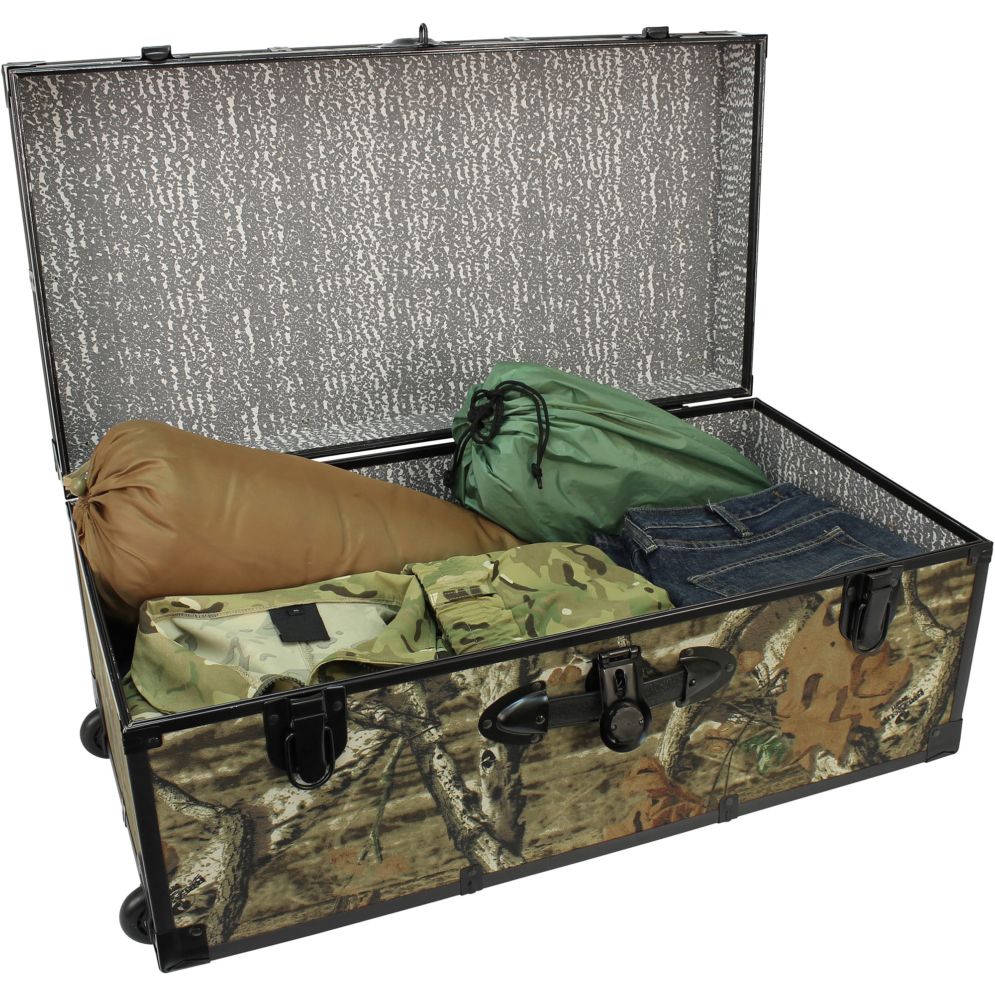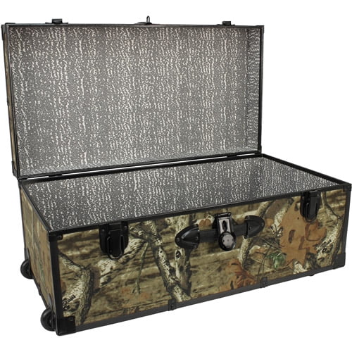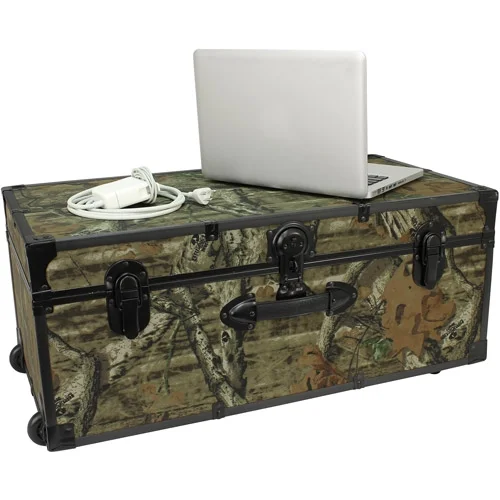 Expand your storage solutions with this Seward Collegiate Collection Footlocker Trunk with Wheels. Durable wooden construction, a heavy gauge vinyl covering and a paper-lined interior to protect contents make this trunk a reliable solution for all of your storage and organizational needs. Designed with durability in mind, the Seward Collegiate Collection Footlocker Trunk with Wheels is made with black high impact styrene bindings, nickel plated hardware and two durable recessed wheels. It also features an easy open push button key lock (includes two keys) and can also be locked with a padlock for added security.Constructed of durable wood and covered with heavy, easy-care vinyl