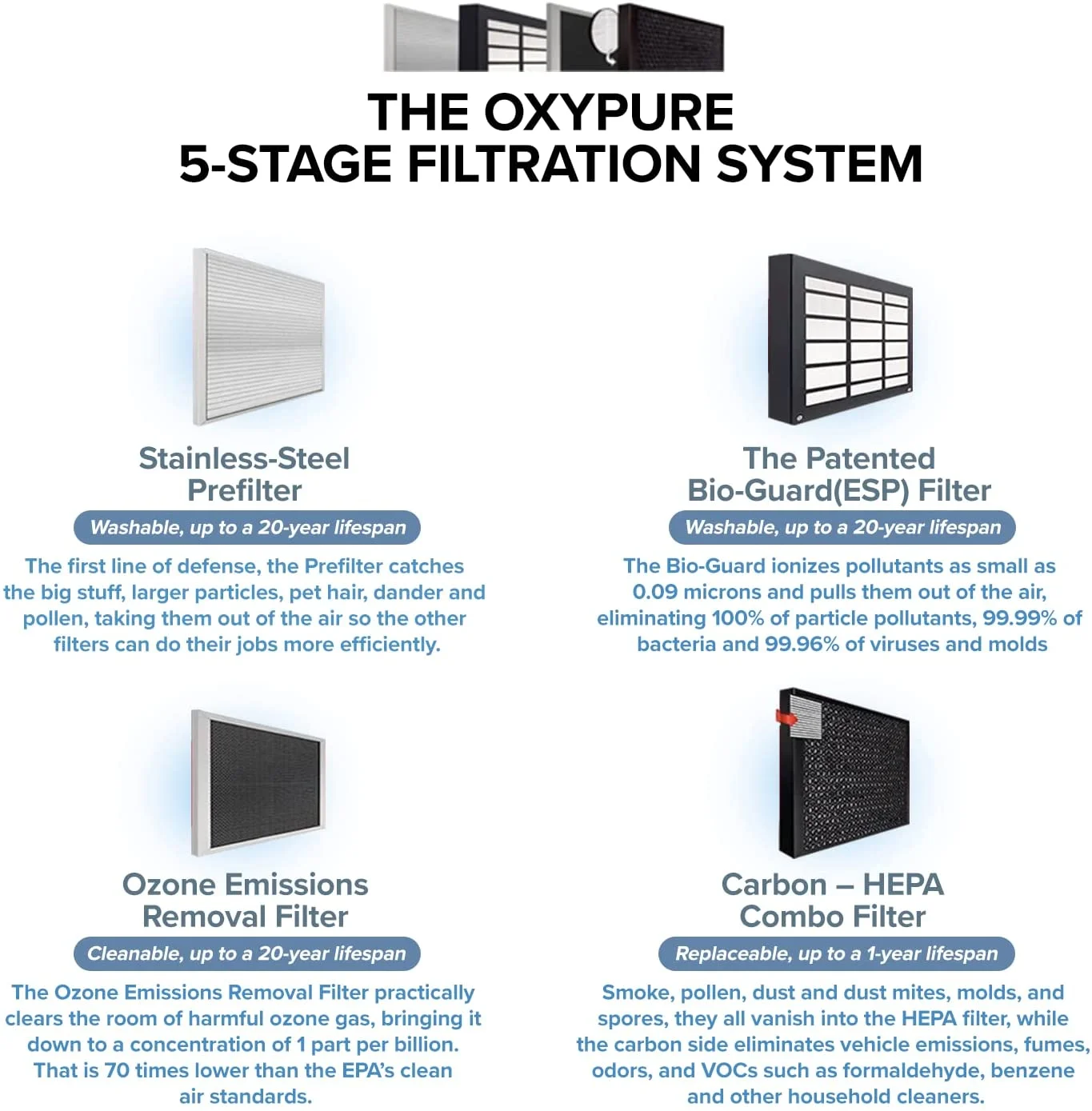 - ADVANCED AIR FILTRATION: The Nuwave OxyPure��s 5-Filter System includes a stainless-steel reusable Pre-Filter (lasts for 20 years), a Bio-Guard Filter (lasts for 20 years), and an Ozone Emission Removal Filter (lasts for 20 years) as well as a combination HEPA/ Carbon Filter that lasts up to 1 year.