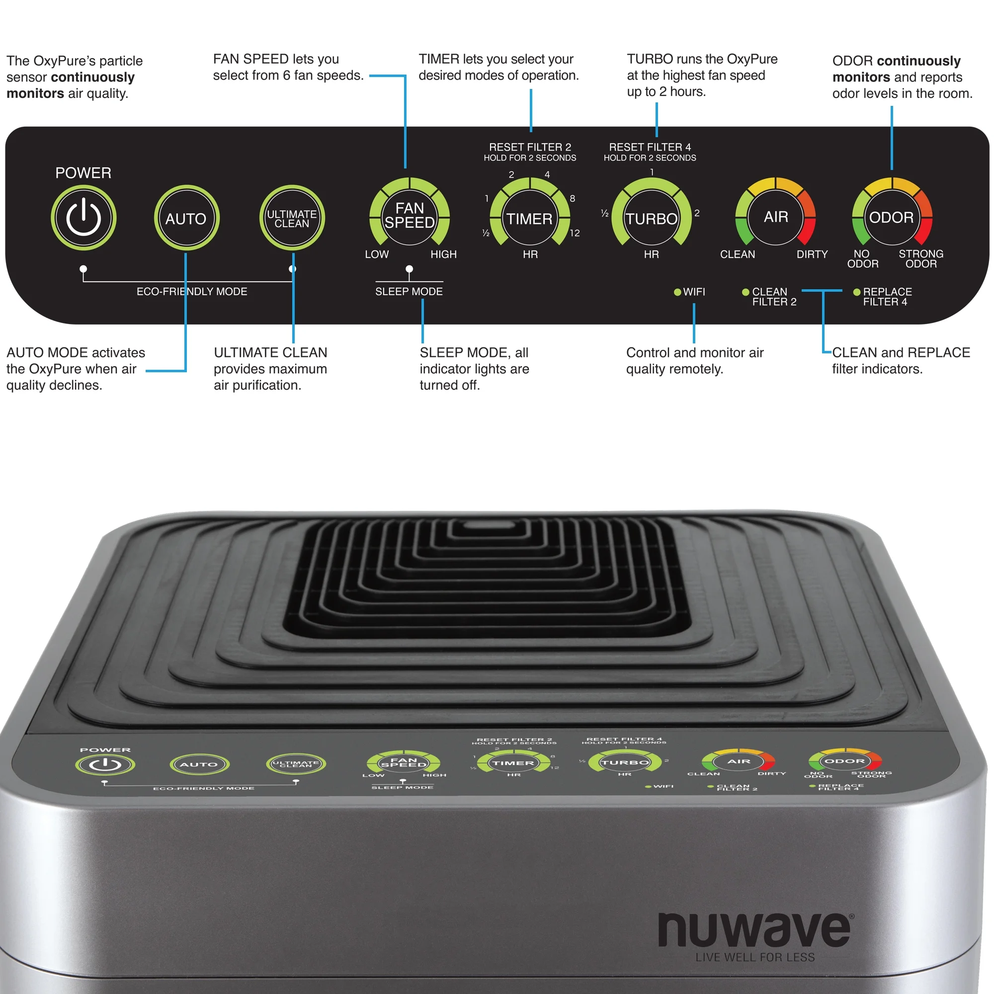 - SAVE MONEY & ENERGY: The Nuwave OxyPure is energy-efficient. Paired with the smart-touch controls and the auto-monitoring capabilities of the OxyPure, it adjusts its strength when it needs to. Included are long-lasting, reusable filters, so costly filter replacement filters are not needed. Once the Oxypure detects poor air quality, it automatically goes to the highest fan level until the air improves.