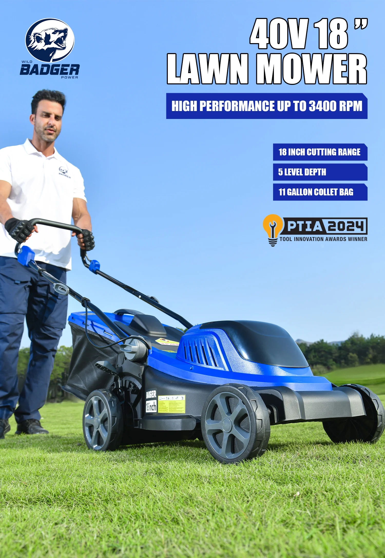 WILD BADGER POWER 18" Brushless Cordless Lawn Mower, 40V, for 6, 500�?0, 000 Sq Ft Yards, 5 Cutting Heights, Large Grass Bag, Quick - Fold Storage, Battery & Charger Included