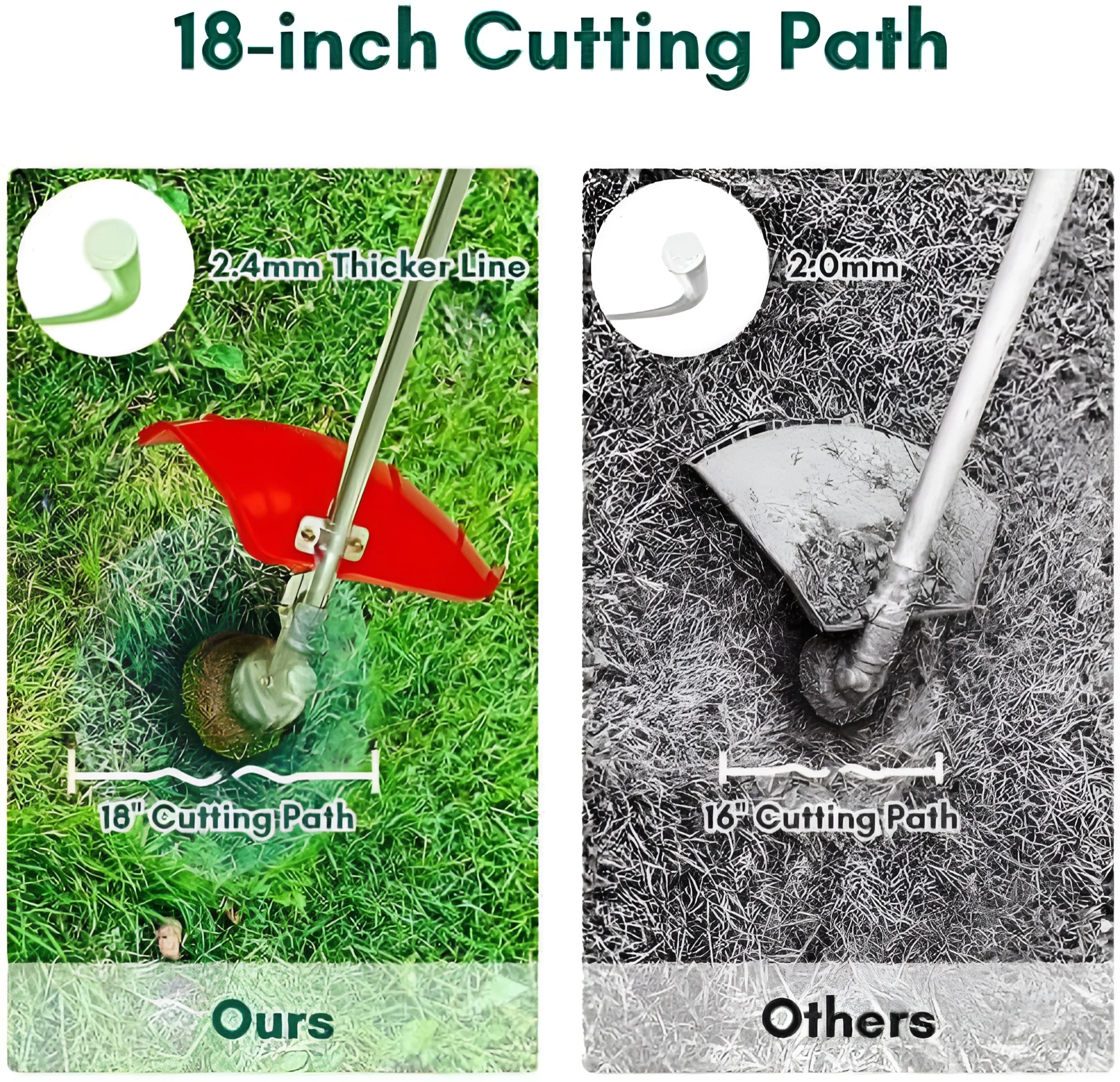 - �?8''Cutting Path & 2.4mm Thicker Line】:Maxtra weed wacker has a 18'' Cutting Path to cover more ground in less time, it makes lawn work simpler and more efficient. And the 2.4mm rigid twisted-nylon line doesn’t get bogged down by weeds or heavy grass.