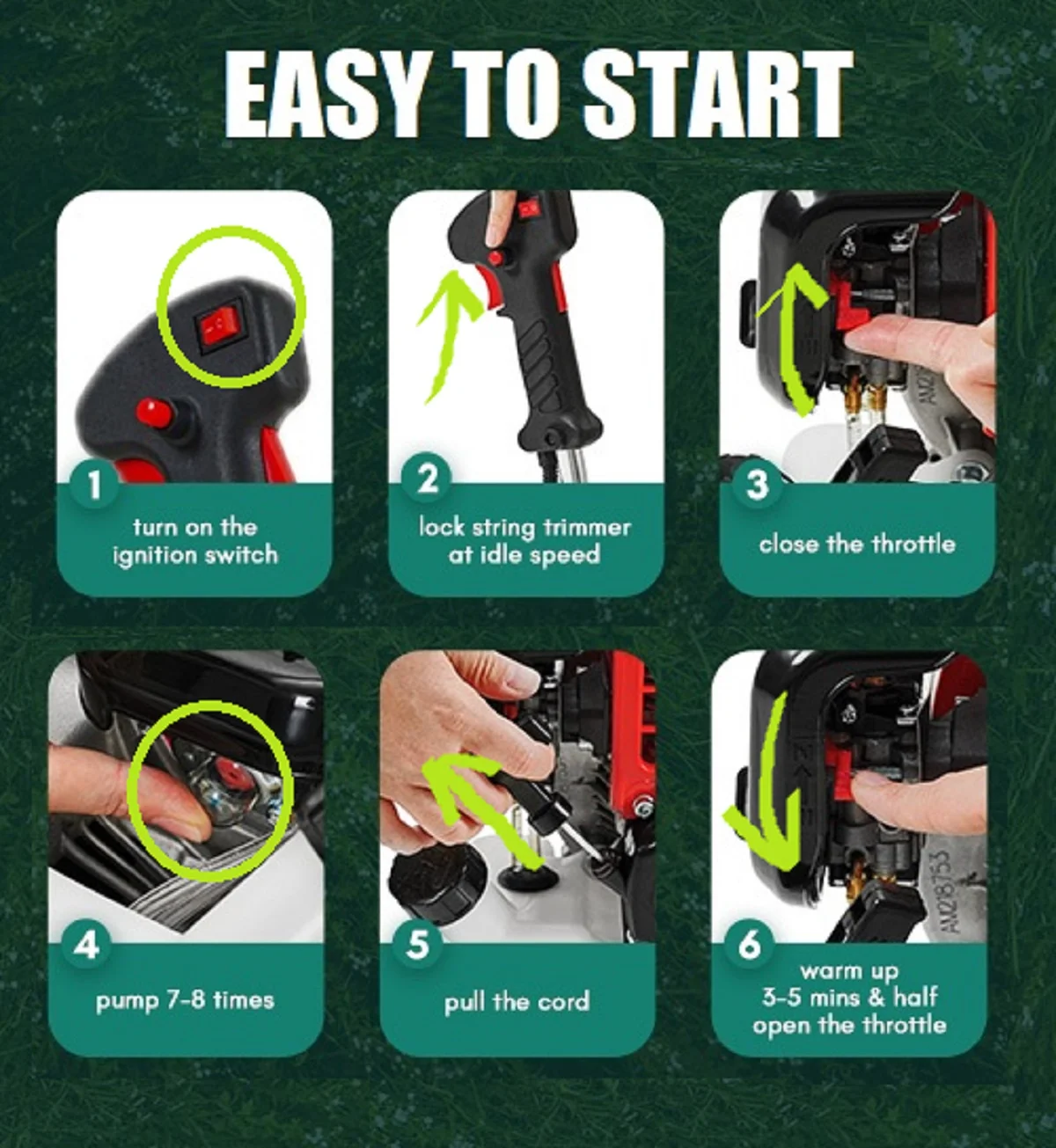 - �?2.7cc Powerful Engine & Easy Start】:42.7cc 2-cycle cordless string trimmer has more power than smaller motors, it will help you finish the yard work much more quickly. Our upgraded Quick-Start system makes the starting much easier. It starts at once for both cold and warm start