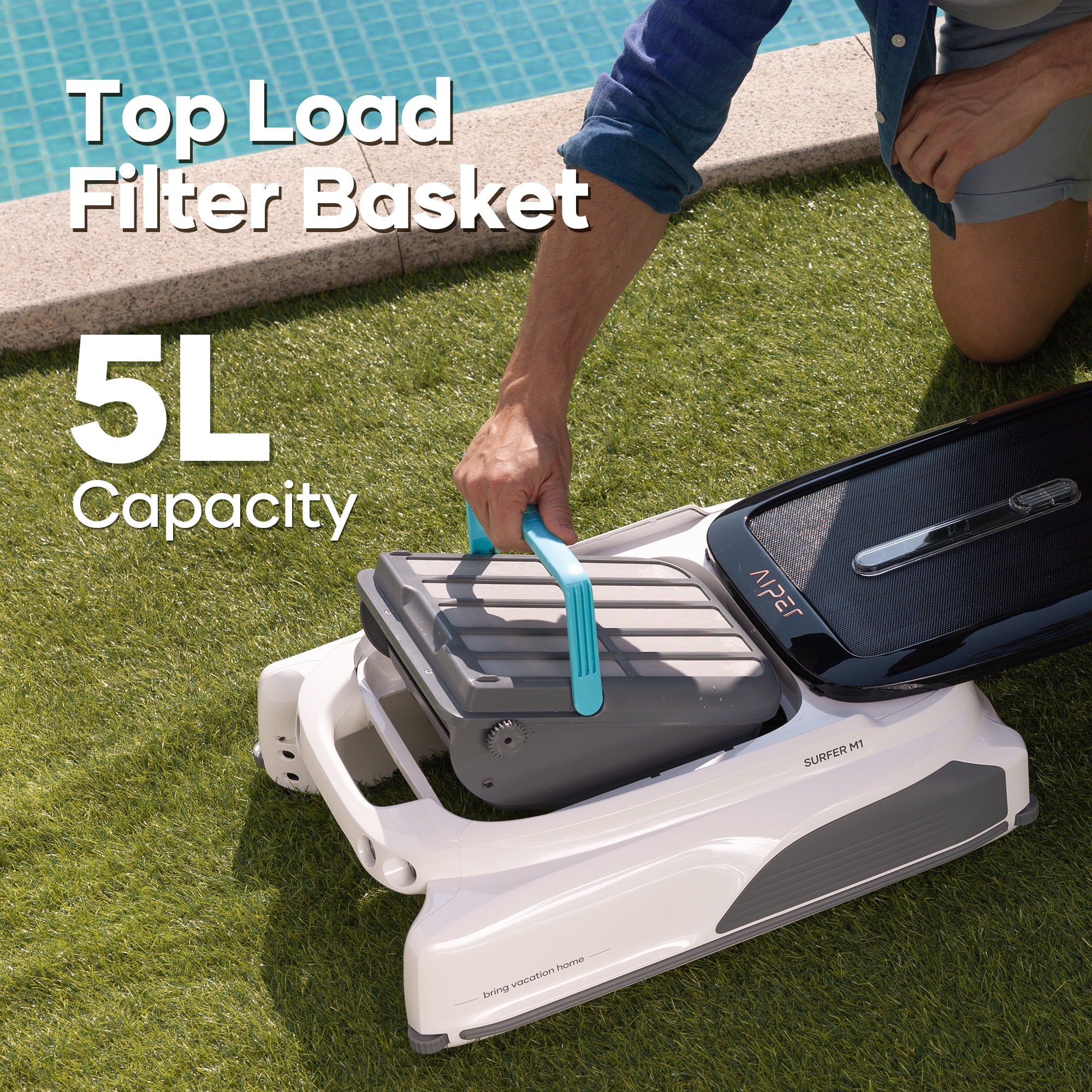 - ��Effortless Debris Collection��- Surfer M1 guarantees comprehensive cleaning with paddle wheel design and a 5L top-load filter basket, ensuring no debris escape its efficient brushless motors, cleaner pools in less time.