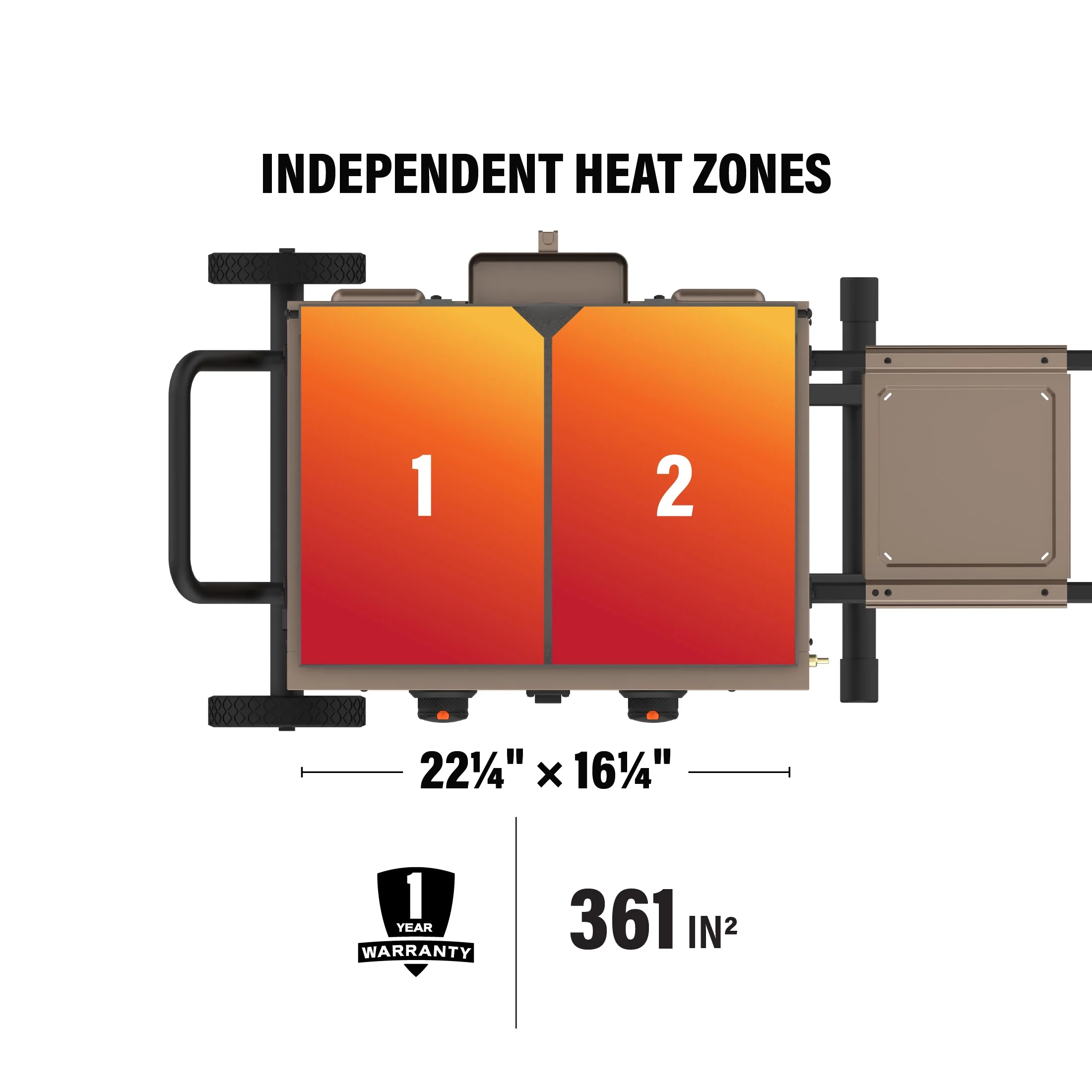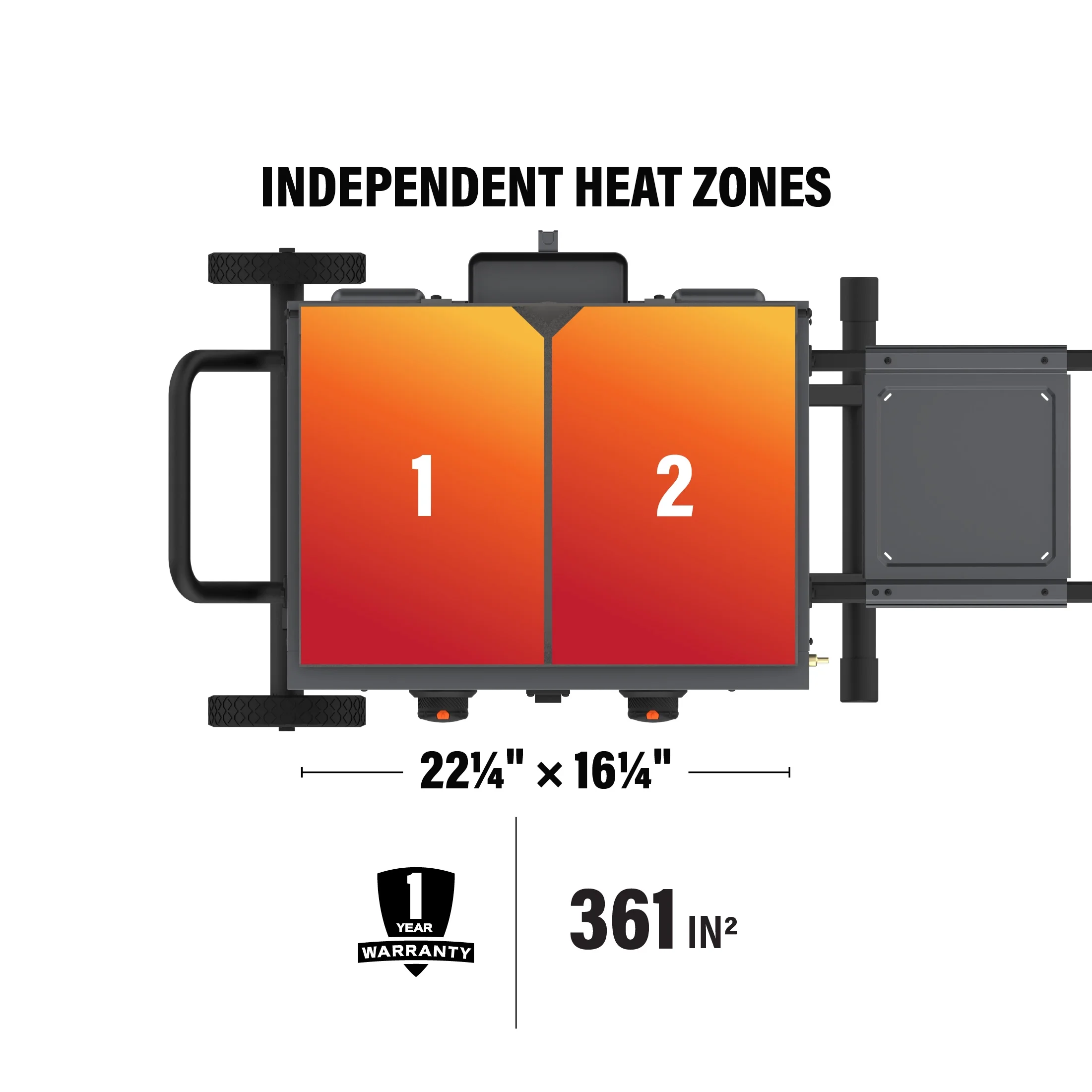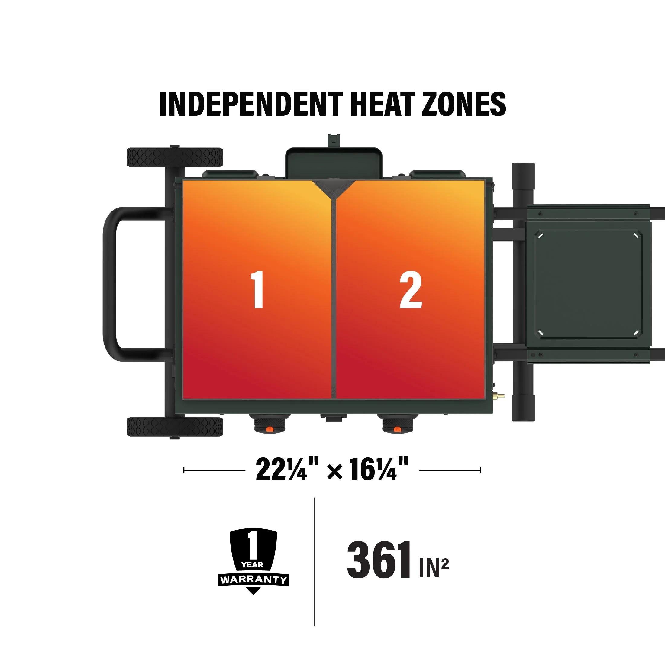 Flexfold leg design for easy transportation and more compact storage - 361 square inches of cooking space with two independently controlled heat zones