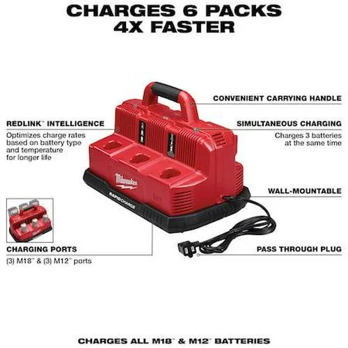 Battery Charger, Number of Ports 6, Charging Port Voltage (3) 12V, (3) 18V, Charger Input Voltage 120V, Charger Class Rapid, Charging Type Simultaneous, For Battery Chemistry Li-ion, Indicator Light Yes, Plug Type Two-Prong, For Use With Milwaukee(R) M12(TM) and M18(TM) BatteriesMilwaukee Tool M18 and M12 Rapid Charge Station