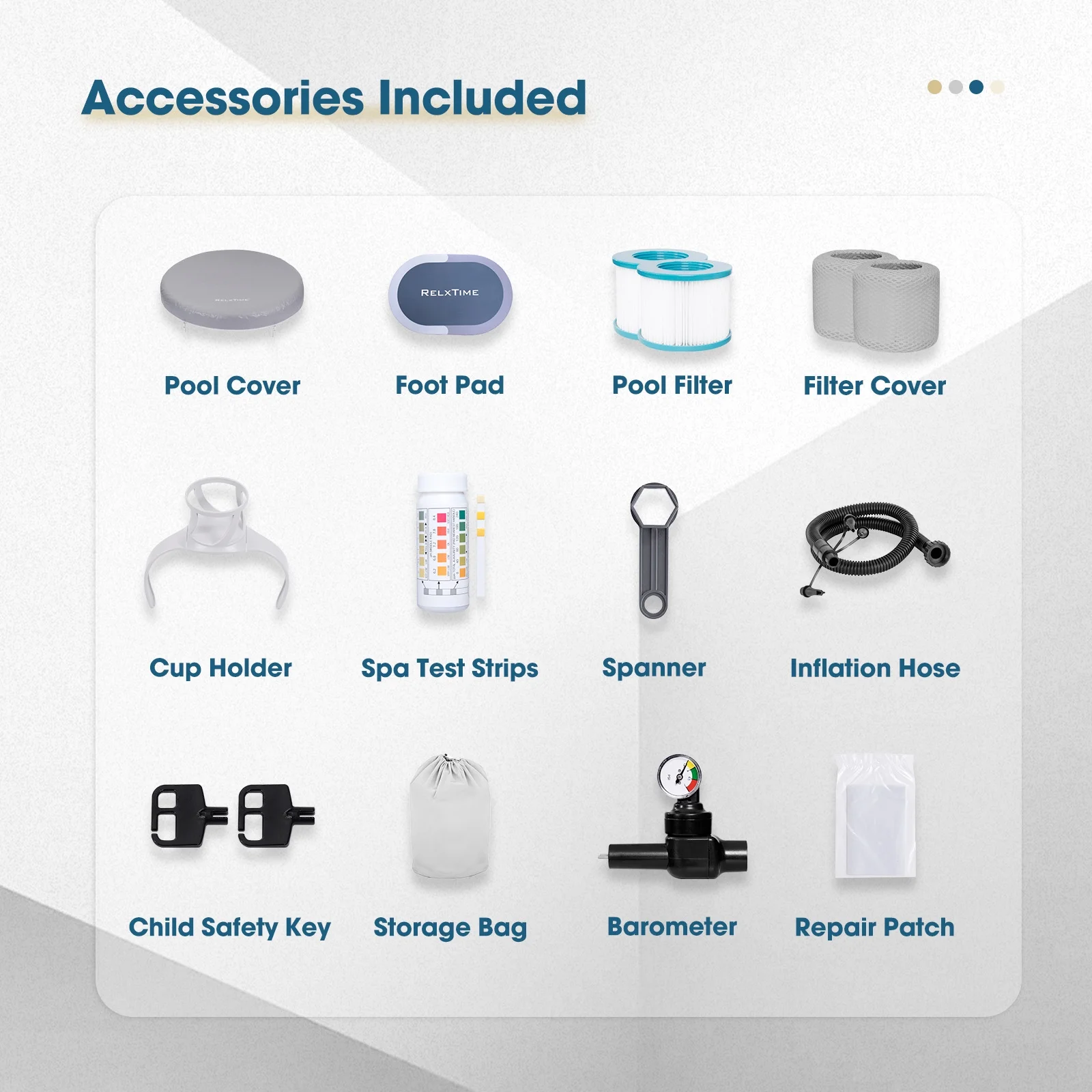 - Comes with a pool cover, 4 fixed seat cushions, 2 filter cartridges, and various accessories for a complete setup