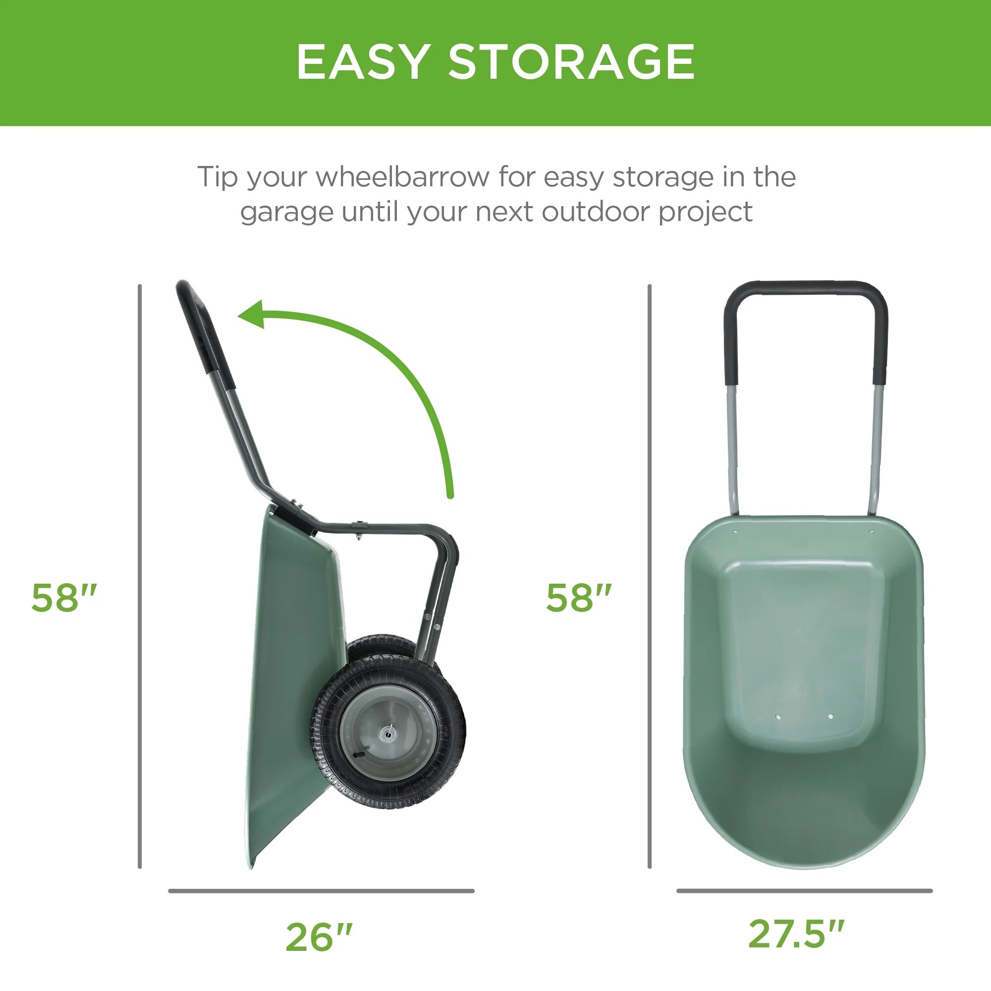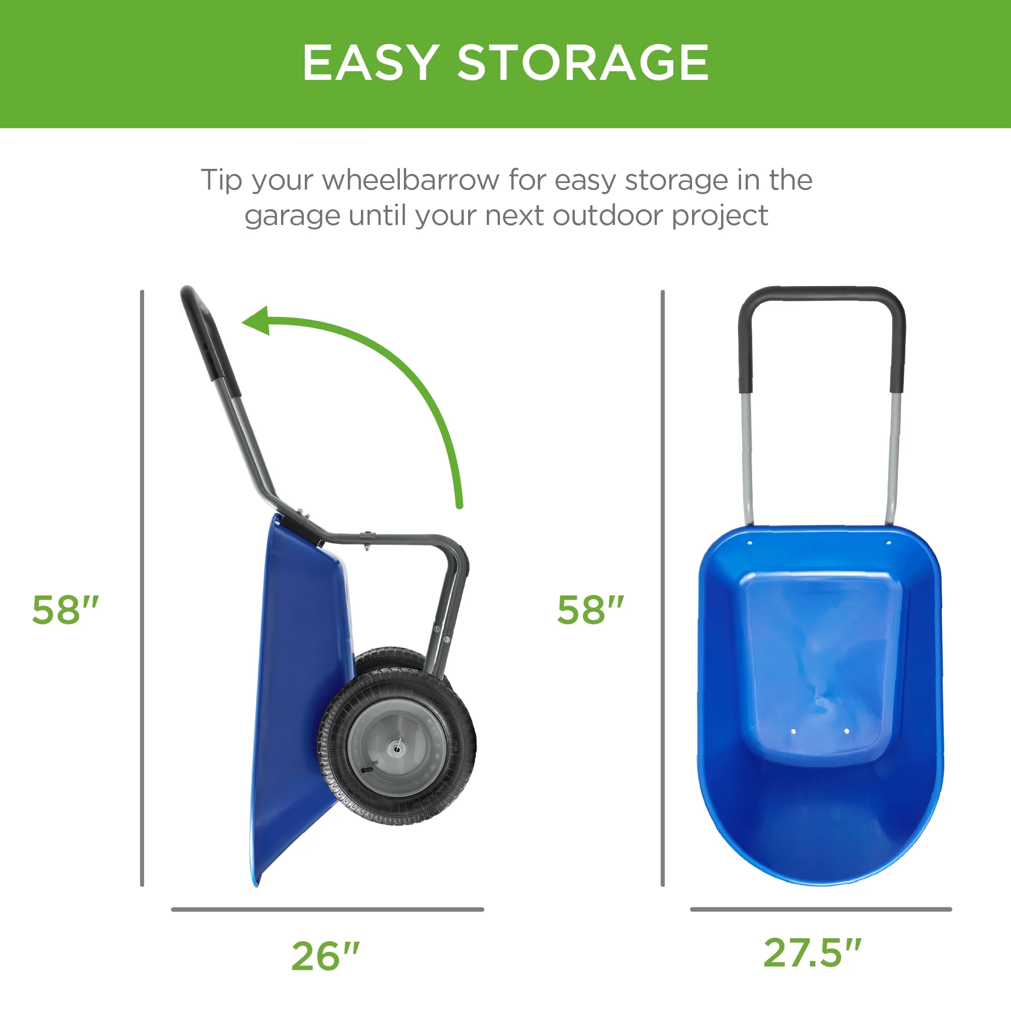 - EASY STORAGE: A compact profile combined with easy tipping action allows you to seamlessly store this wheelbarrow upright in your garage or garden shed; OVERALL DIMENSIONS: 58"(L) x 27.5"(W) x 26"(H); Weight Capacity: 330 lbs.