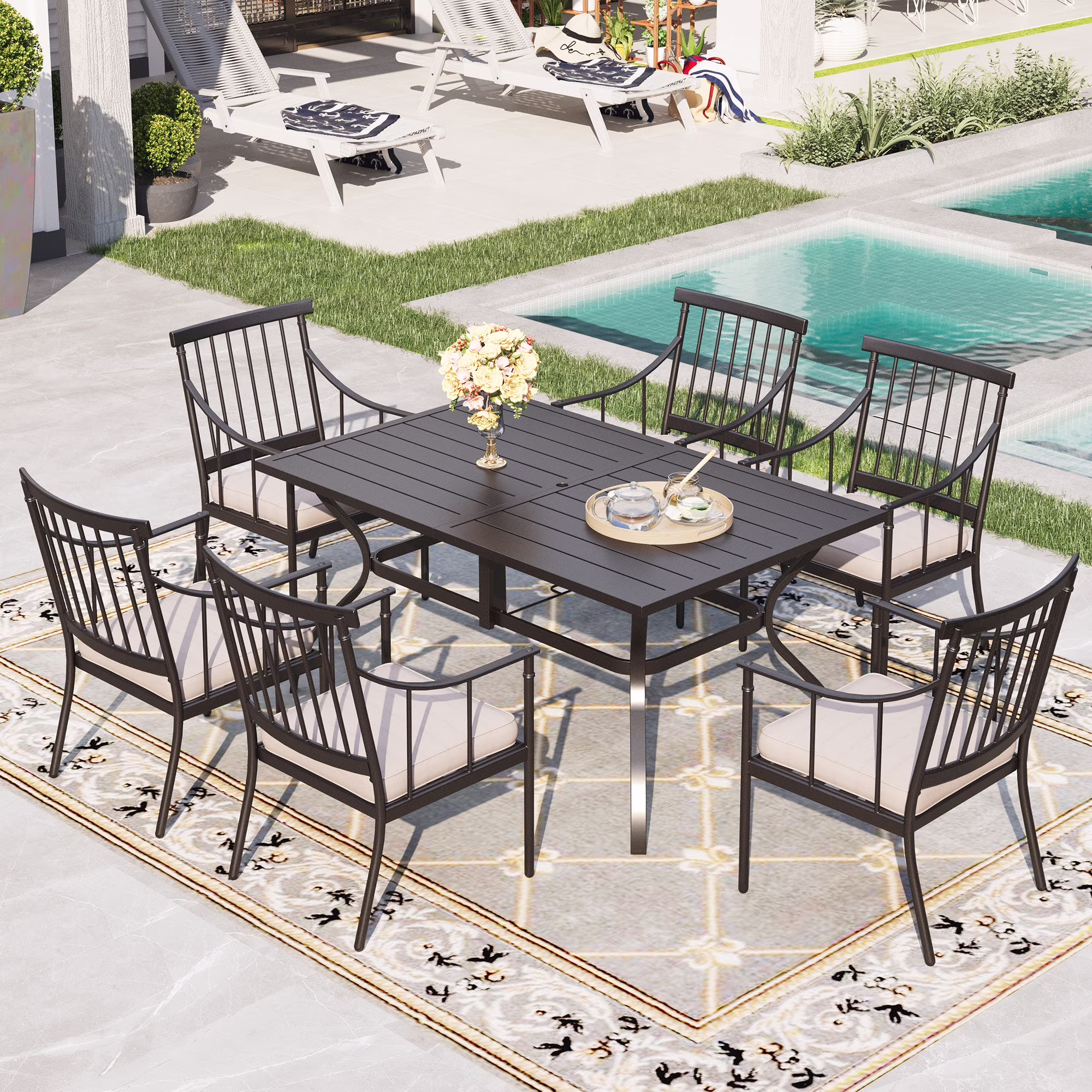 Sophia&William patio dining sets are made of high quality material, providing with all weather and rust resistant excellently. Besides elegent disign and various set collocations would meet all your needs and decorate your house greatly.