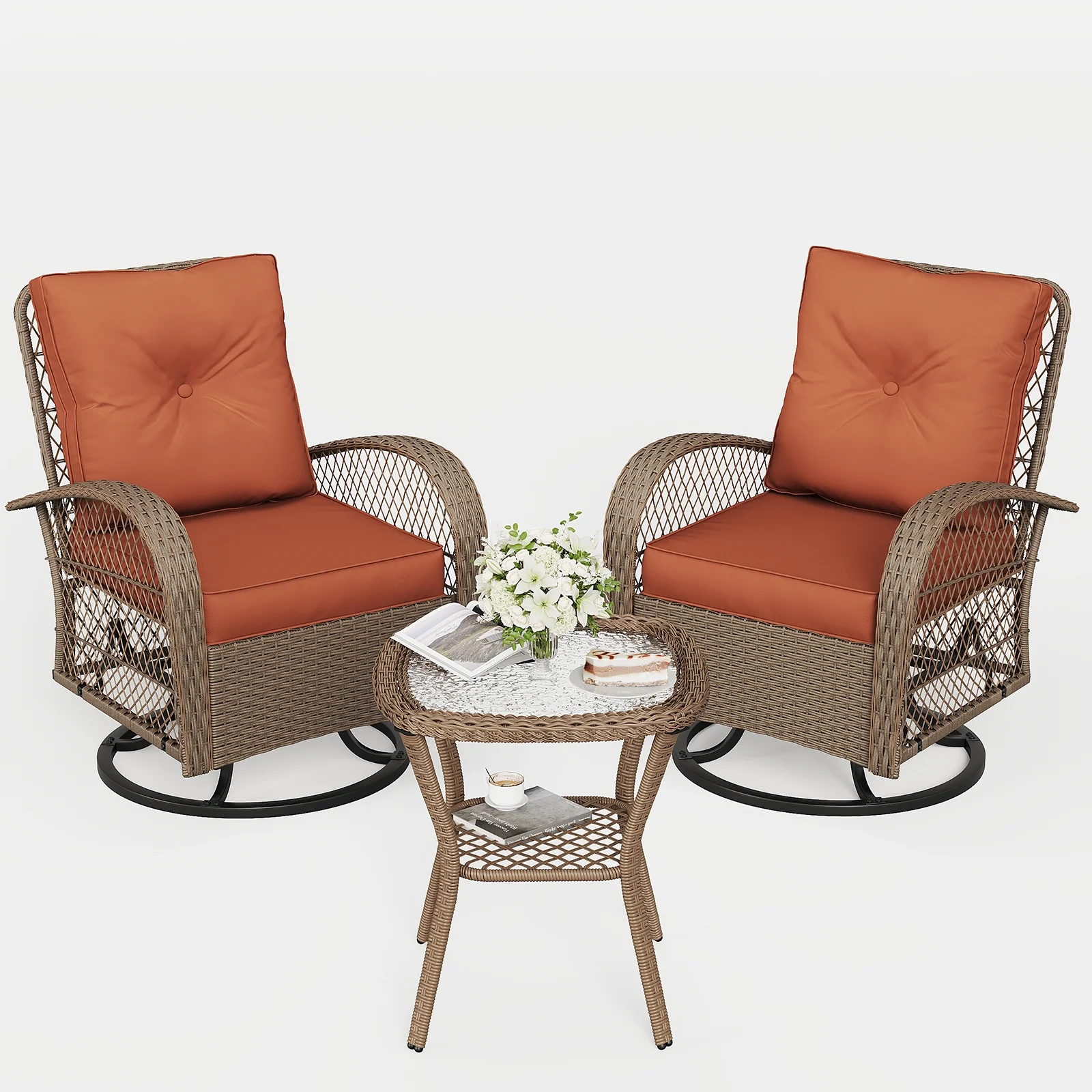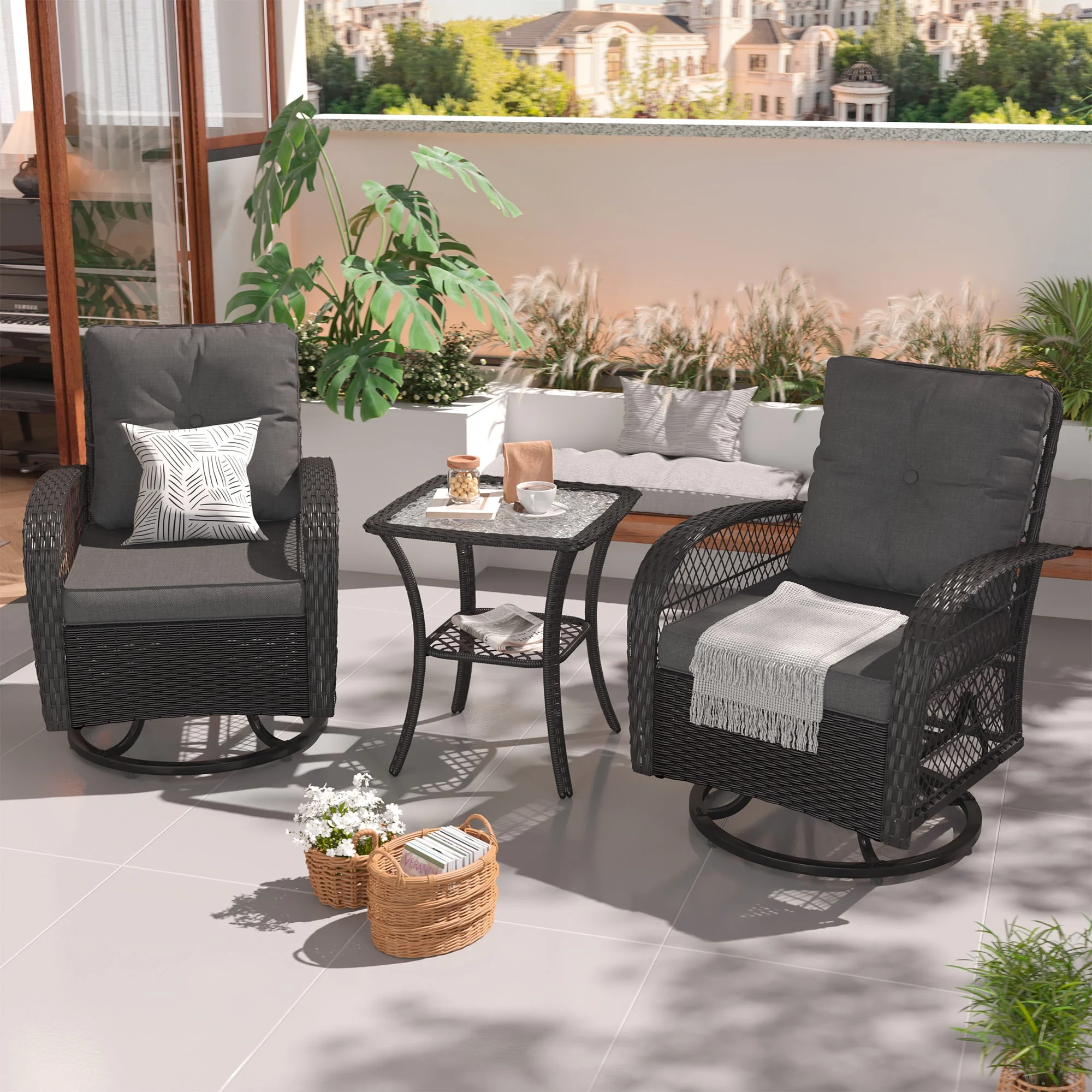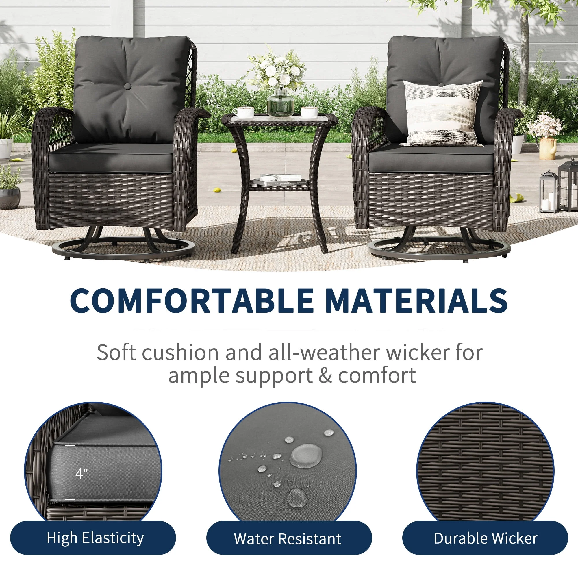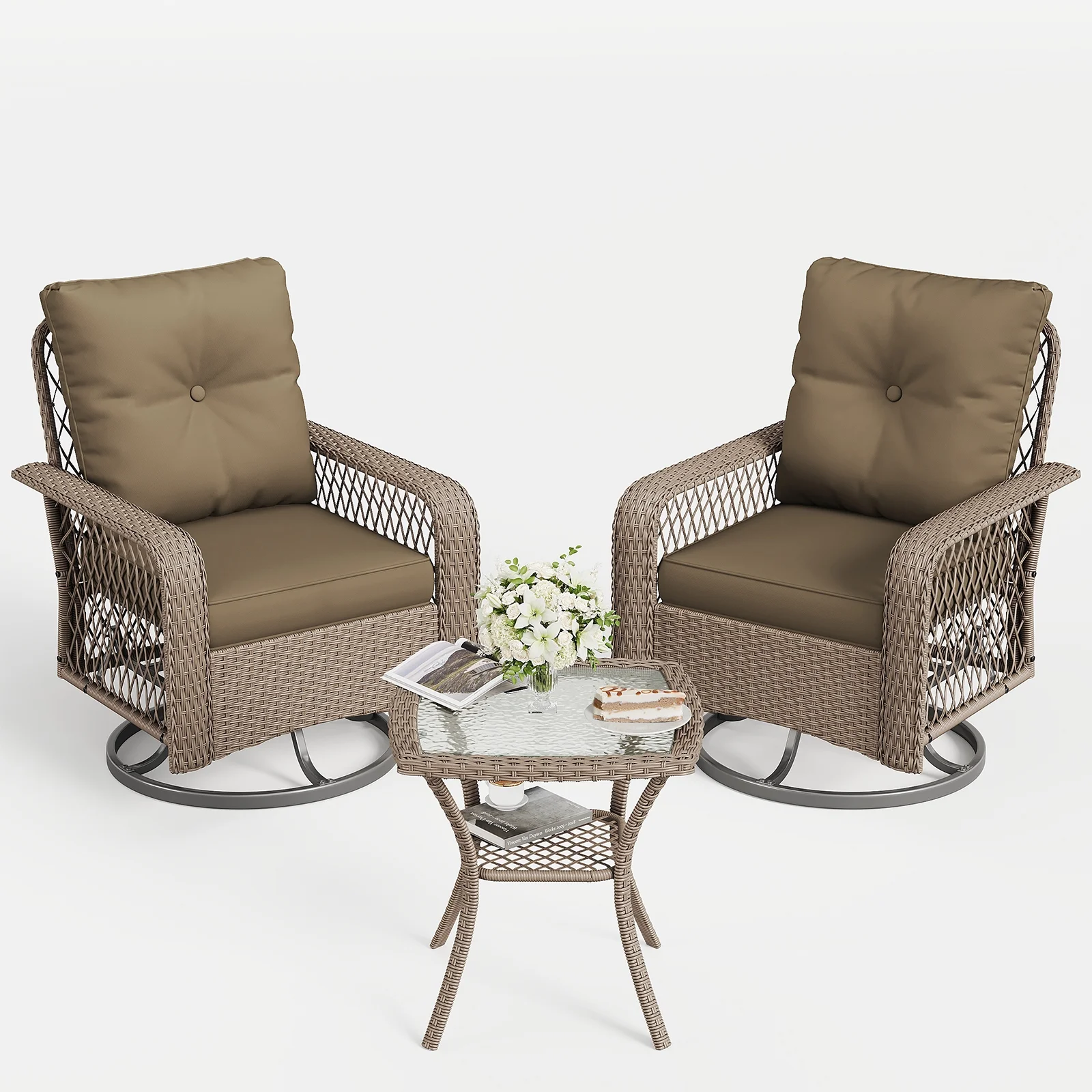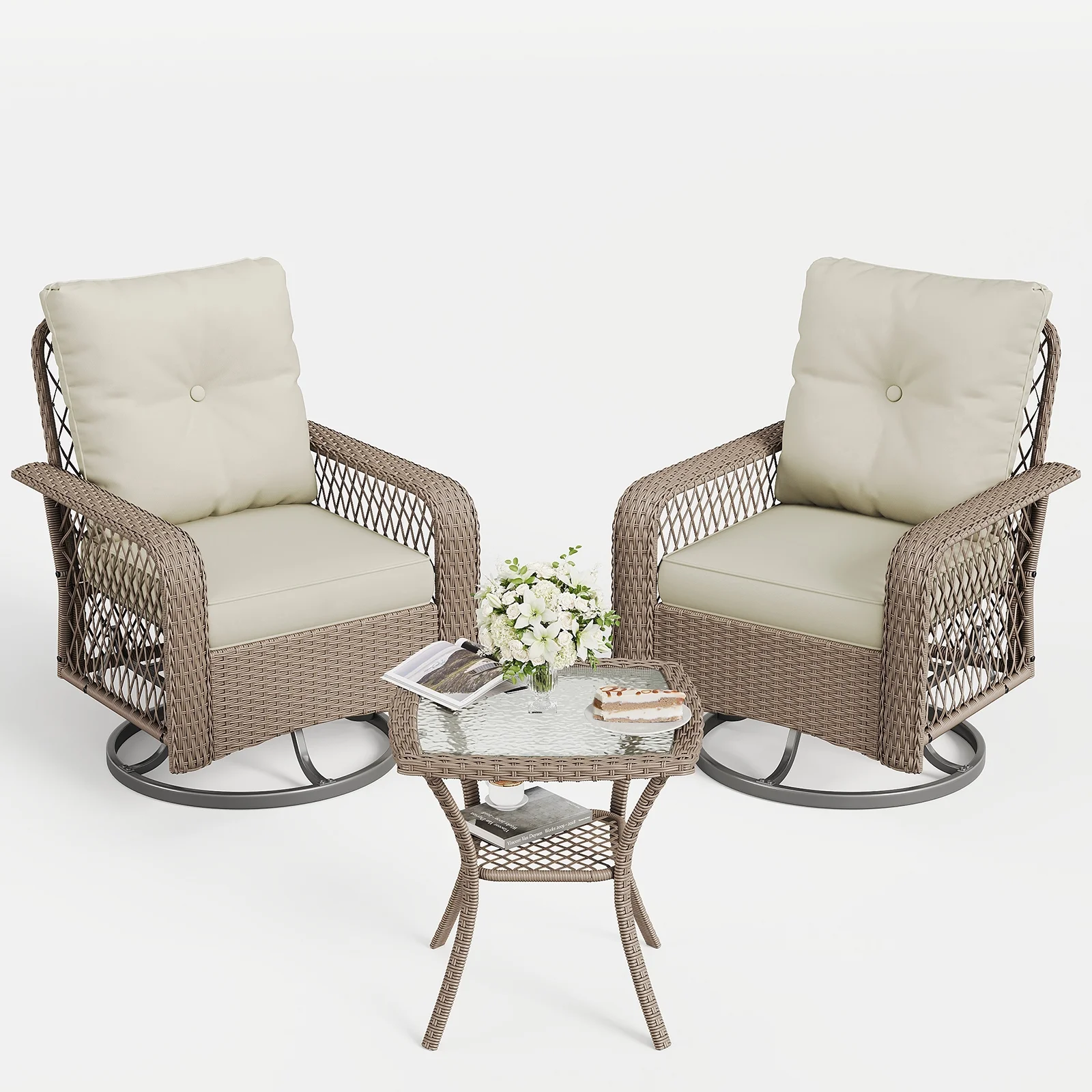 ELPOSUN 3 Pieces Patio Furniture Set, Outdoor Swivel Gliders Rocker, Wicker Patio Bistro Set with Rattan Rocking Chair, Glass Top Side Table and Thickened Cushions for Porch Deck Backyard