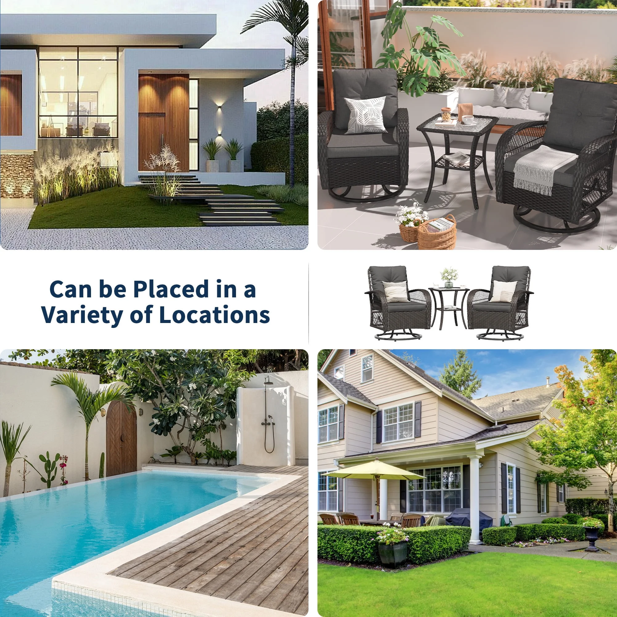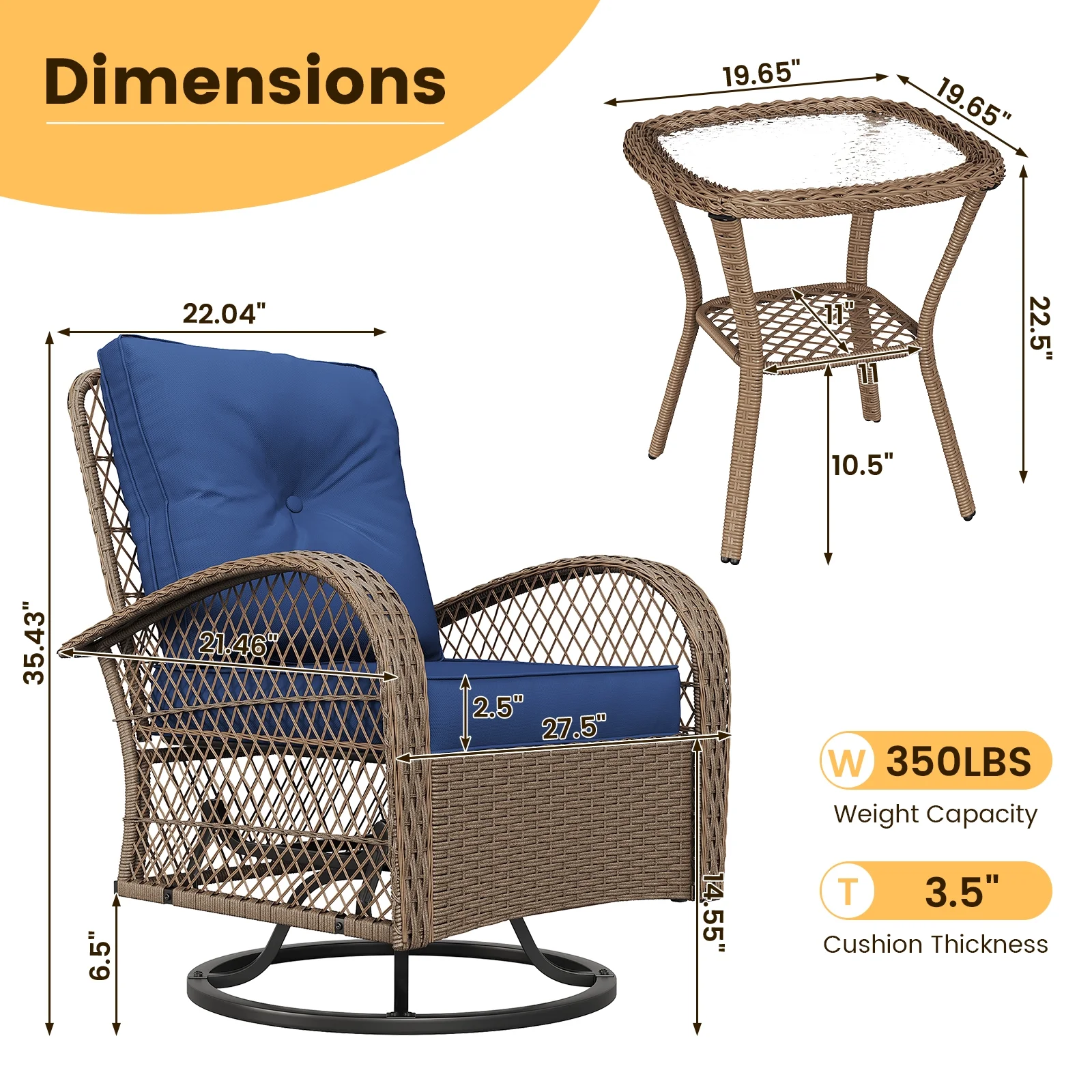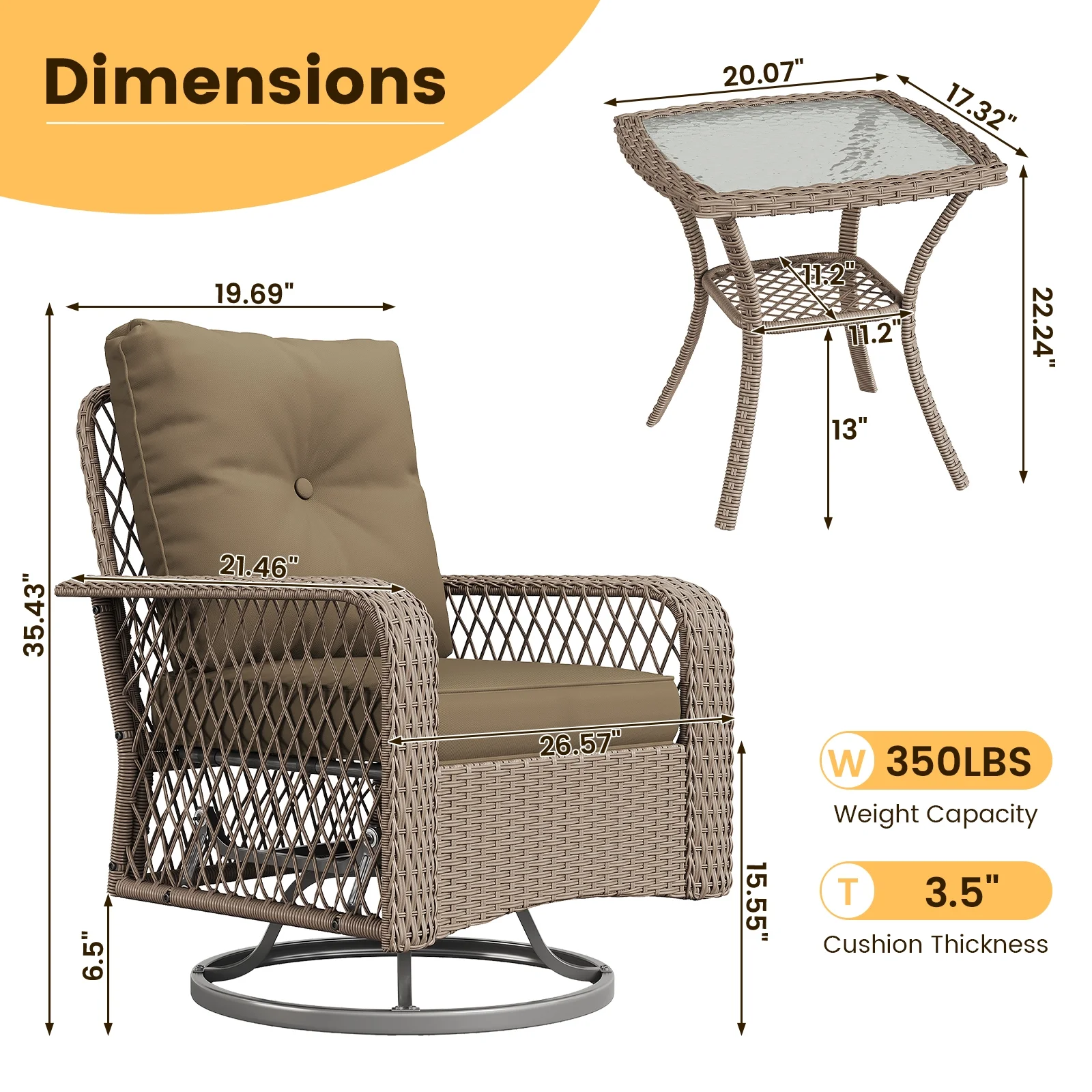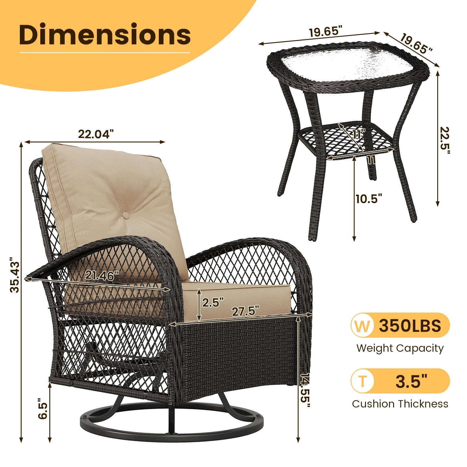 ELPOSUN 3 Pieces Patio Furniture Set, Outdoor Swivel Gliders Rocker, Wicker Patio Bistro Set with Rattan Rocking Chair, Glass Top Side Table and Thickened Cushions for Porch Deck Backyard