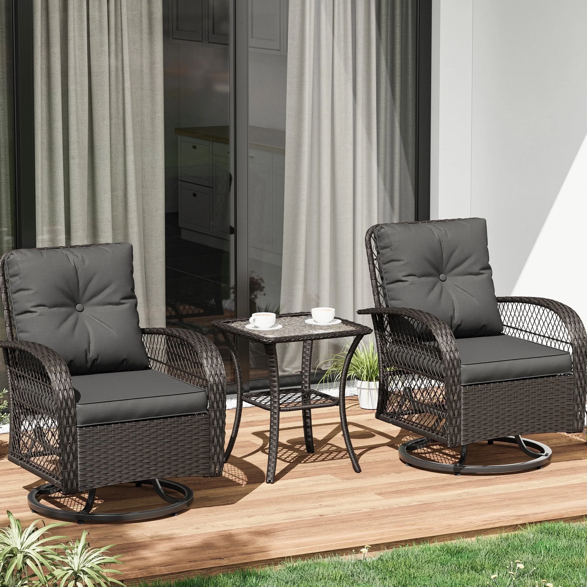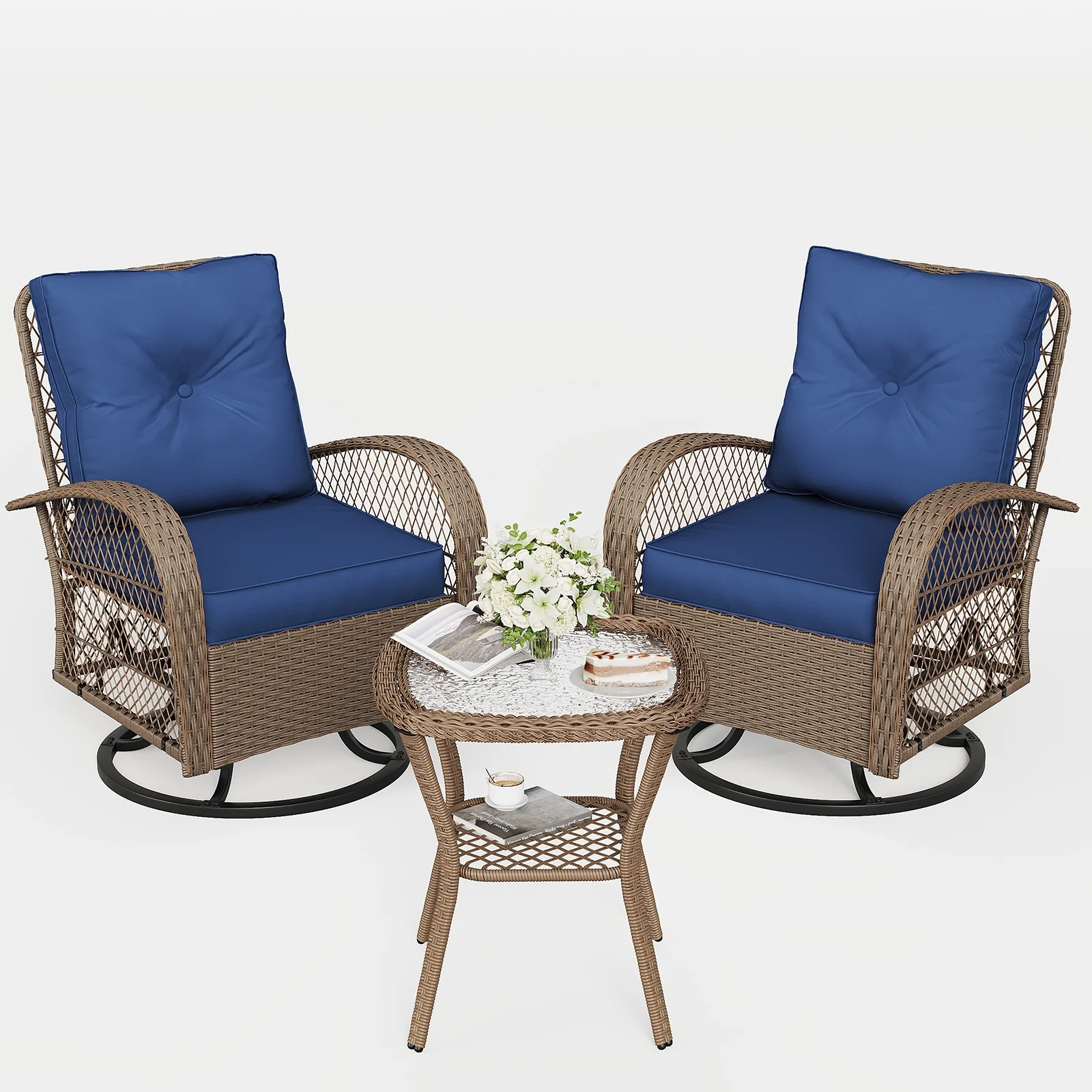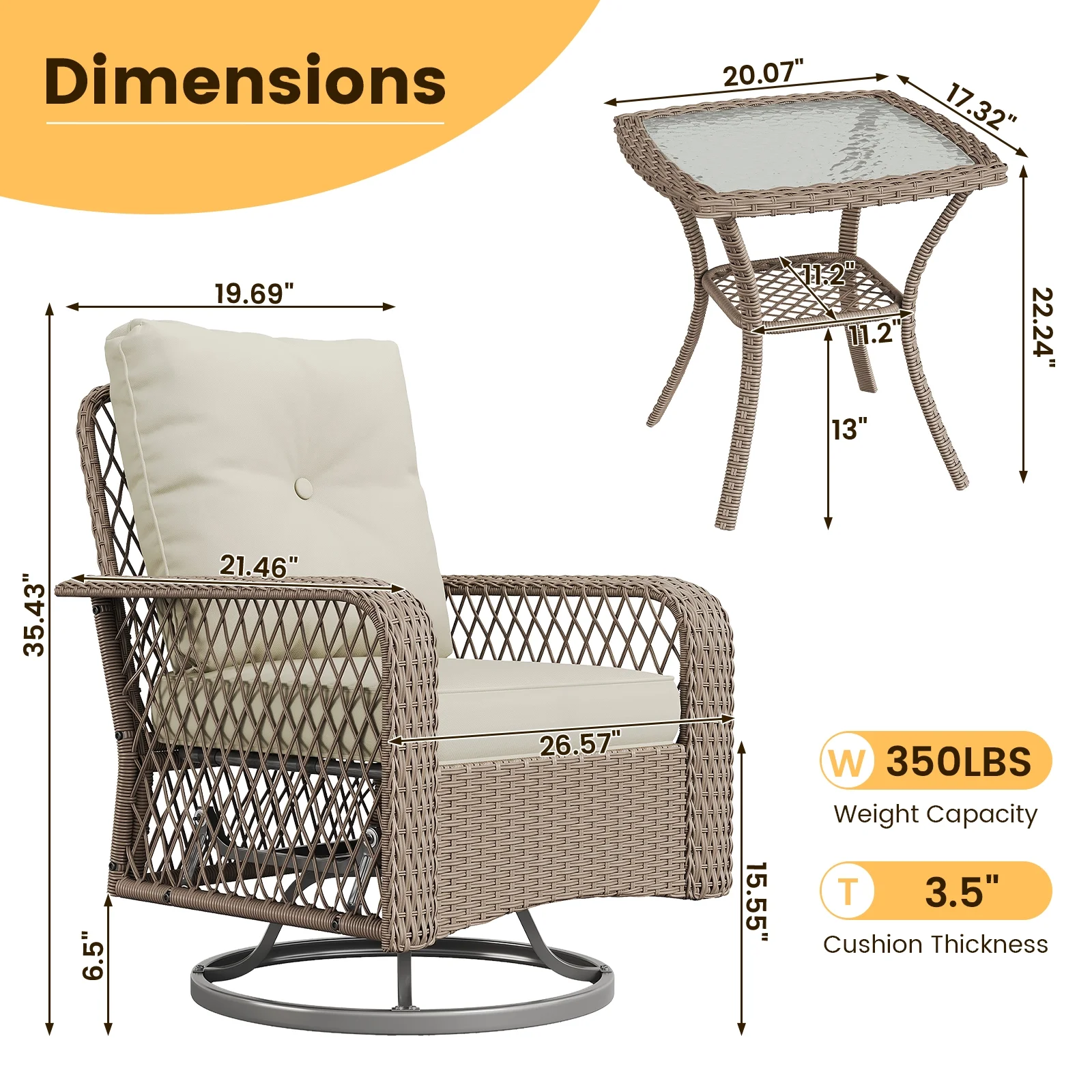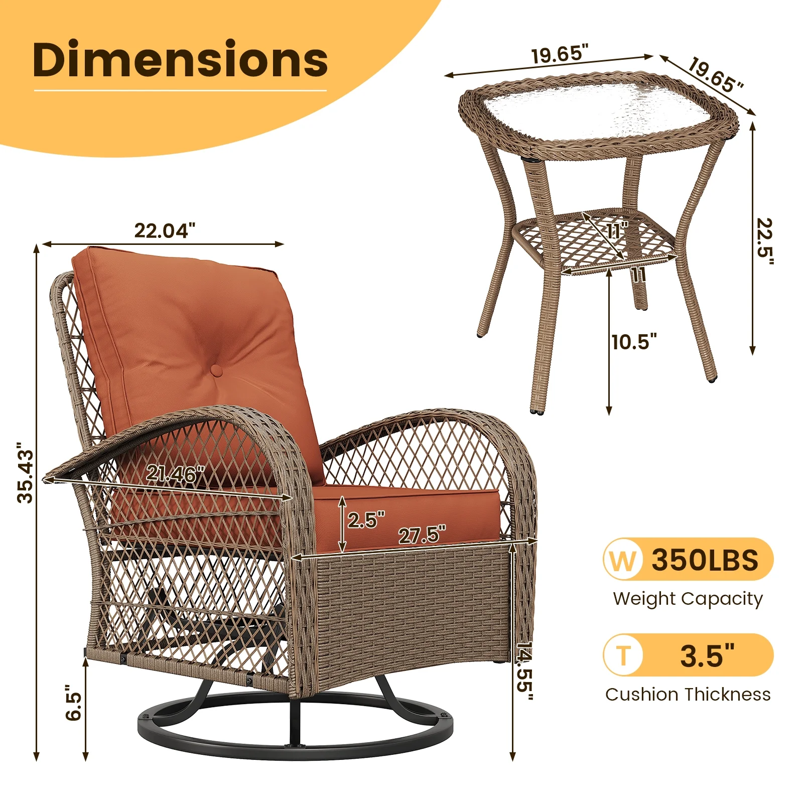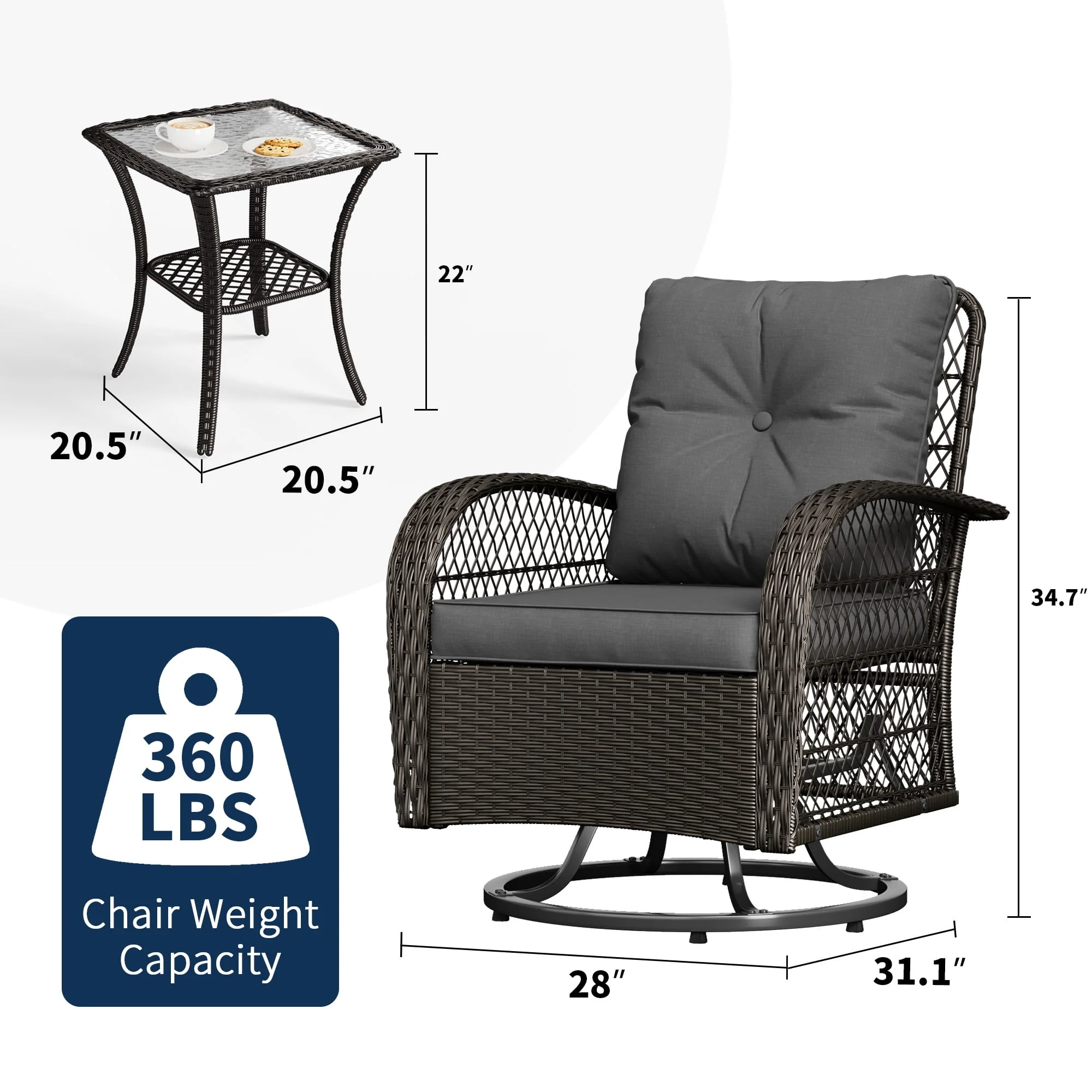 ELPOSUN 3 Pieces Patio Furniture Set, Outdoor Swivel Gliders Rocker, Wicker Patio Bistro Set with Rattan Rocking Chair, Glass Top Side Table and Thickened Cushions for Porch Deck Backyard