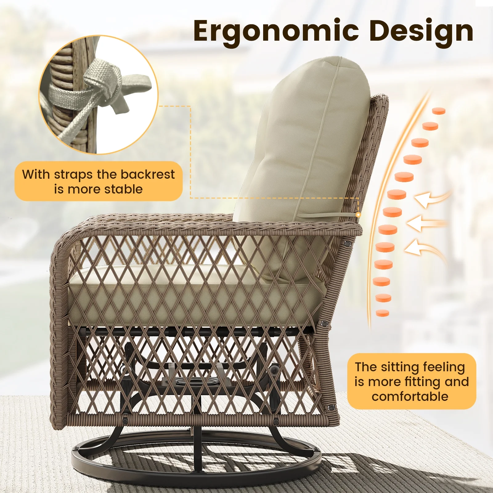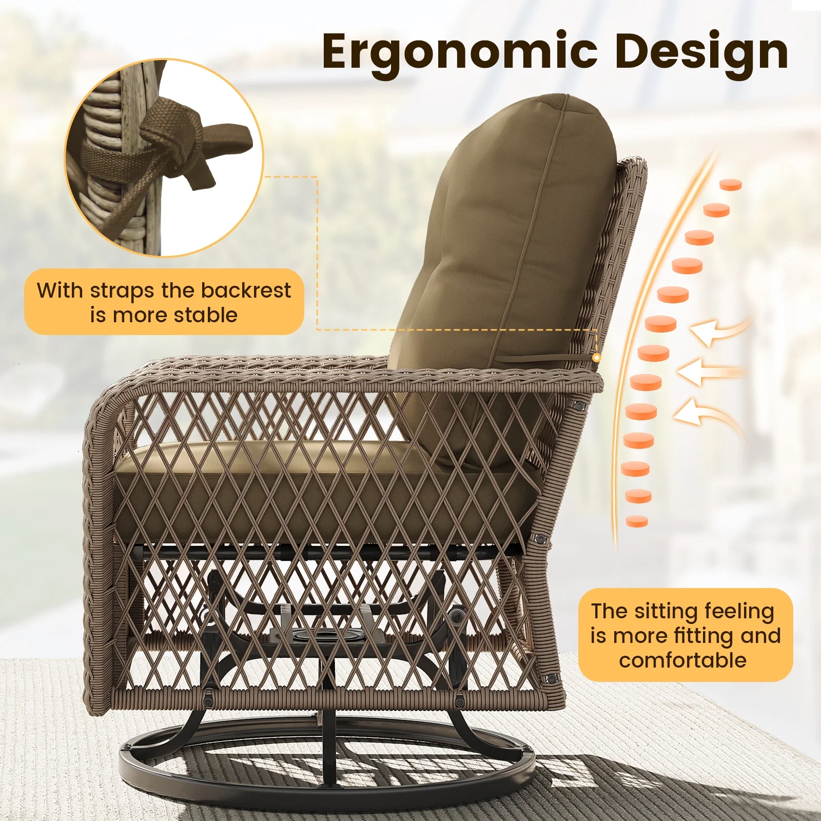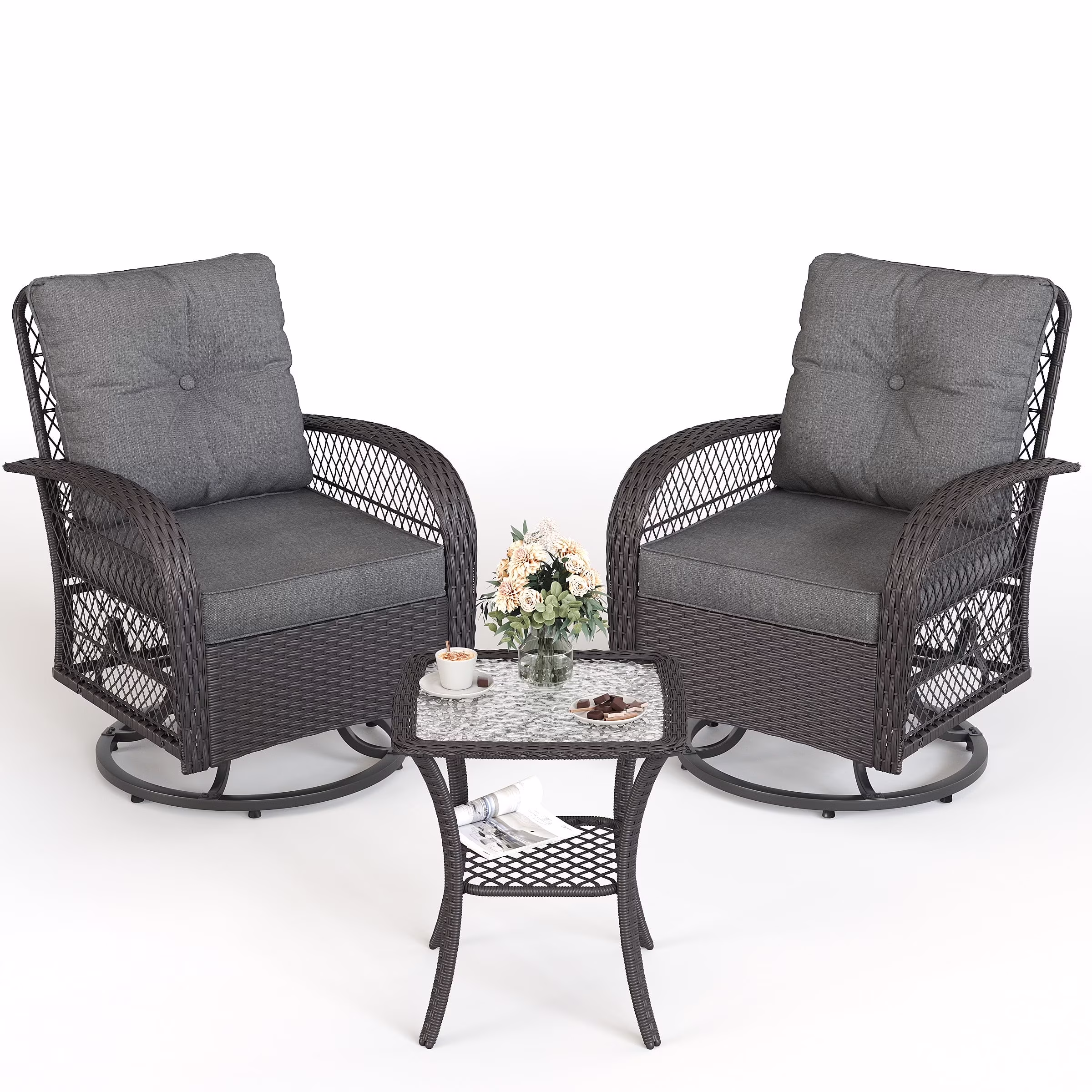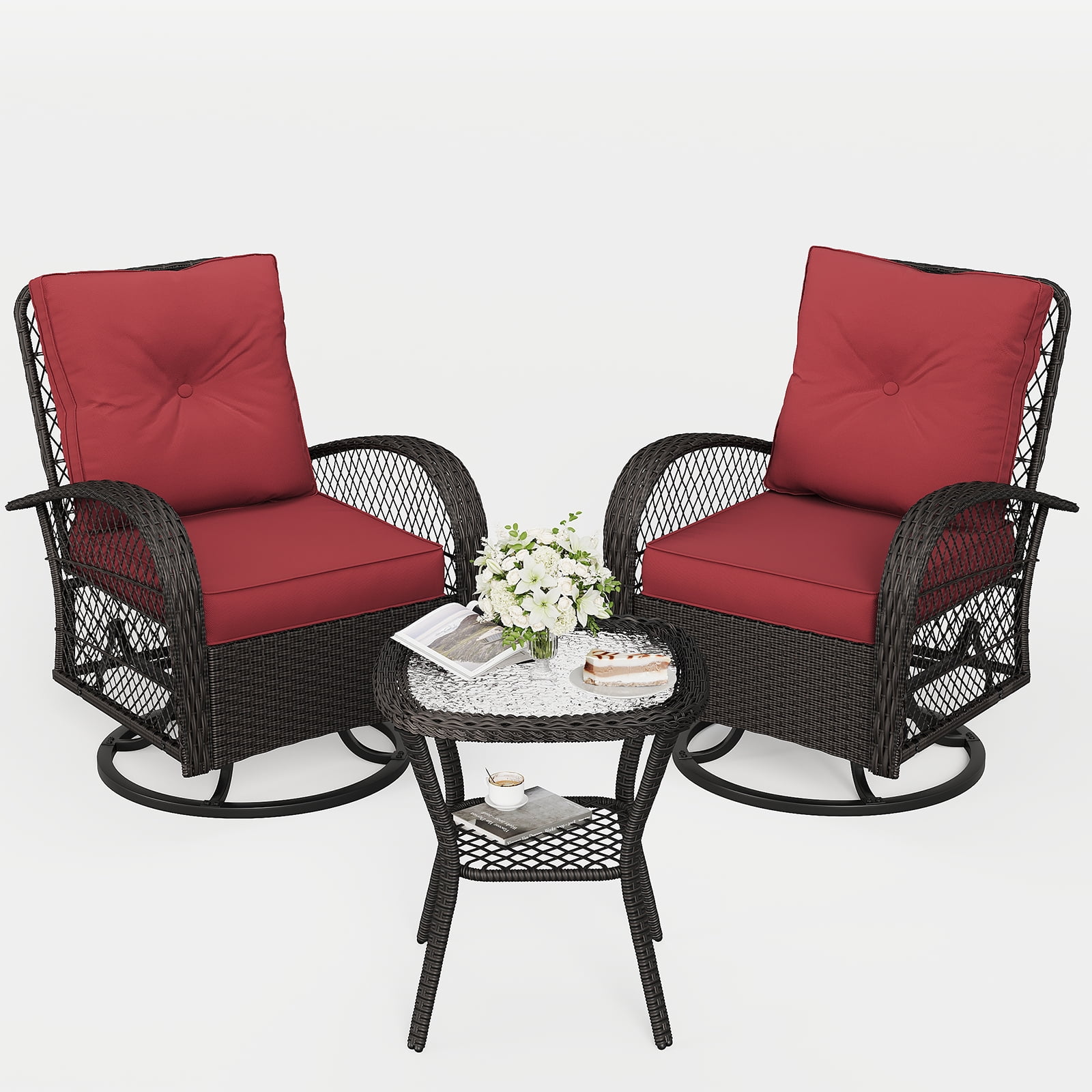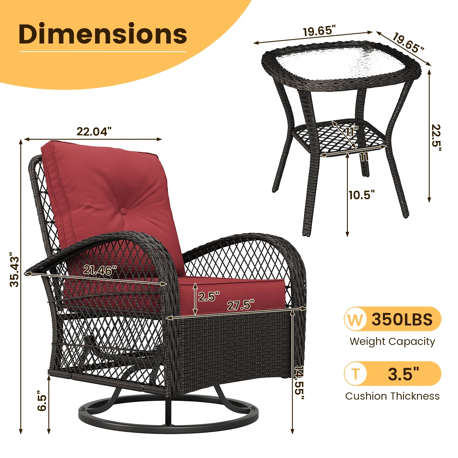 ELPOSUN 3 Pieces Patio Furniture Set, Outdoor Swivel Gliders Rocker, Wicker Patio Bistro Set with Rattan Rocking Chair, Glass Top Side Table and Thickened Cushions for Porch Deck Backyard
