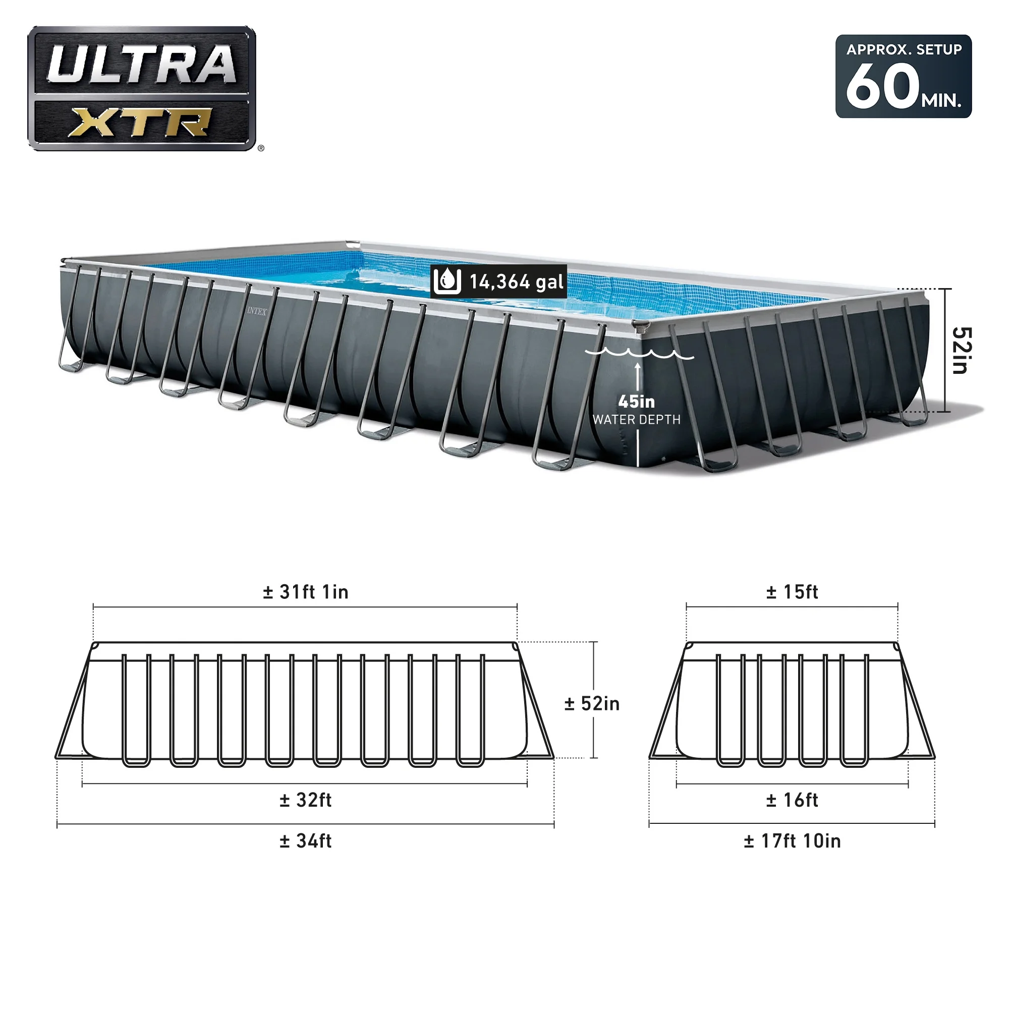 - Dimensions (L x W x D): 32 x 16 x 4.3 feet