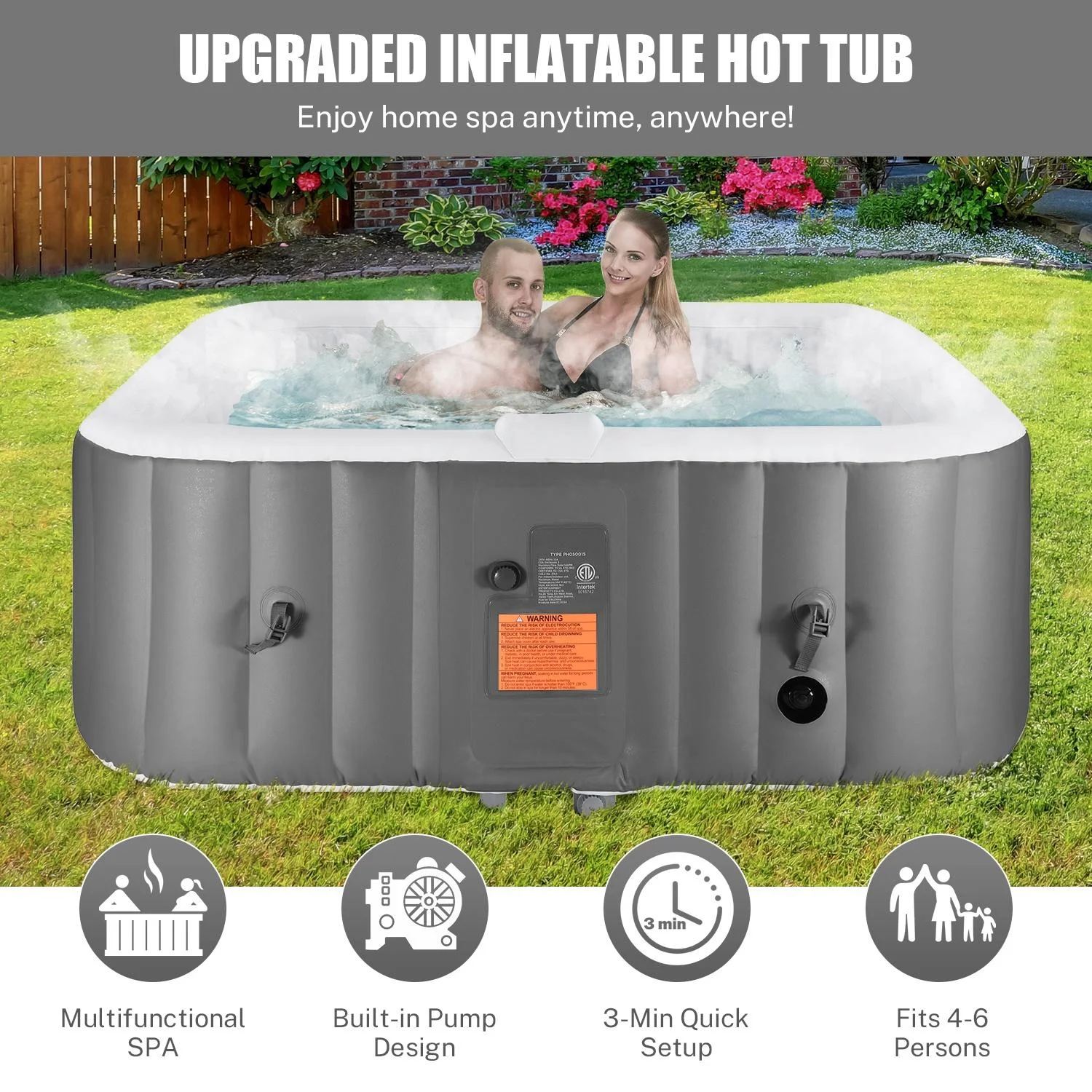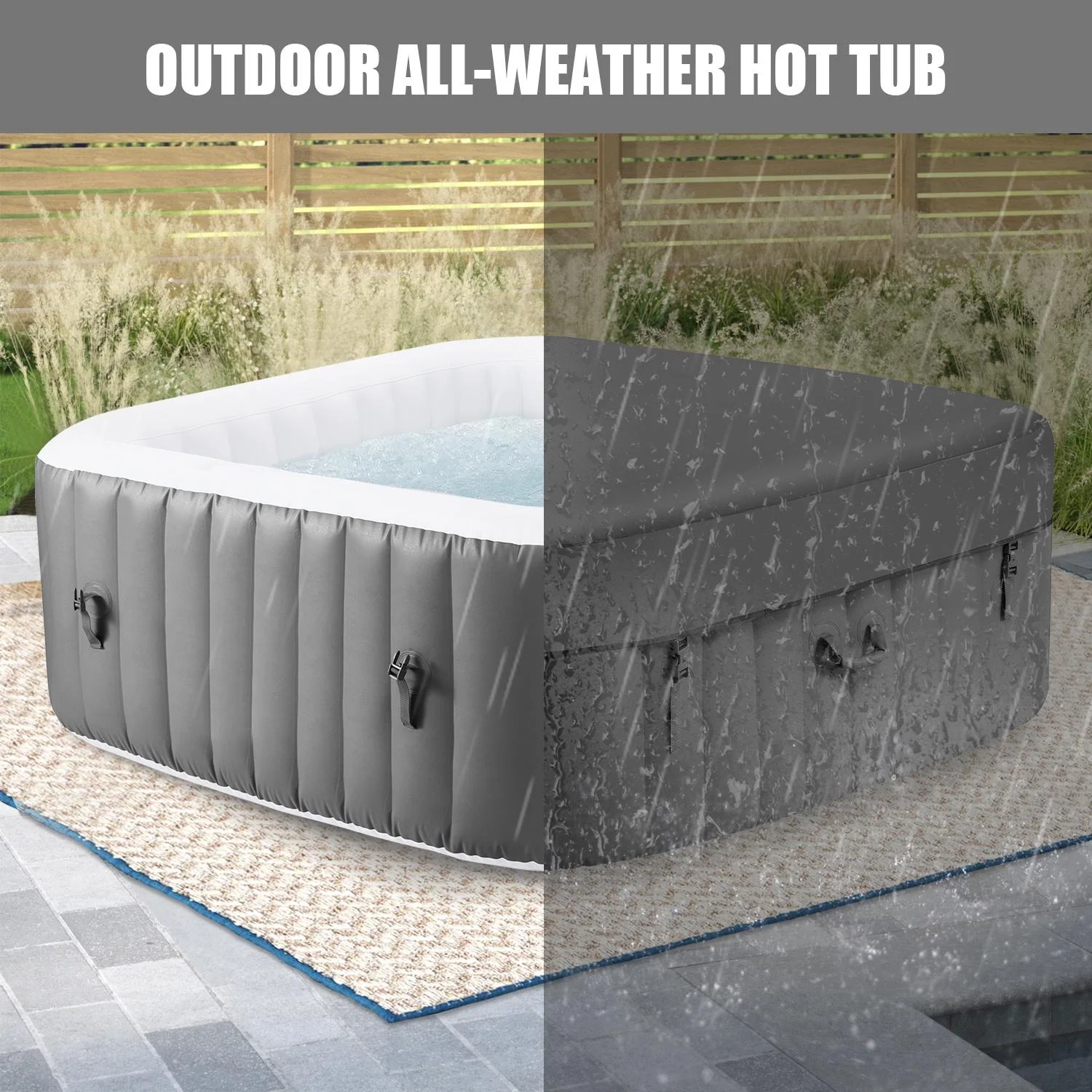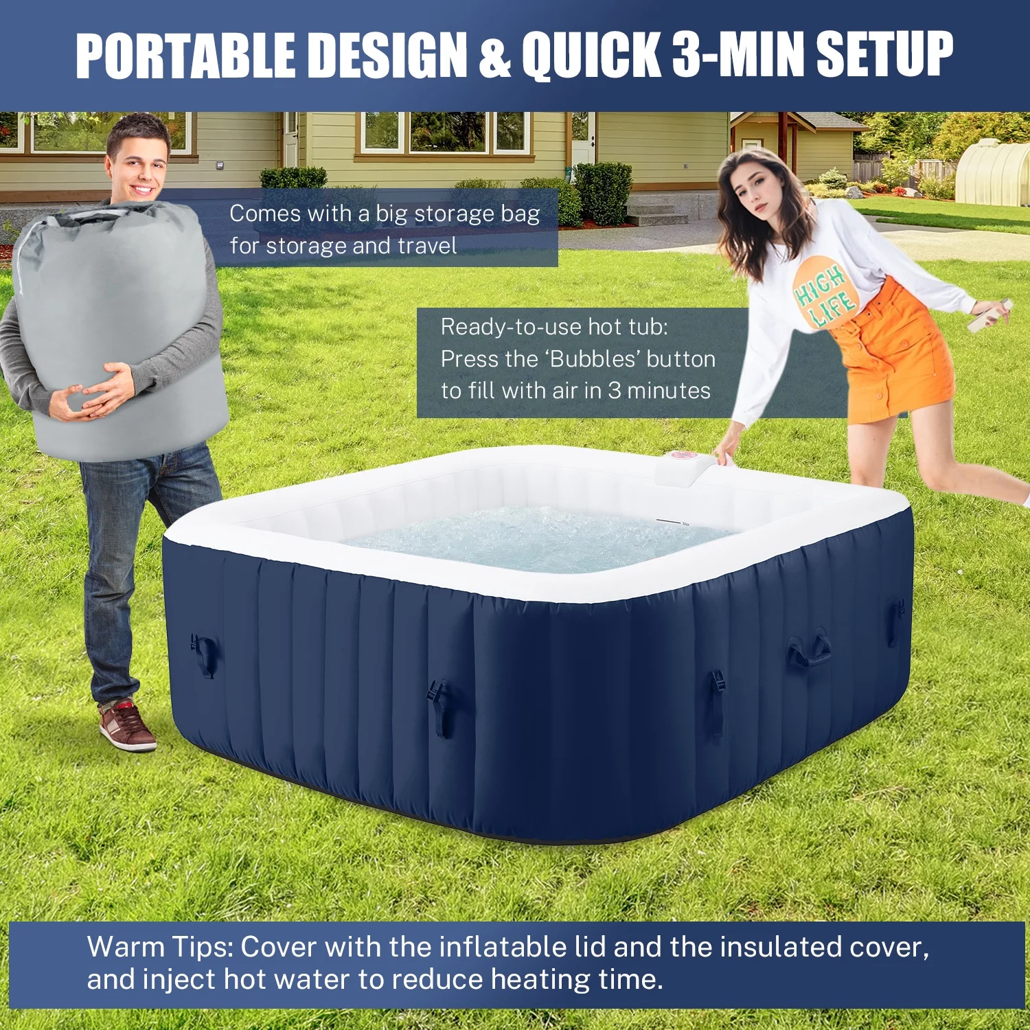 - ??: Requiring a mere 3-minute setup, this hot tub has side handles for easy maneuvering. Using the included zip ties and storage bag, your family can enjoy the hot spring spa experience anytime, anywhere!
