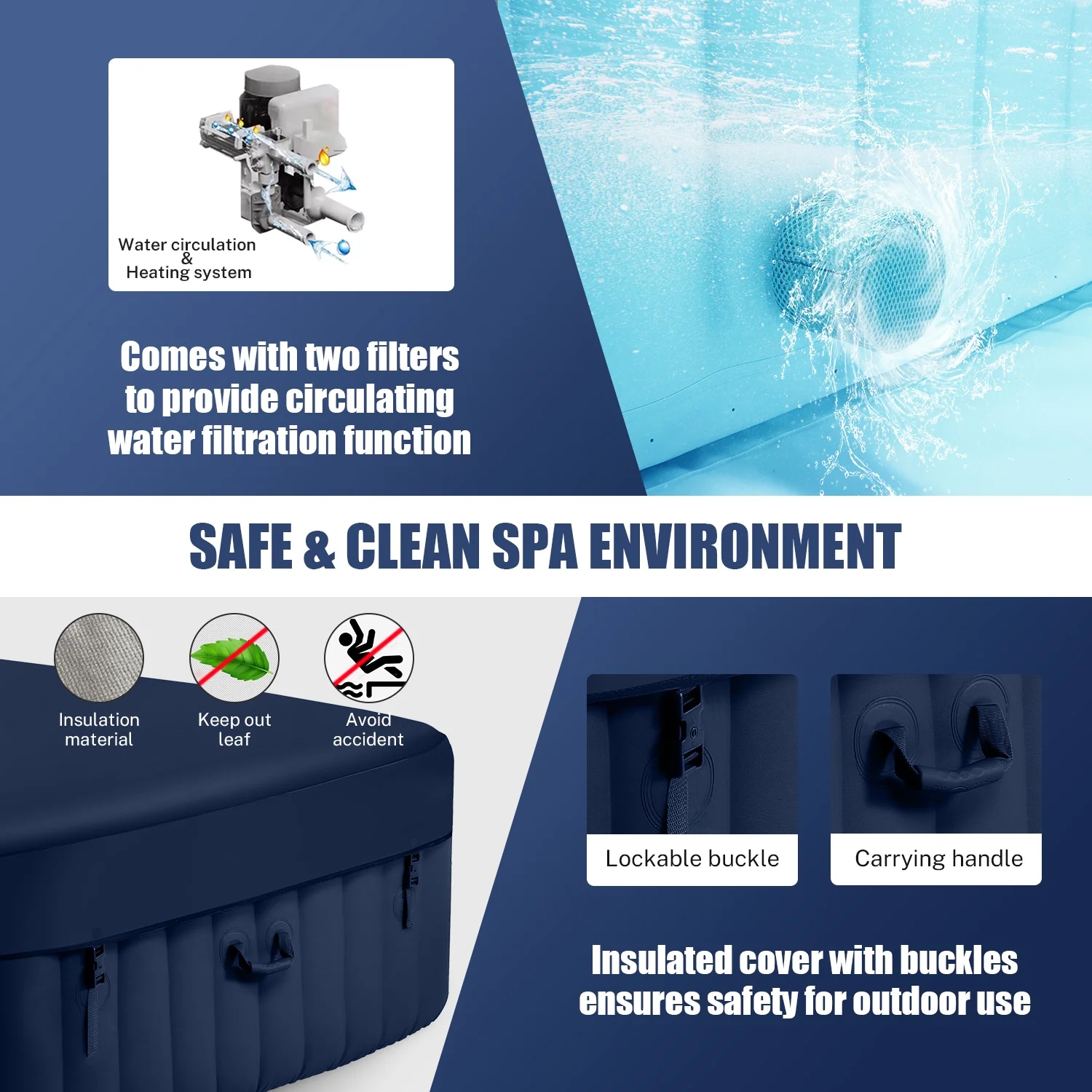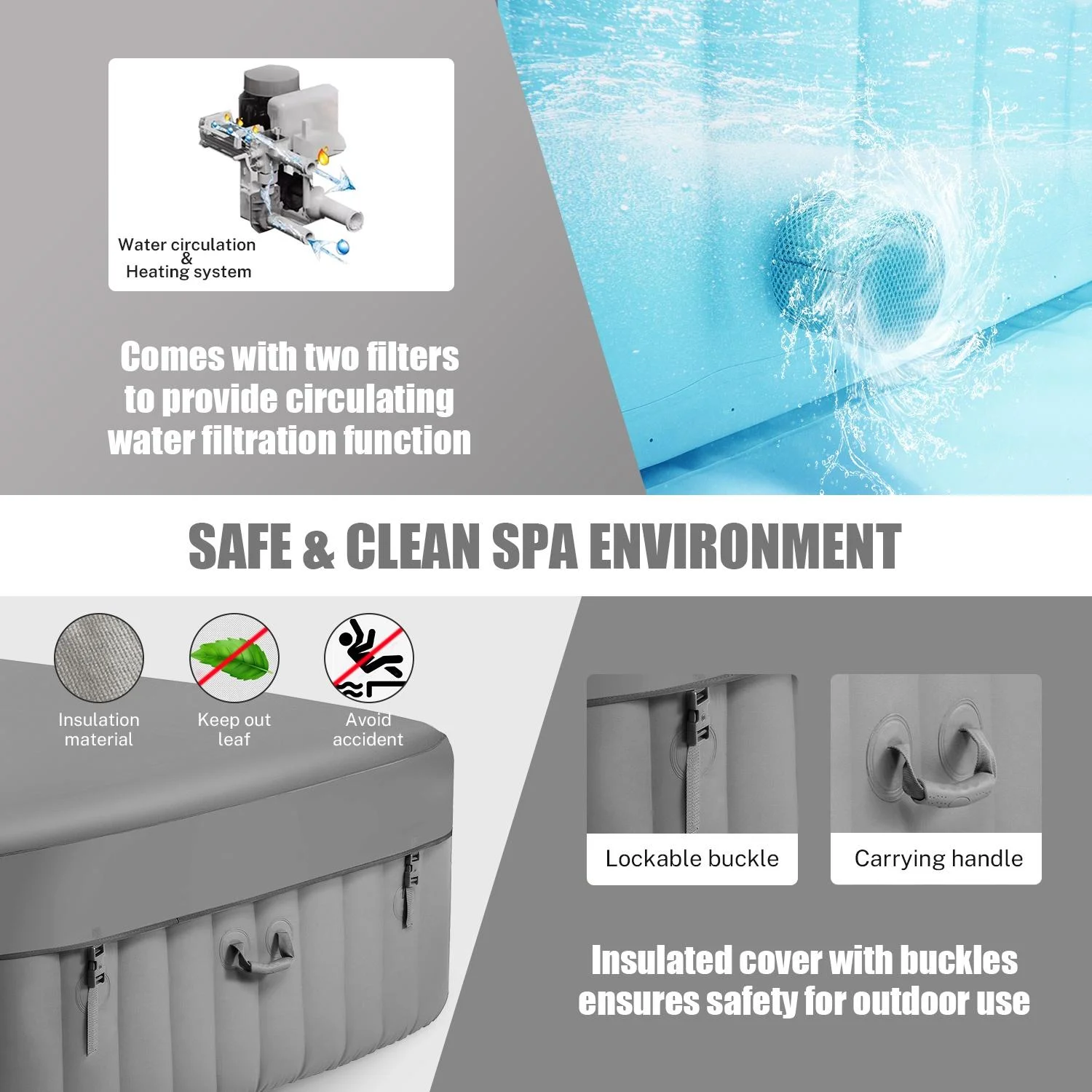 - ??: The lockable spa cover considerably reduces the time and frequency needed to heat your outdoor hot tub. Additionally, it shields against debris entering the water, thus minimizing the filtration process.