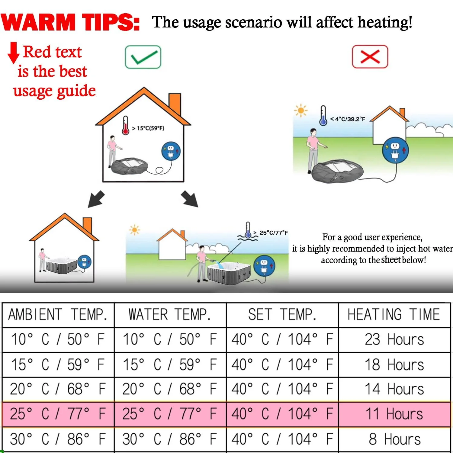 ???Warm Tips: To quickly enjoy a warm water SPA outdoors, it is recommended to pour hot water to reduce waiting time.