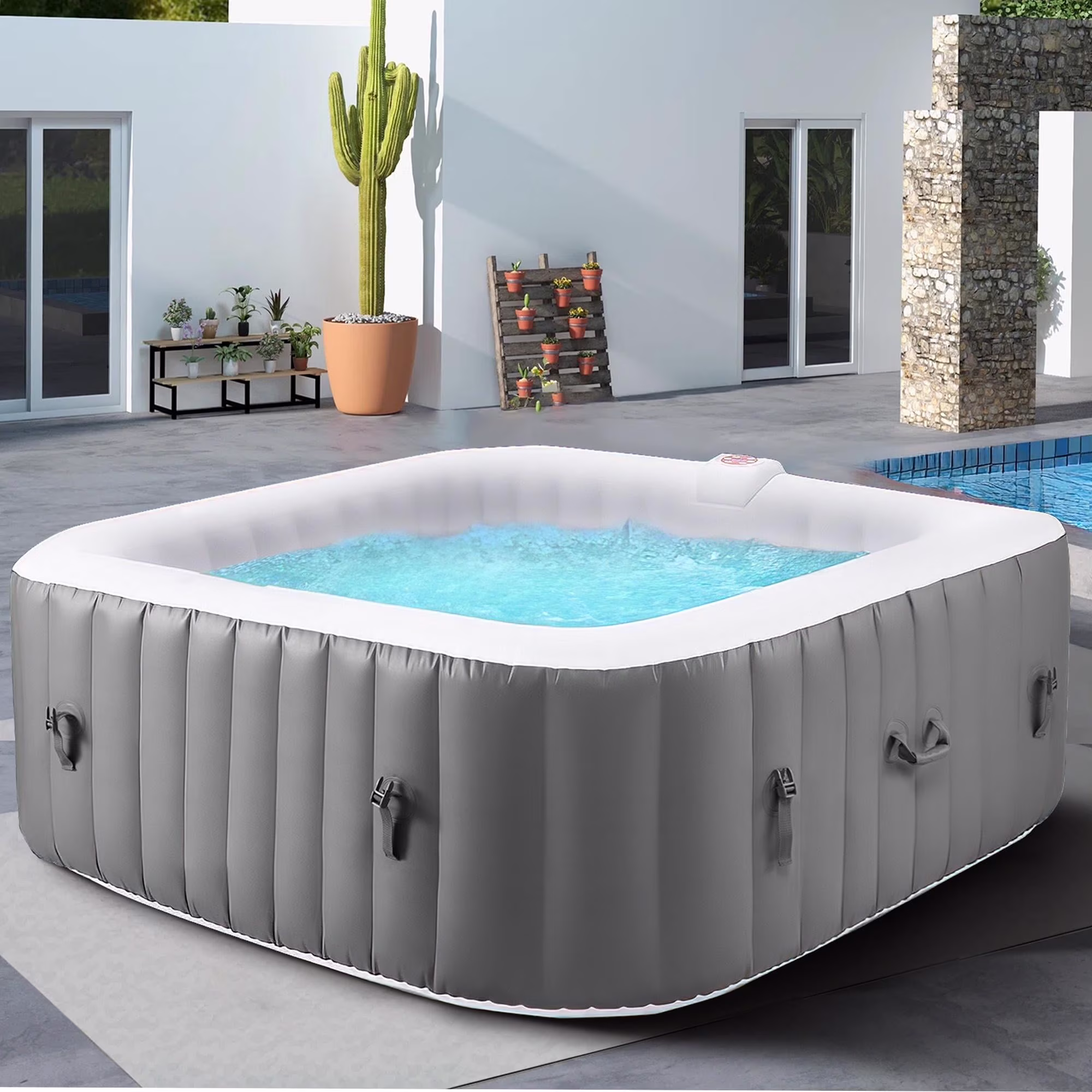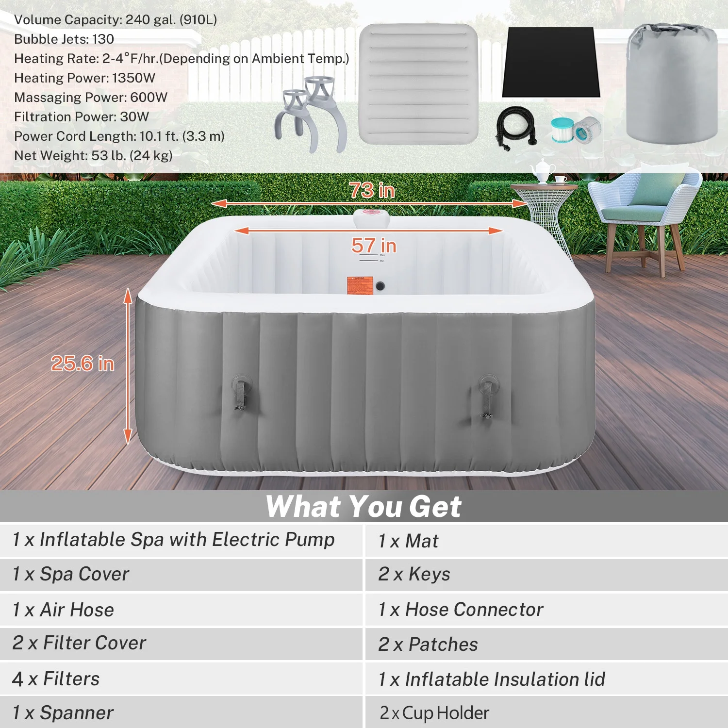 1. Large size family spa: 73'' x 73'' square 240gal for 4-6 people.