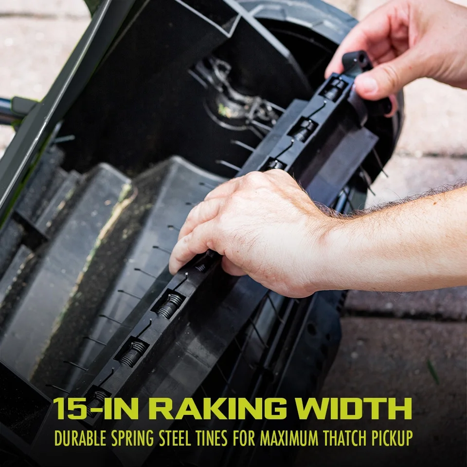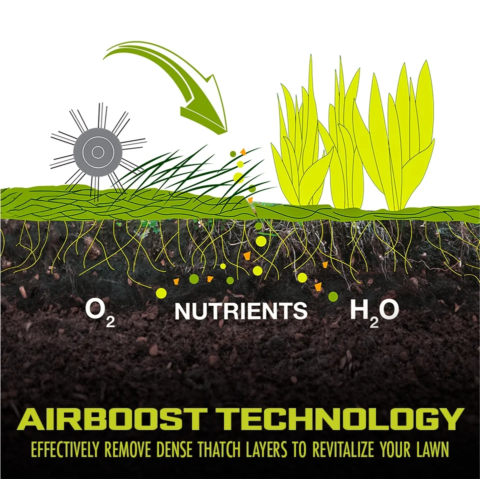 - Enhanced Air Boost technology with spring steel tines for maximum thatch pick-up