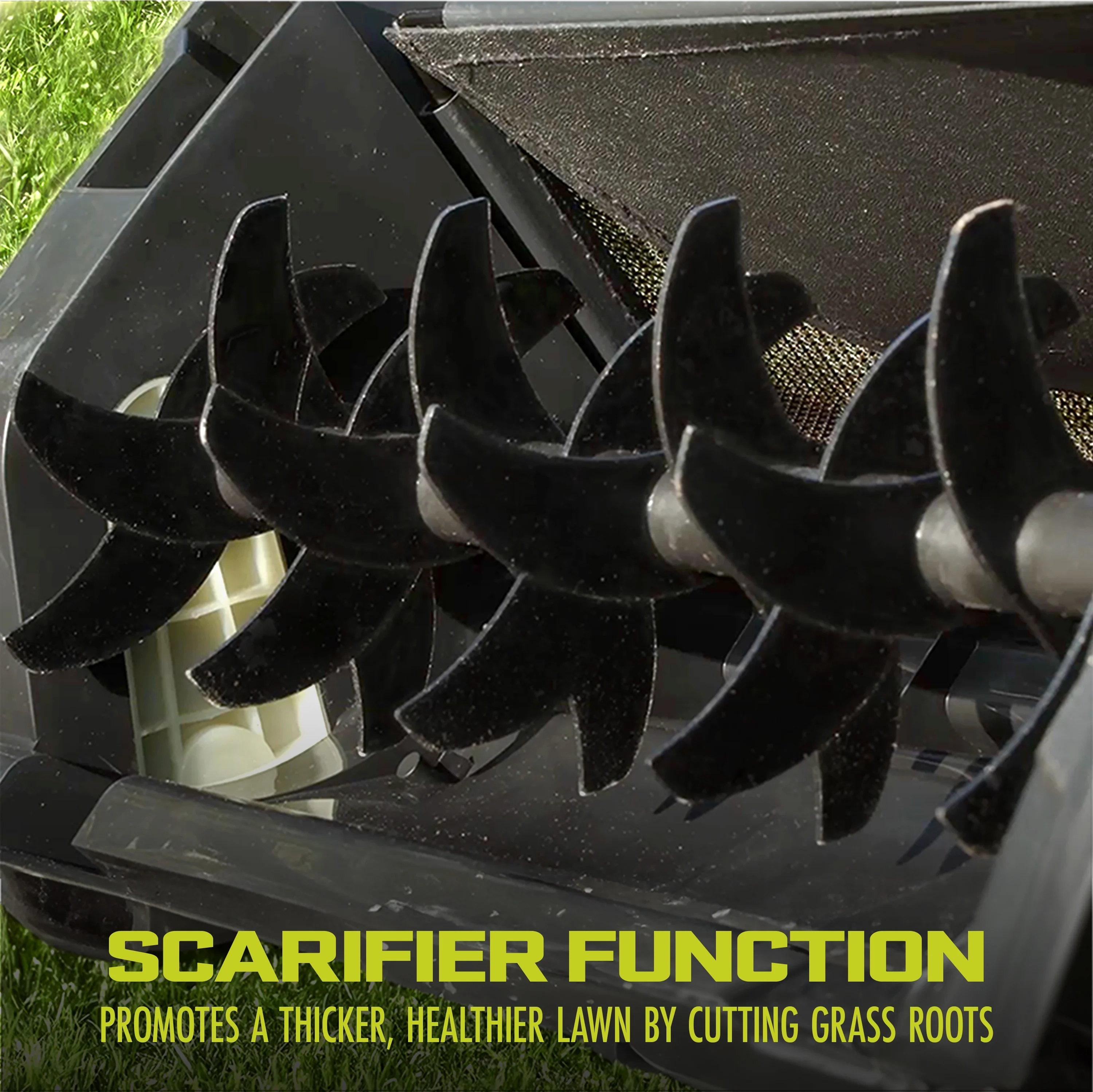 - Scarifier function cuts grass roots to encourage thicker, healthier turf growth