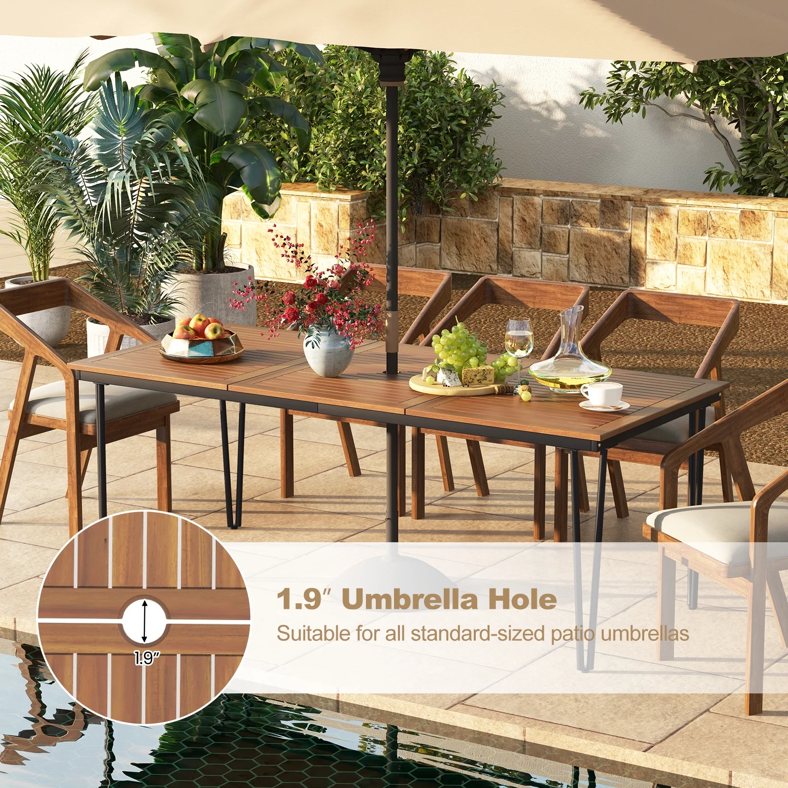 It is perfect for hosting gatherings of up to 8 people while providing a cool shade with its built-in 1.9" umbrella hole. Crafted from durable acacia wood, our dining table features a stylish slatted design that allows rainwater to effortlessly drain during outdoor use. Its robust metal frame, complete with strong legs, metal crossbars, and triangle support, ensures exceptional stability and a weight capacity of up to 165 lbs. Whether placed indoors or outdoors, our patio table remains steady on any surface thanks to its adjustable foot pads. Not only does it offer functionality, but its rustic charm adds a touch of elegance to any space. Assembly is a breeze, and its dimensions of 79"L x 35.5"W x 29.5"H make it the perfect fit for your home.