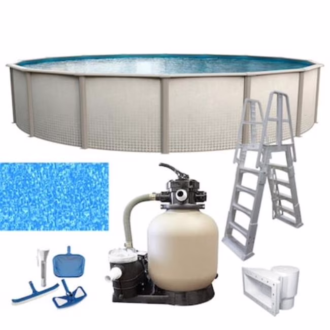 15 ft. x 15 ft. x 52 in. Steel Wall Panels Round Above Ground Pool with Filter Pump & Ladder. The Rhine pool offers the right balance between affordability and years of above ground pool enjoyment. This pool is made of an oversized corrosion resistant foundation, allowing it to withstand intense soil conditions. It also has interlocking stabilizer rails, fitting tightly over your liner and the top of the pool wall. This will help lock the liner in place to increase its life.