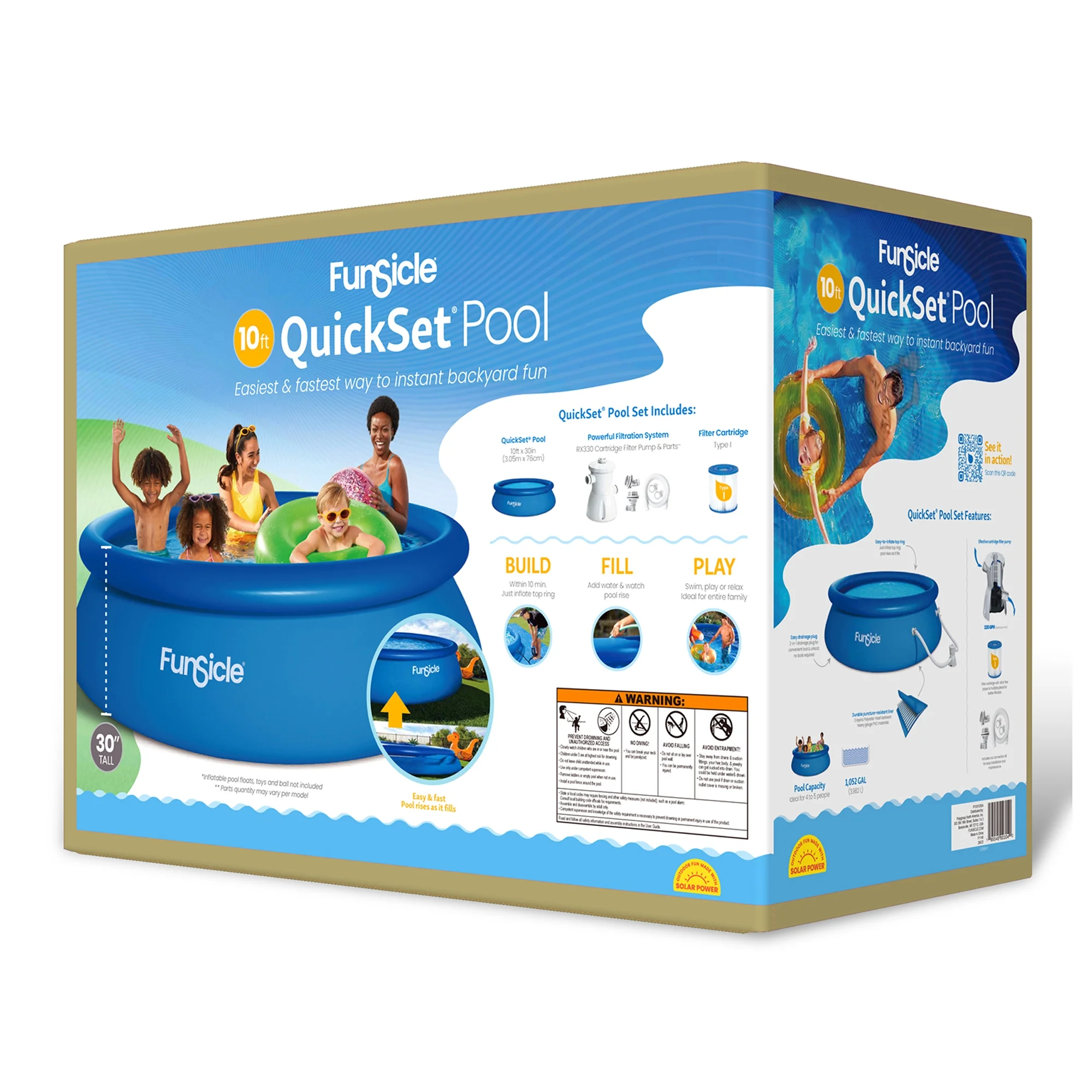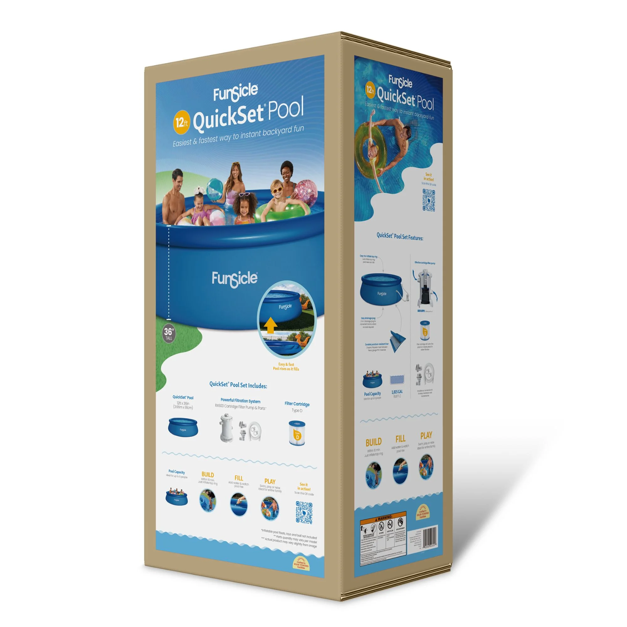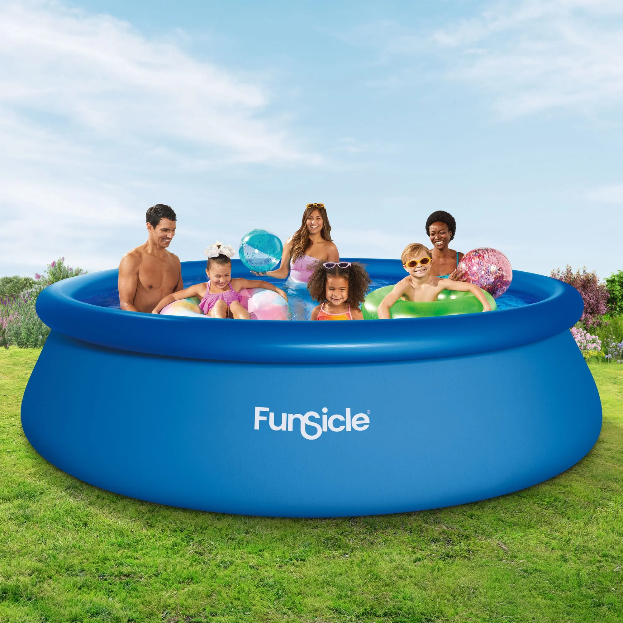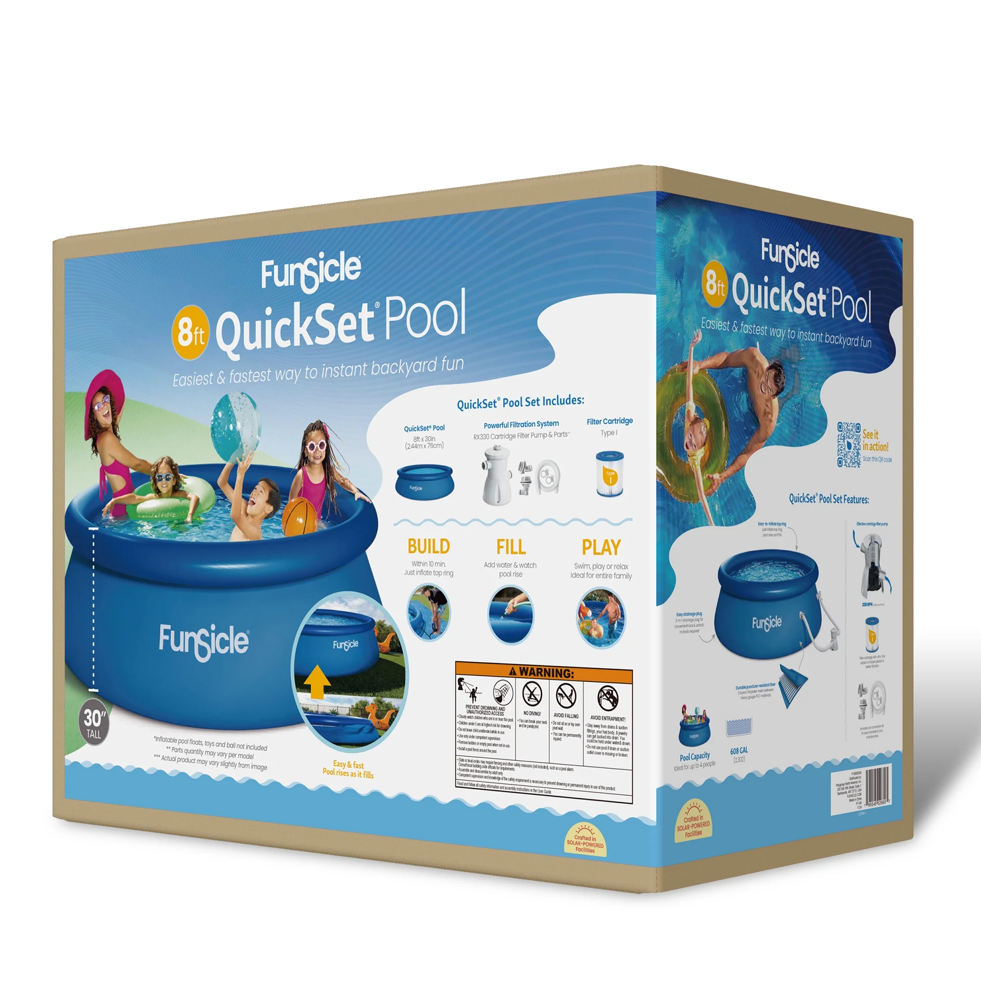 The Funsicle 8 ft QuickSet Pool is the easiest and fastest way to instant backyard fun. Best for those with young children or who want the most hassle-free setup, this above ground pool can comfortably accommodate 3 to 4 people, giving you space to float, play and swim. So durable and made with puncture-resistant materials, it comes with a powerful filter pump, which is easy to use and will keep your water clean and fresh throughout the season. Set it up in minutes by simply inflating the top ring and watching the pool rise as it fills with water. Perfect for those who want a quick way to a great pool experience.