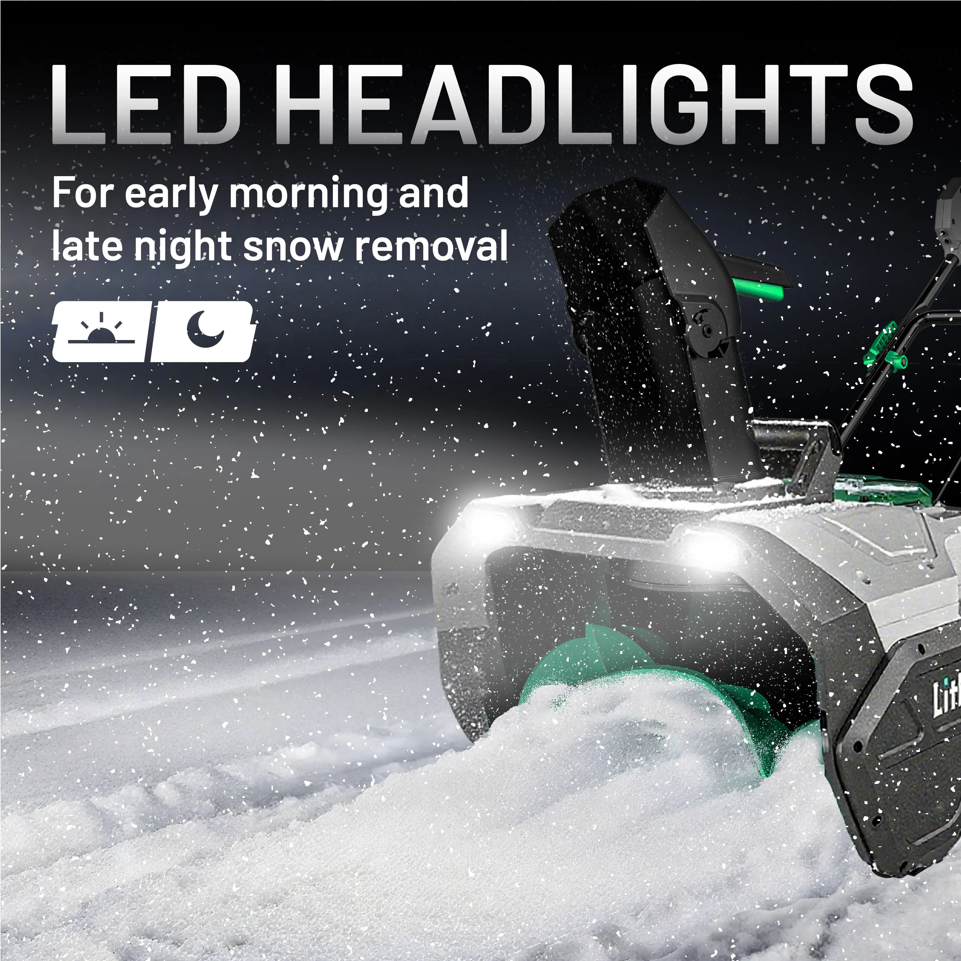 【User-Focused Ergonomic Design】Two auto LED headlights provide visibility in low-light conditions. A dual-step start mechanism prevents unintended operation. The upper handle can be folded to reduce storage space, while the crank-operated chute rotates 180° and the integrated deflector offers 8 adjustable positions within a 45° range.
