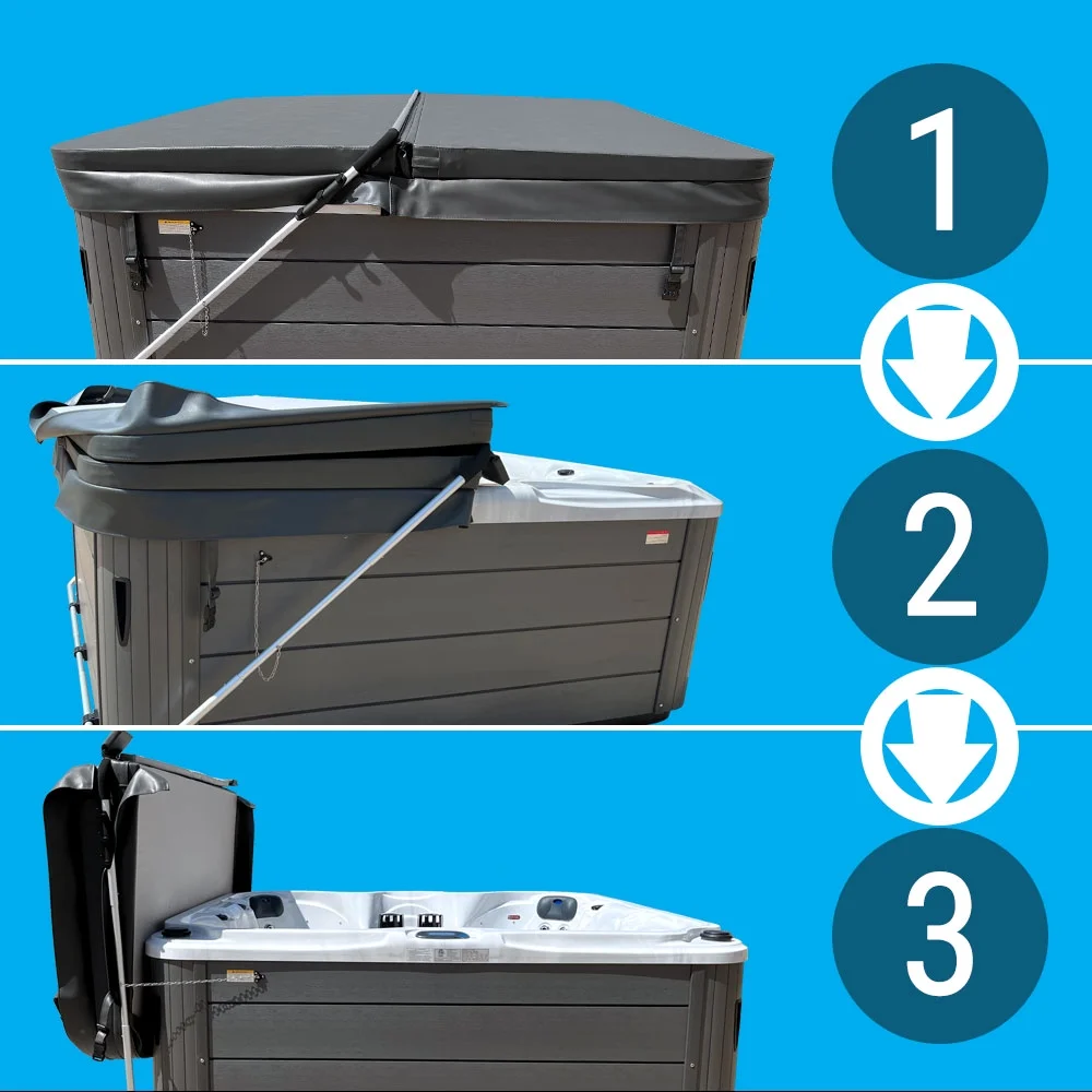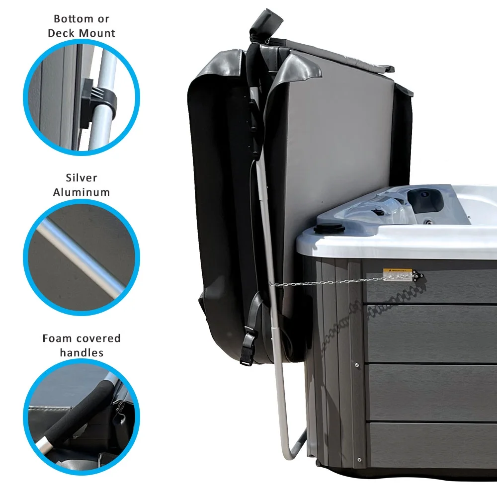 - Easy to use & install! Just fold cover over the full-length center bar and use the padded handle to pull over the back of the spa.