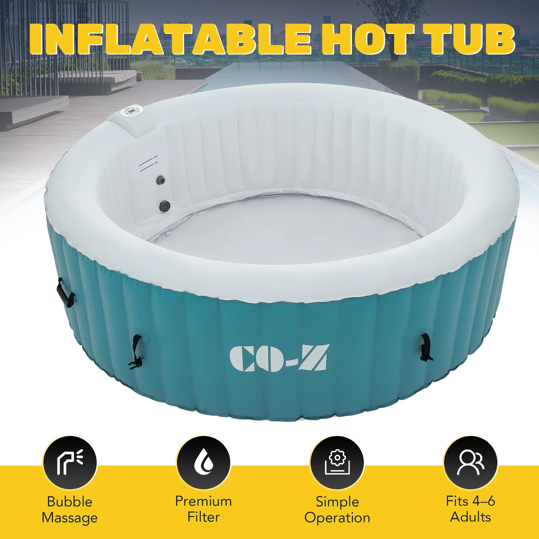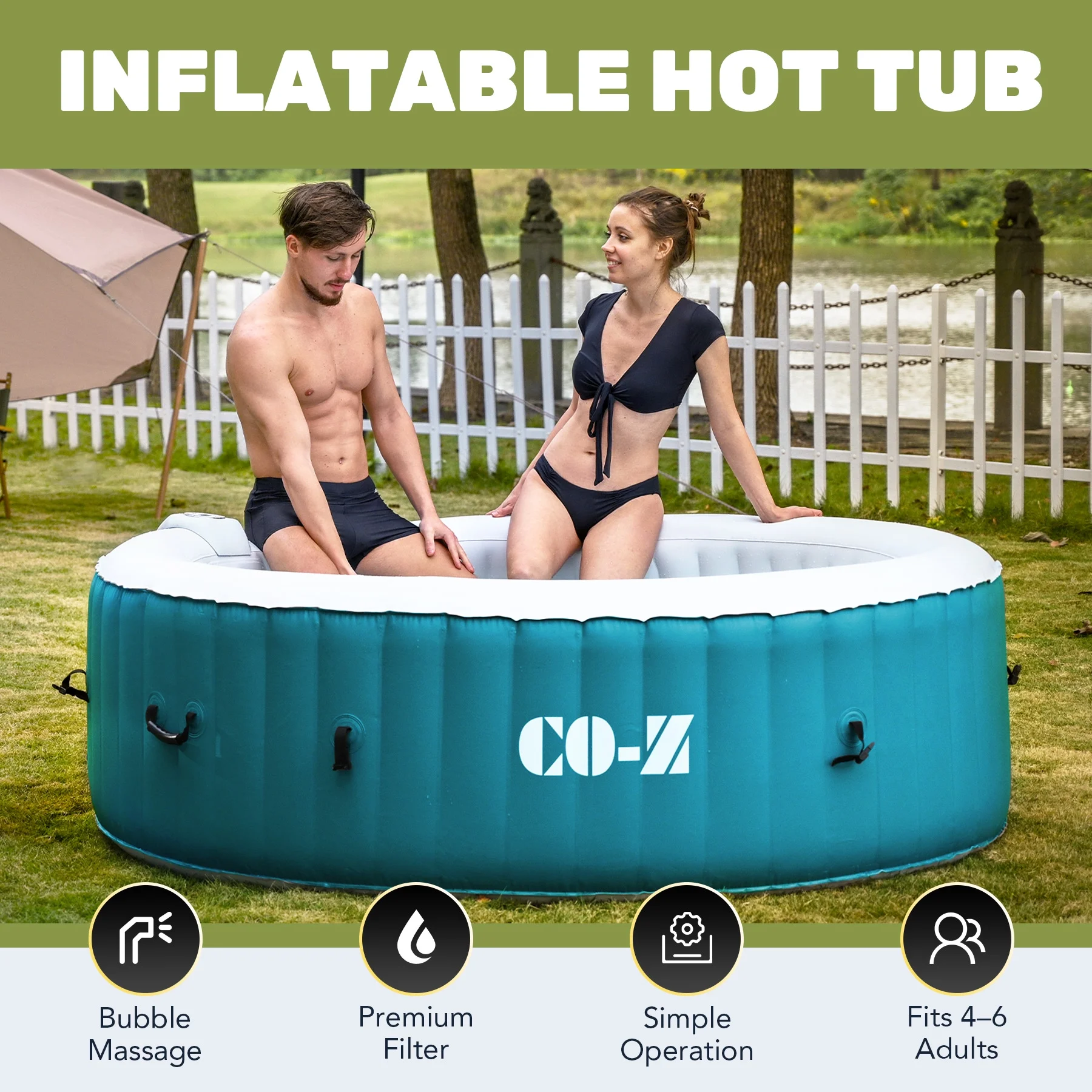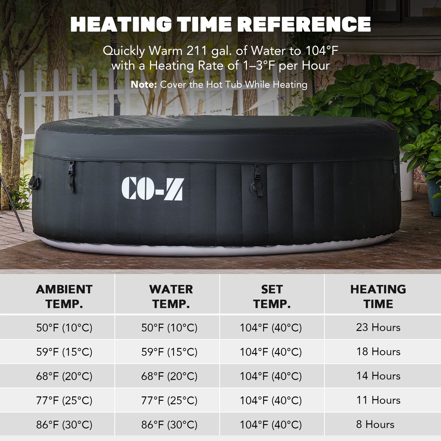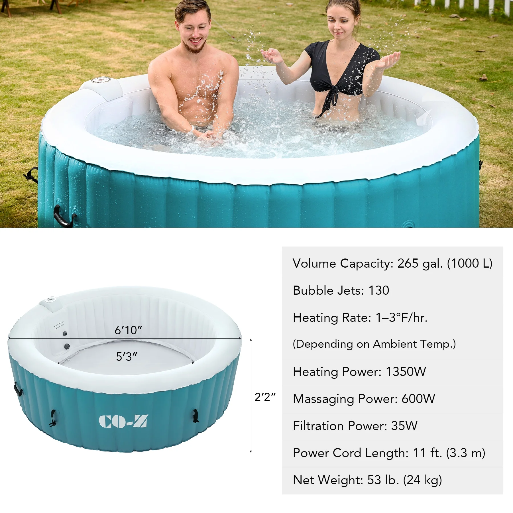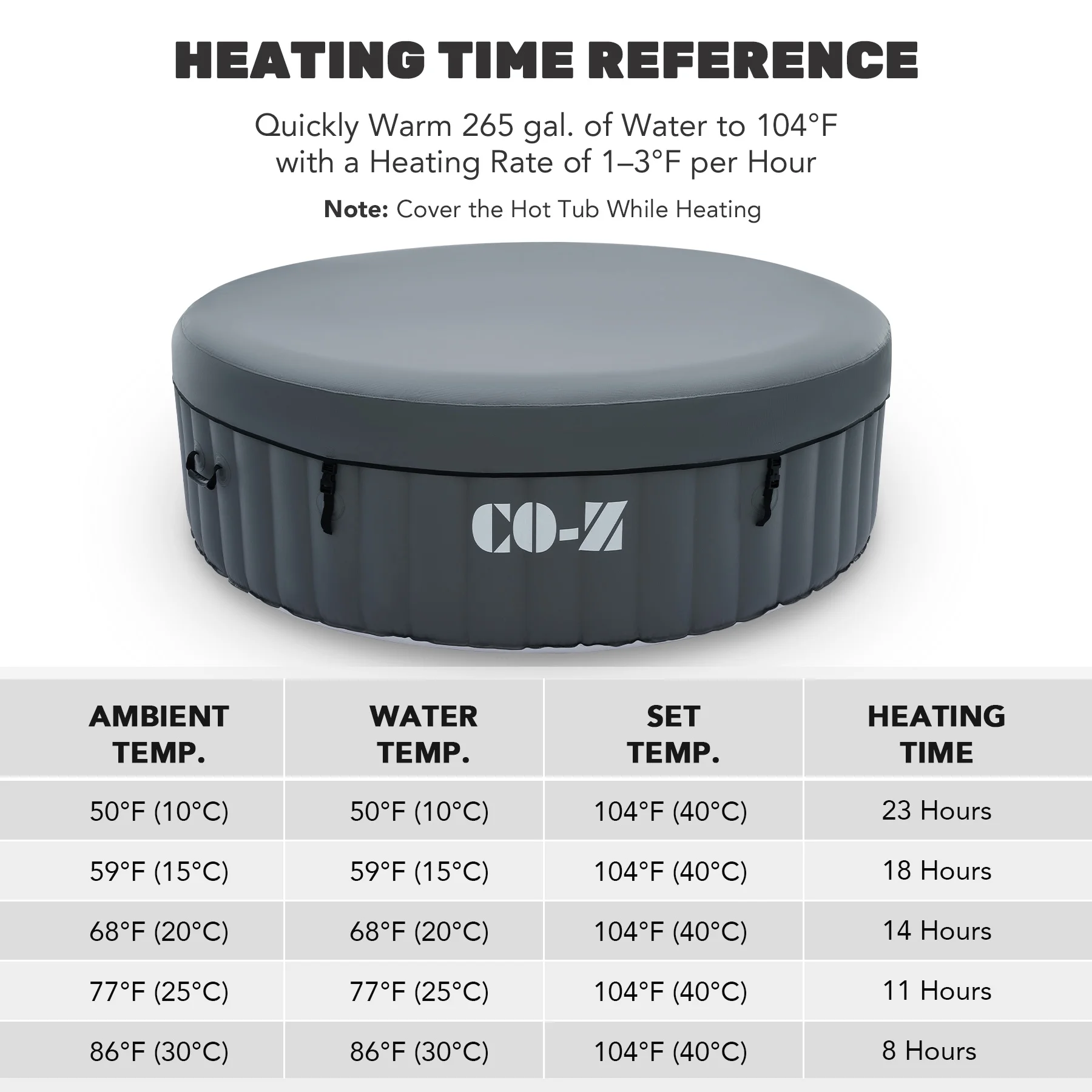 ��LUXURY SPA AT HOME��: CO-Z's inflatable hot tub, featuring upgraded 1350W heating tube to speed up heating, warms its 265 gallons to 104��F with a heating rate of 1-3��F per hour, complemented by 130 high-powered jets for abundant relaxation