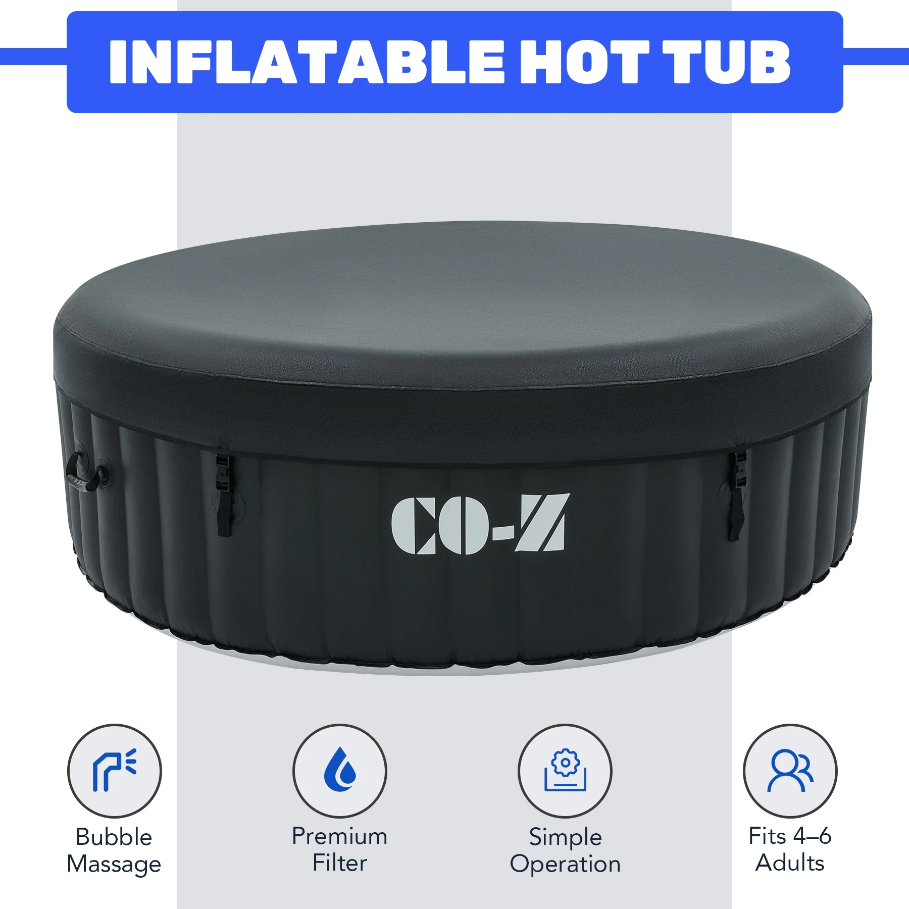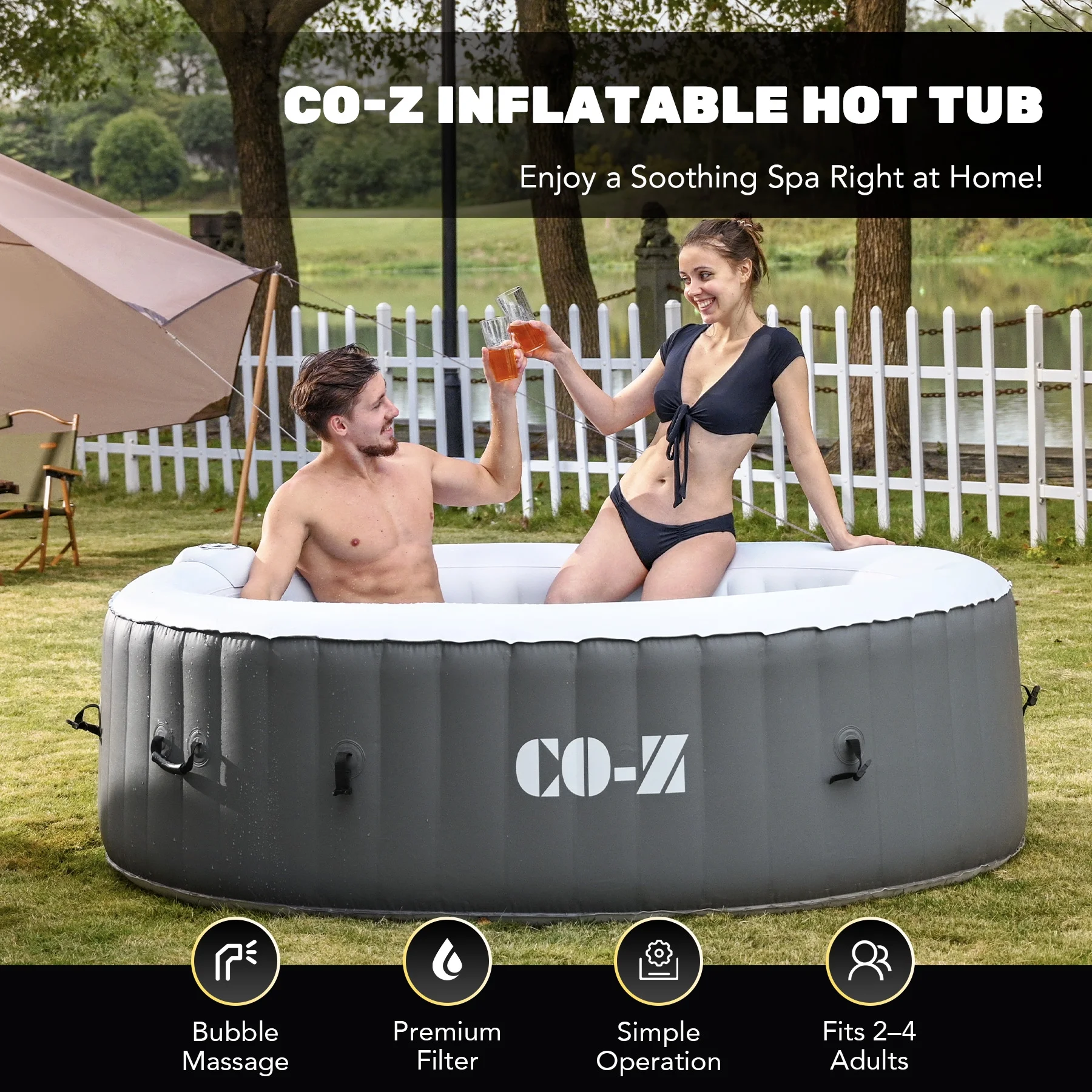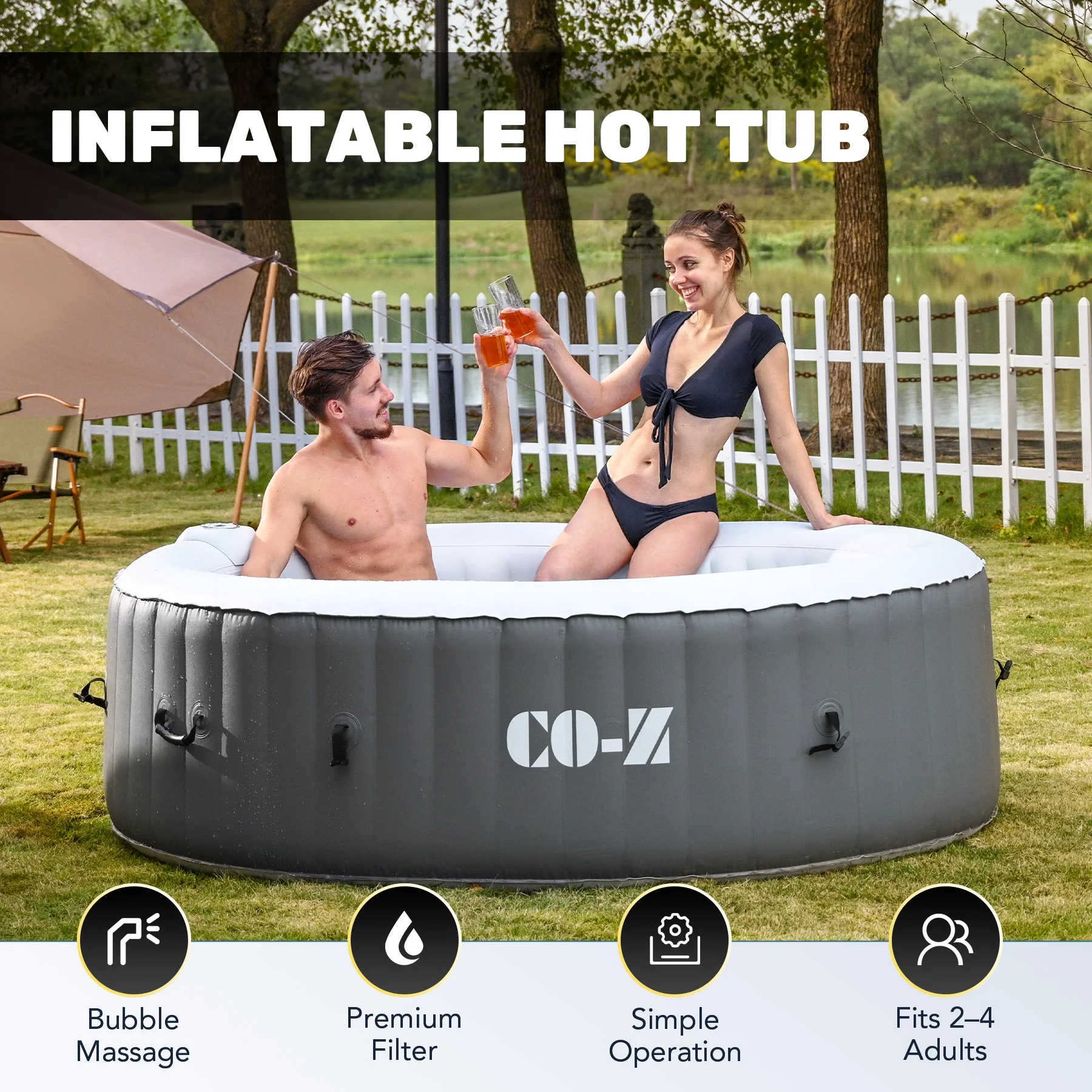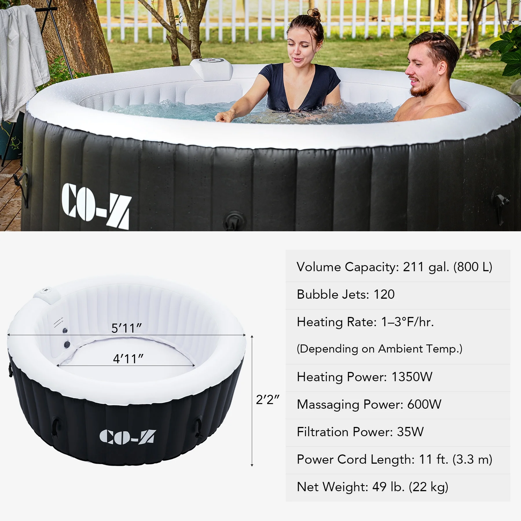 ��LUXURY SPA AT HOME��: CO-Z's inflatable hot tub, featuring upgraded 1350W heating tube to speed up heating, warms its 265 gallons to 104��F with a heating rate of 1-3��F per hour, complemented by 130 high-powered jets for abundant relaxation