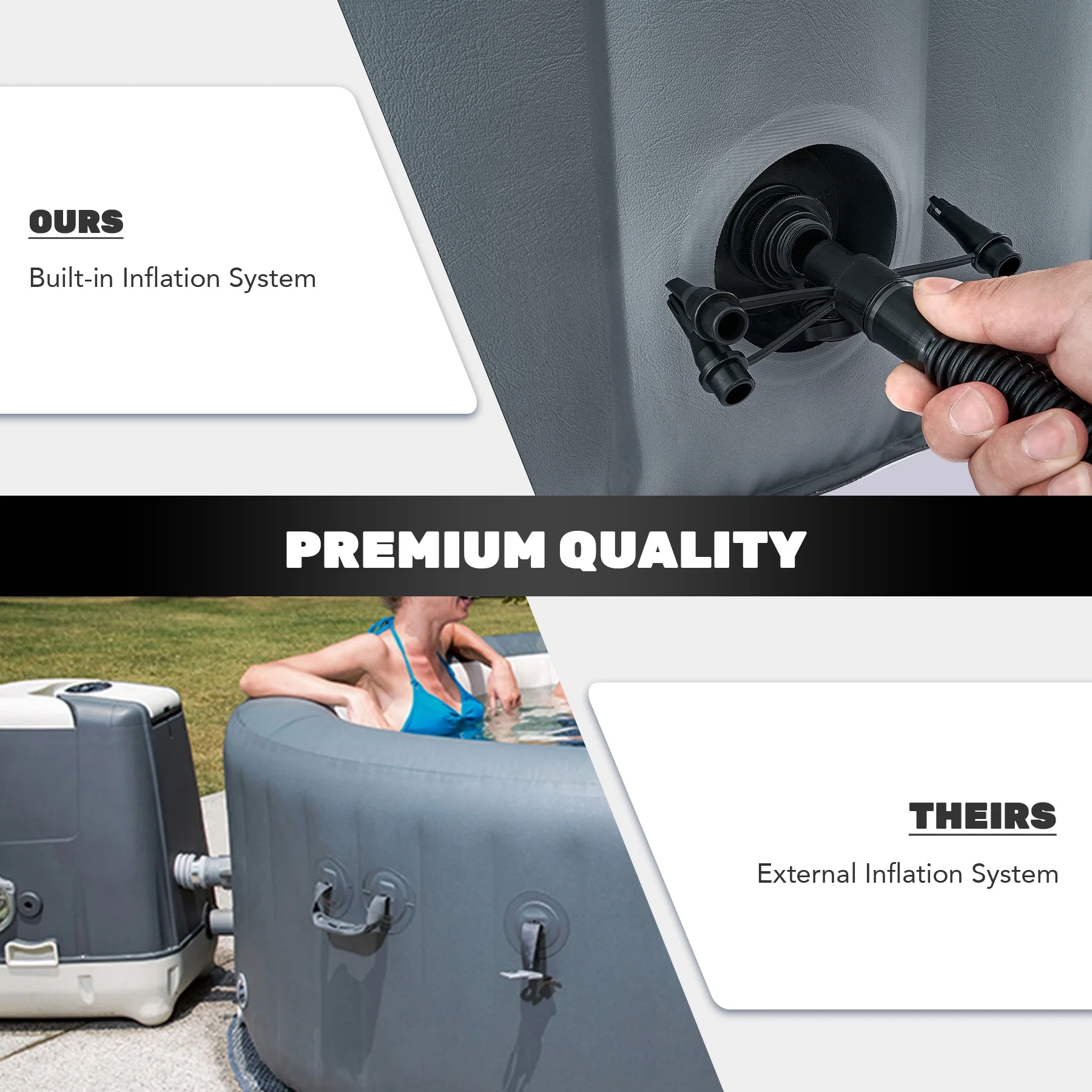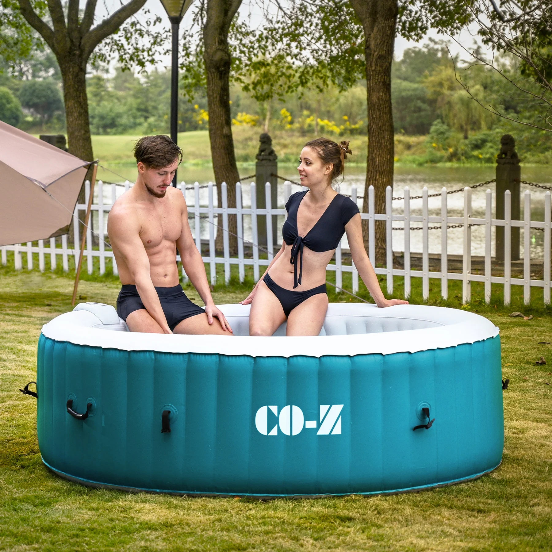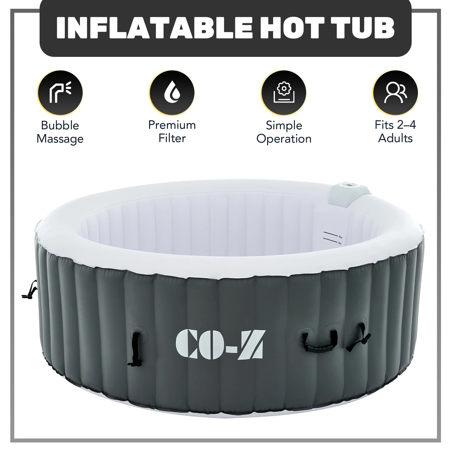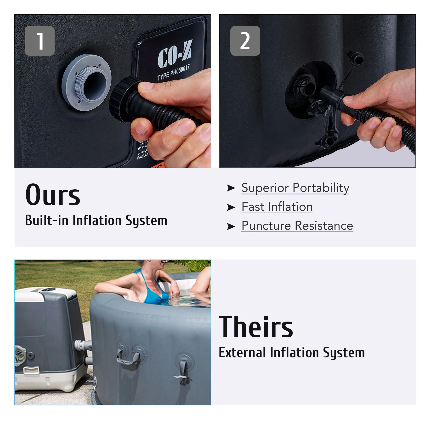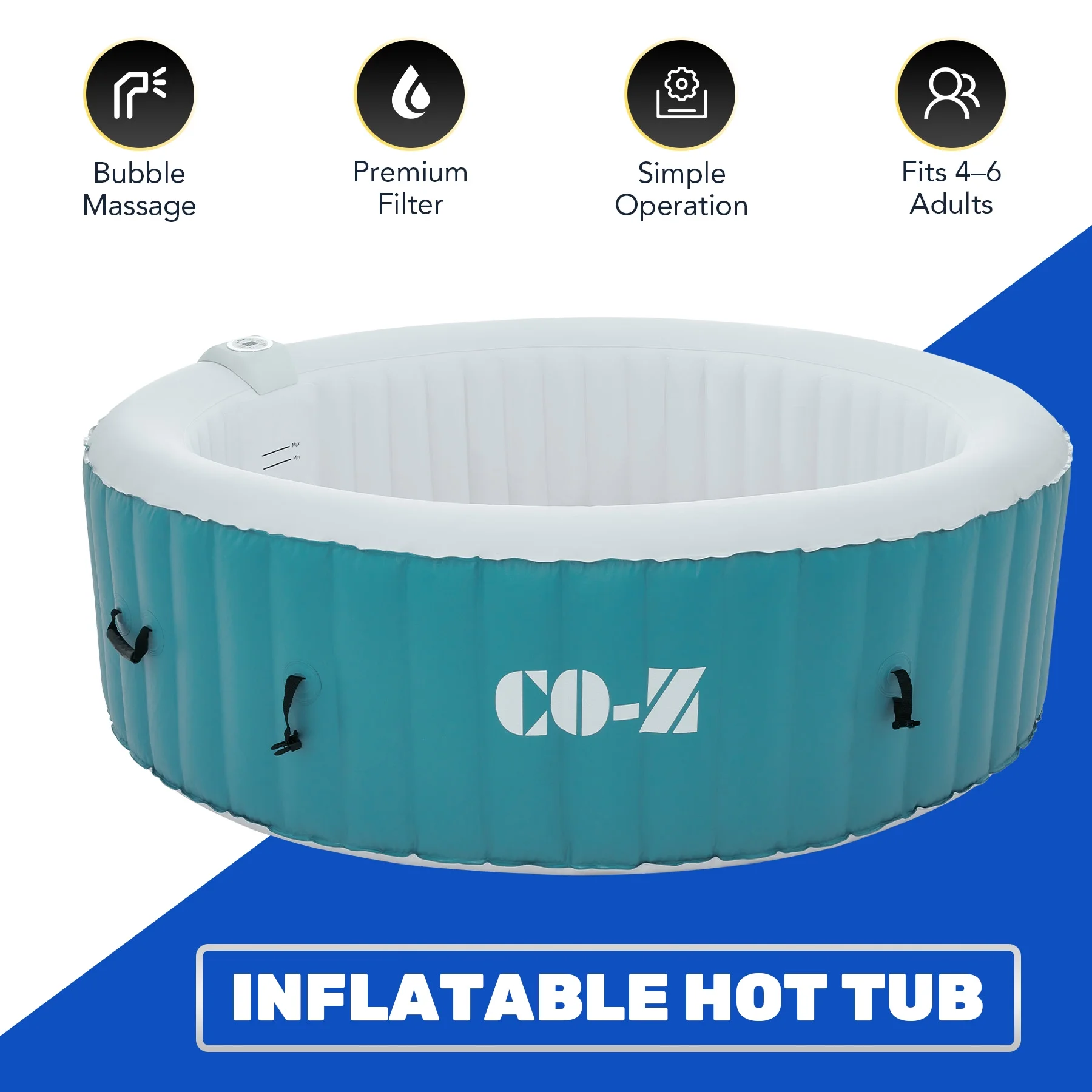 ��EASY SETUP & TRANSPORT��: Our portable hot tub is easy to set up thanks to the clear instructions; the provided electric air pump inflates it in under 8 minutes; and the convenient side handles make it a breeze to transport once inflated