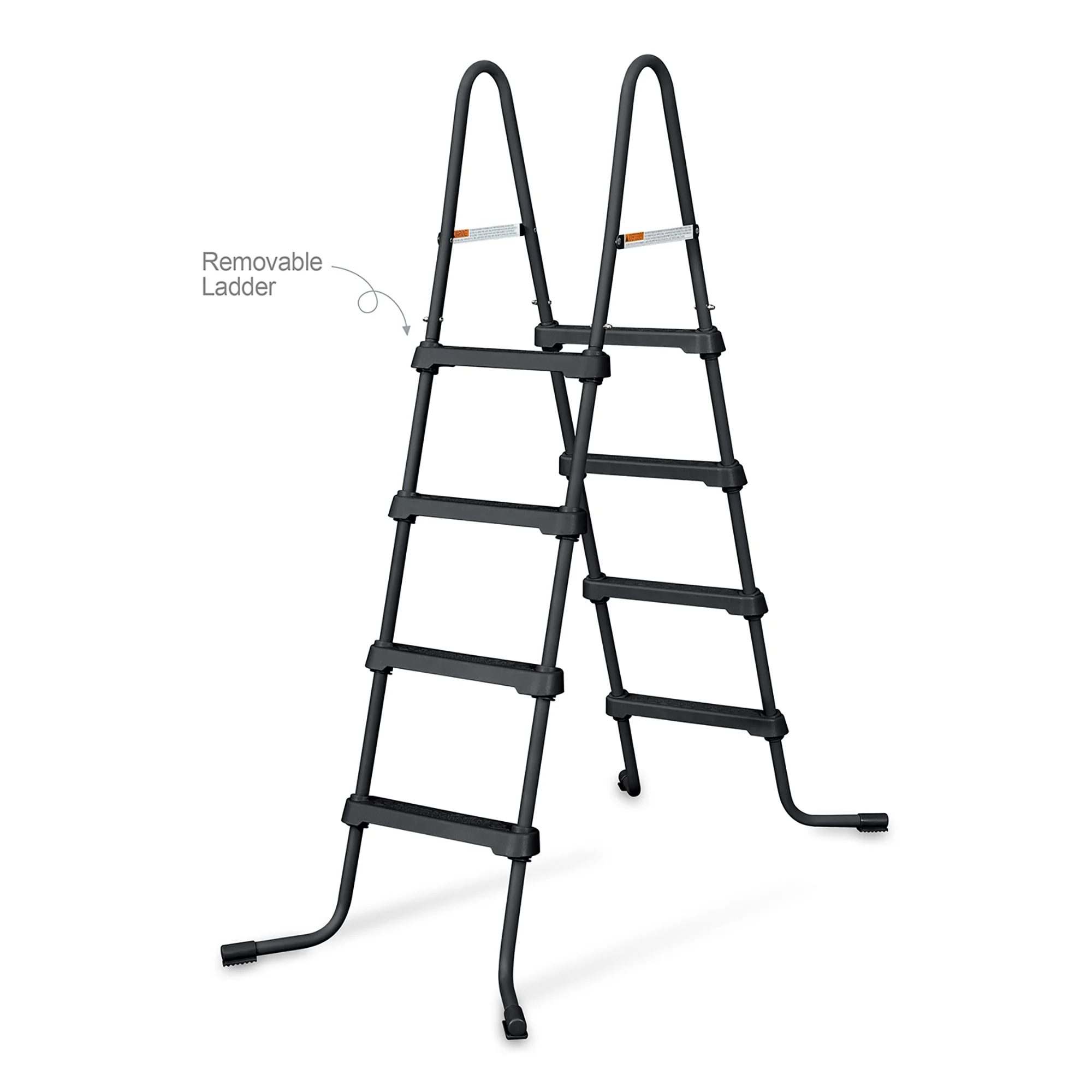 - DURABLE: Matte finish prevents pole scratches & corrosion. Convenient quick release drain plug with garden hose connection. SureStep Ladder for safe and convenient in and out of pool access.