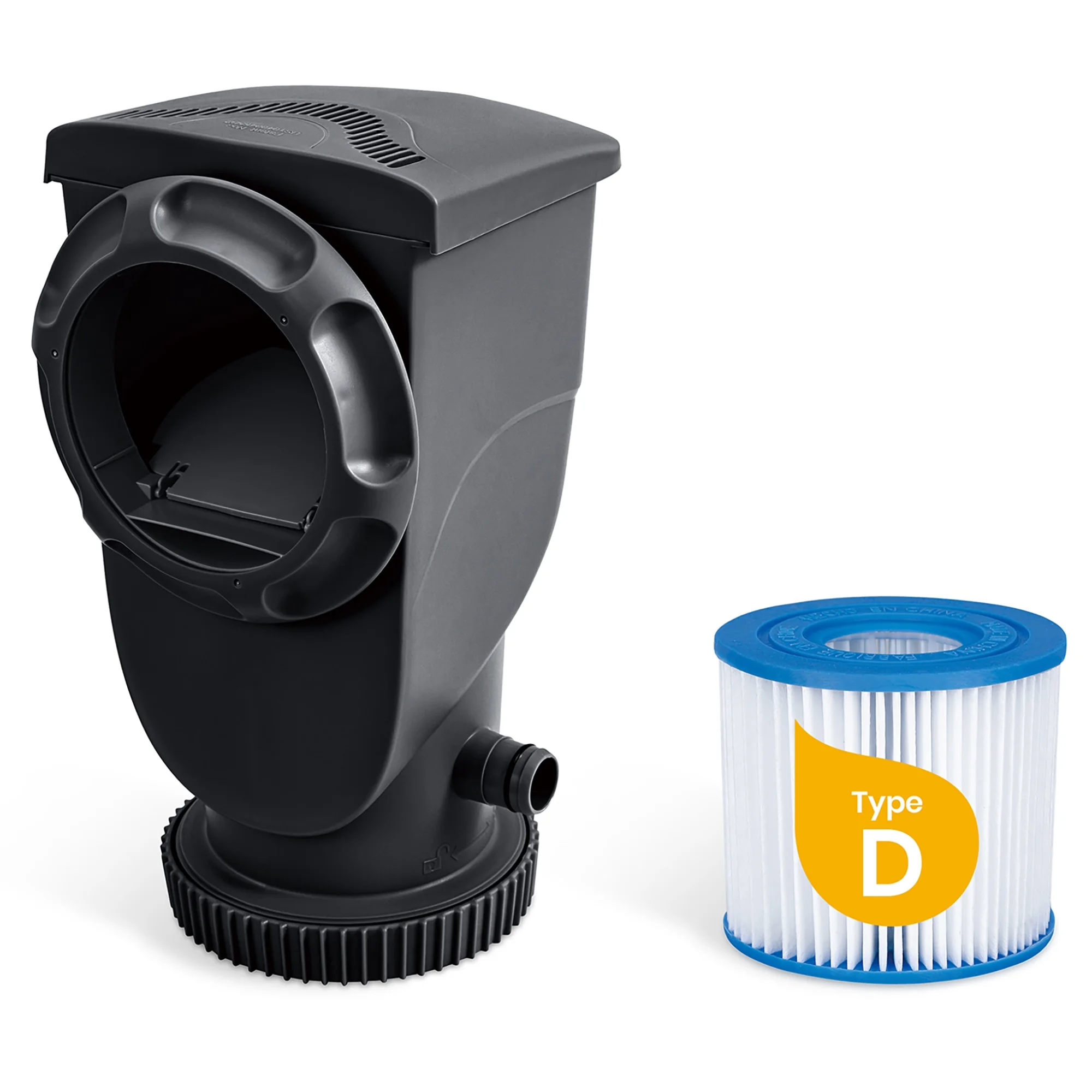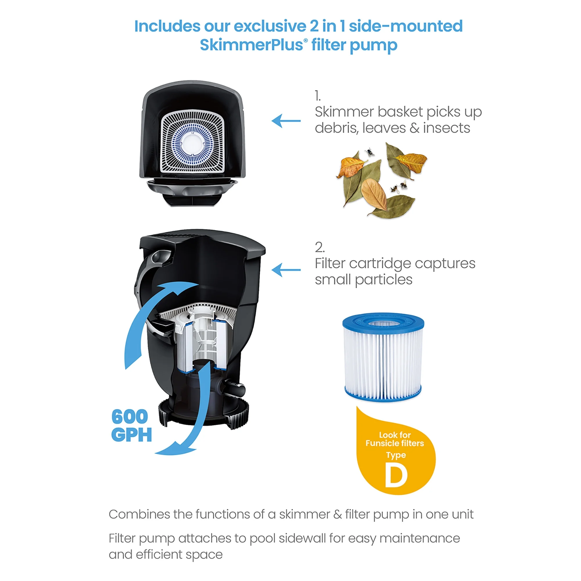 - COMBINES A SKIMMER & FILTER PUMP IN ONE UNIT: SFX600 SkimmerPlus Filter Pump (110-120V with GFCI), Type D Filter Cartridge & repair patch. Exclusive 2-in-1 side-mounted pump. Skimmer basket picks up debris. Filter cartridge captures small particles.