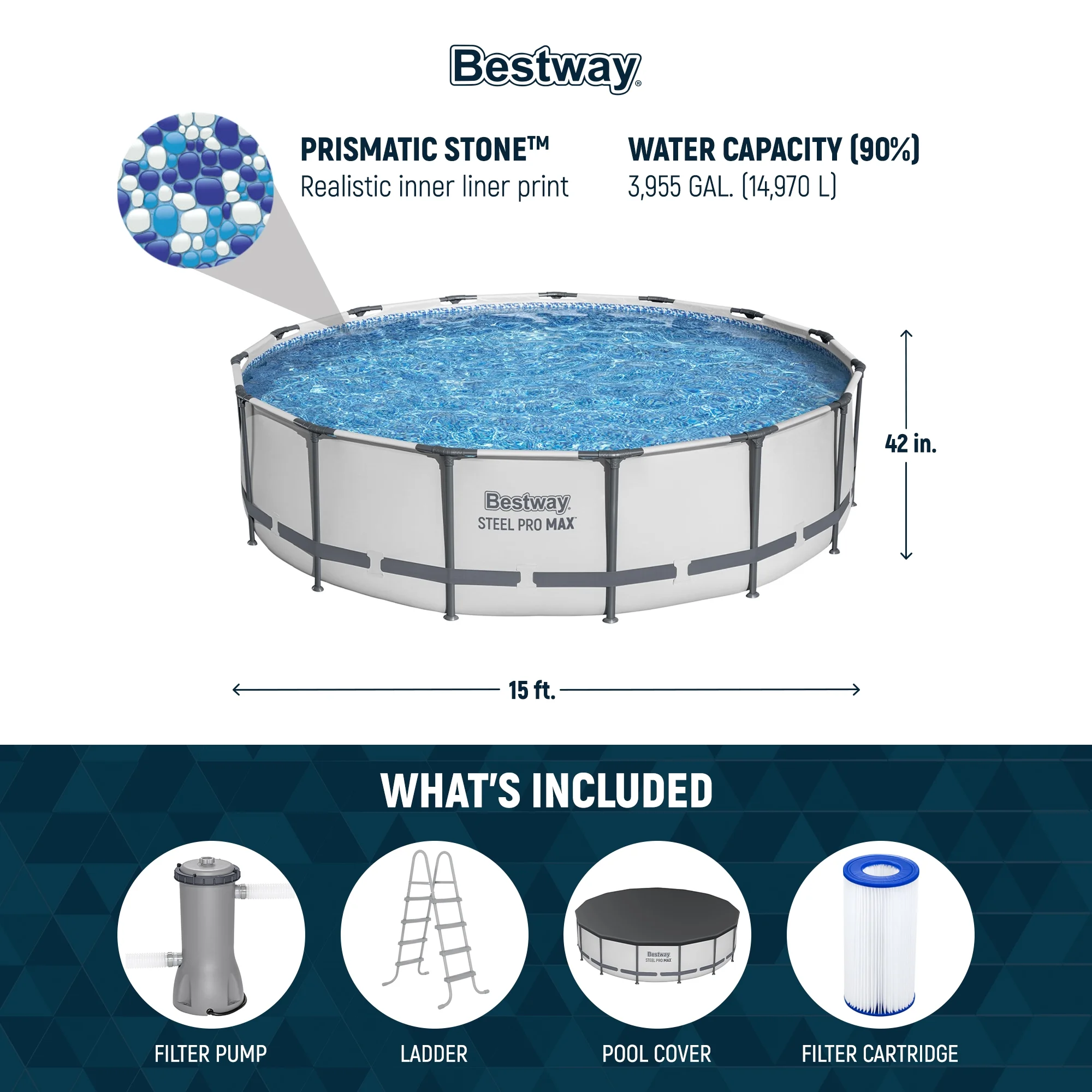 - Includes 1 pool, #58388US filter pump (110 120V, 1000 gal pump water flow rate, 780 gal integrated pool system water flow rate), #58335 ladder, #58038 pool cover, #58003 ground cloth, compatible with cartridge 58012 110 120V