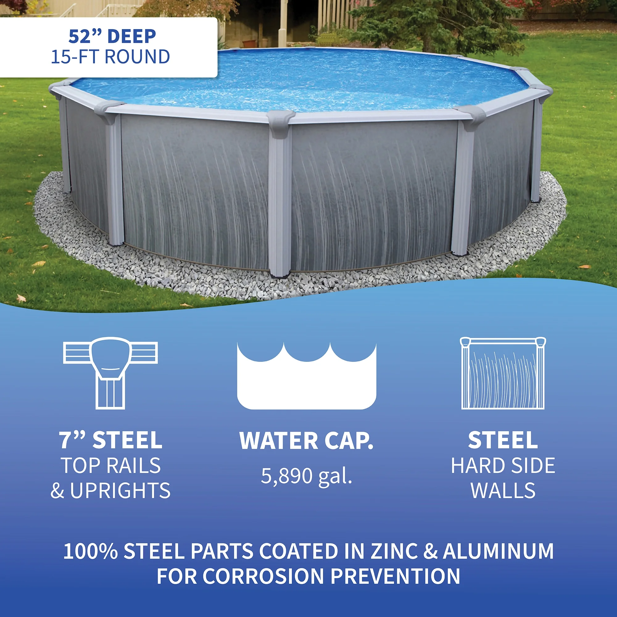 - 52-in deep quality steel pool with durable 7-in top rails
