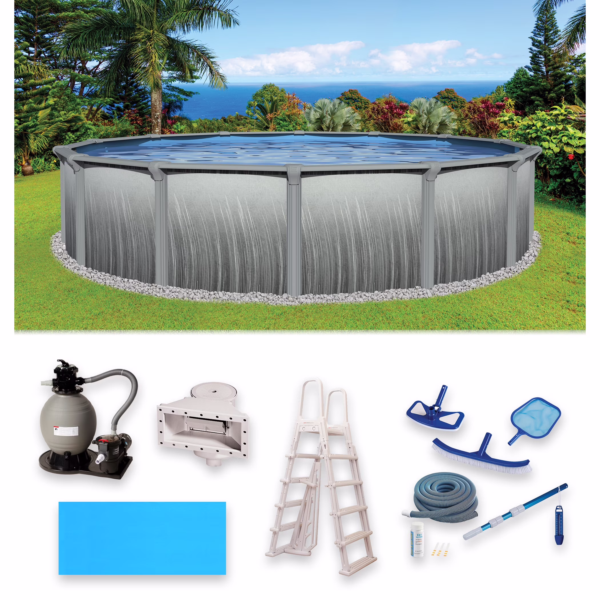 - Includes skimmer & return system, Blue overlap liner, sand filter & pump system, A-frame ladder