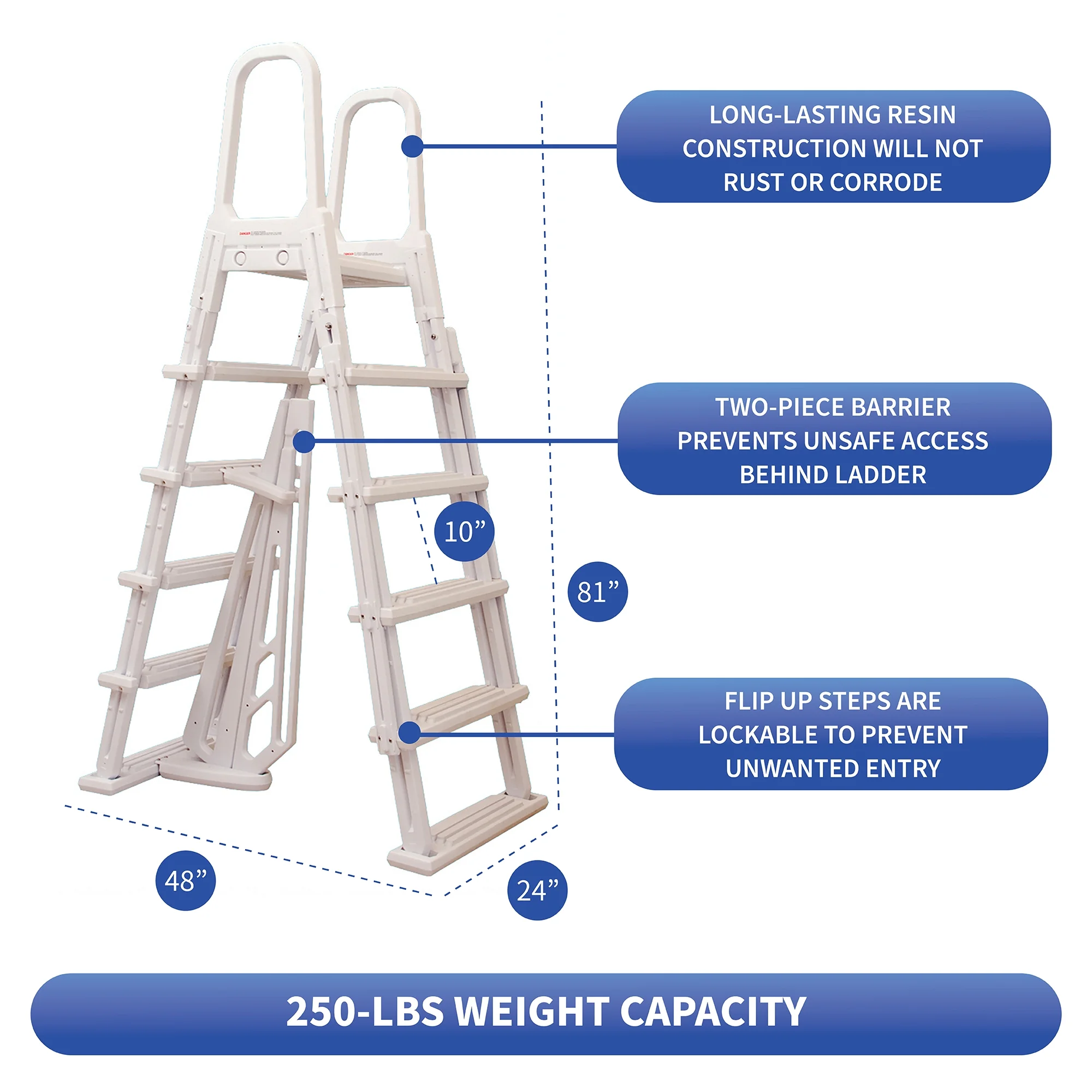- Sturdy, White resin A-Frame ladder with flip-up stairs for added security