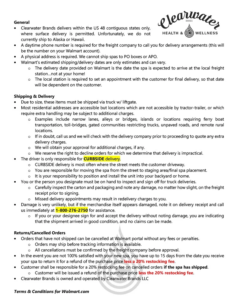 - Customer shall be responsible for a 20% restocking fee on cancelled orders if the spa has shipped. Customer will be issued a full refund of the purchase price less the 20% restocking fee.