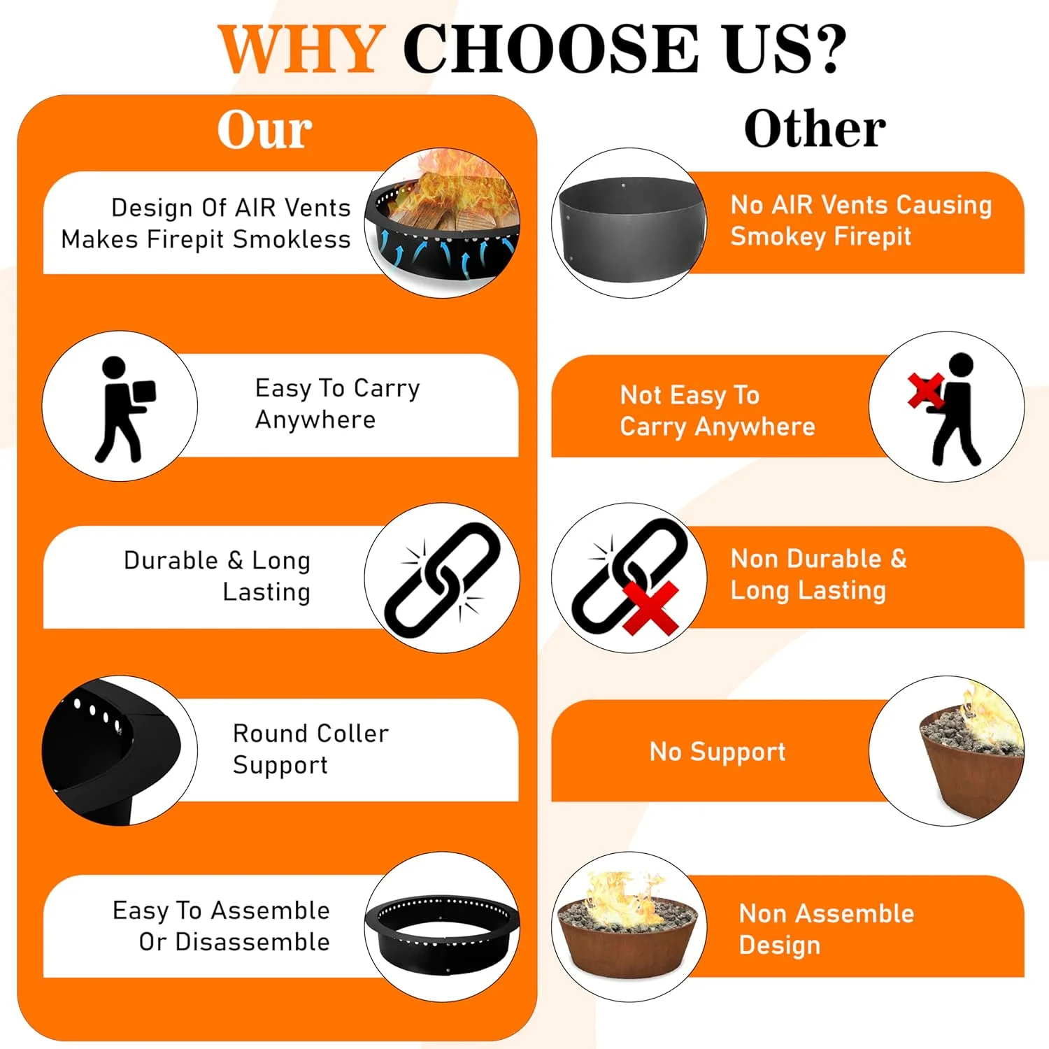 - Versatile Companion : Ignite the flames of celebration and togetherness with our versatile round fire pit. It's your ticket to lively bonfires that bring people closer, adding magic to any outdoor event