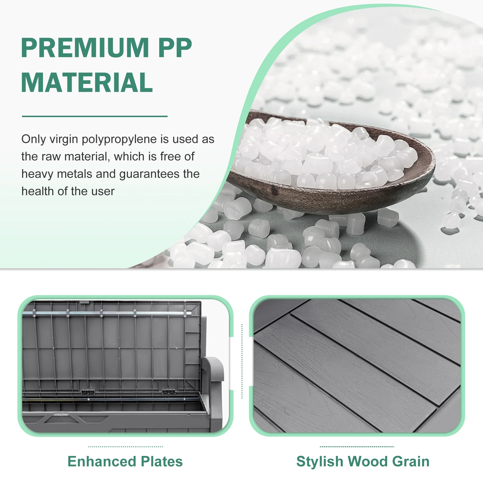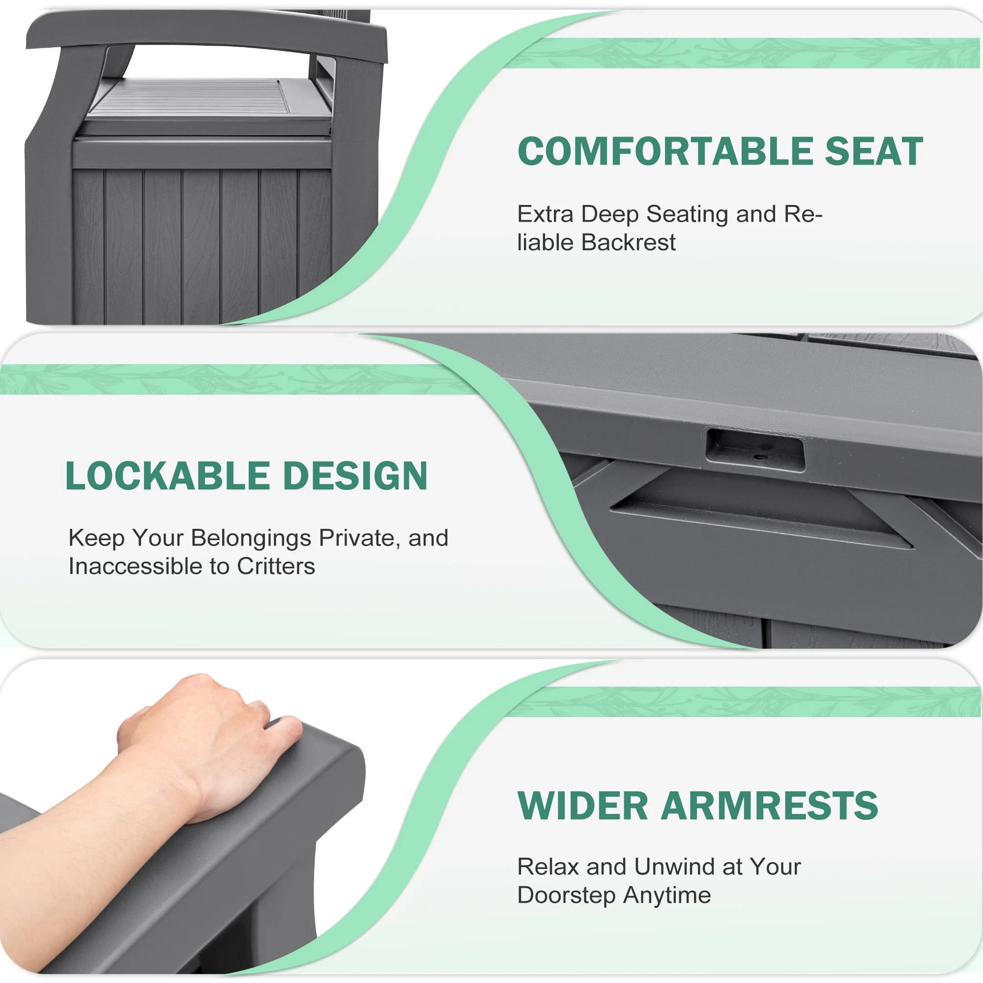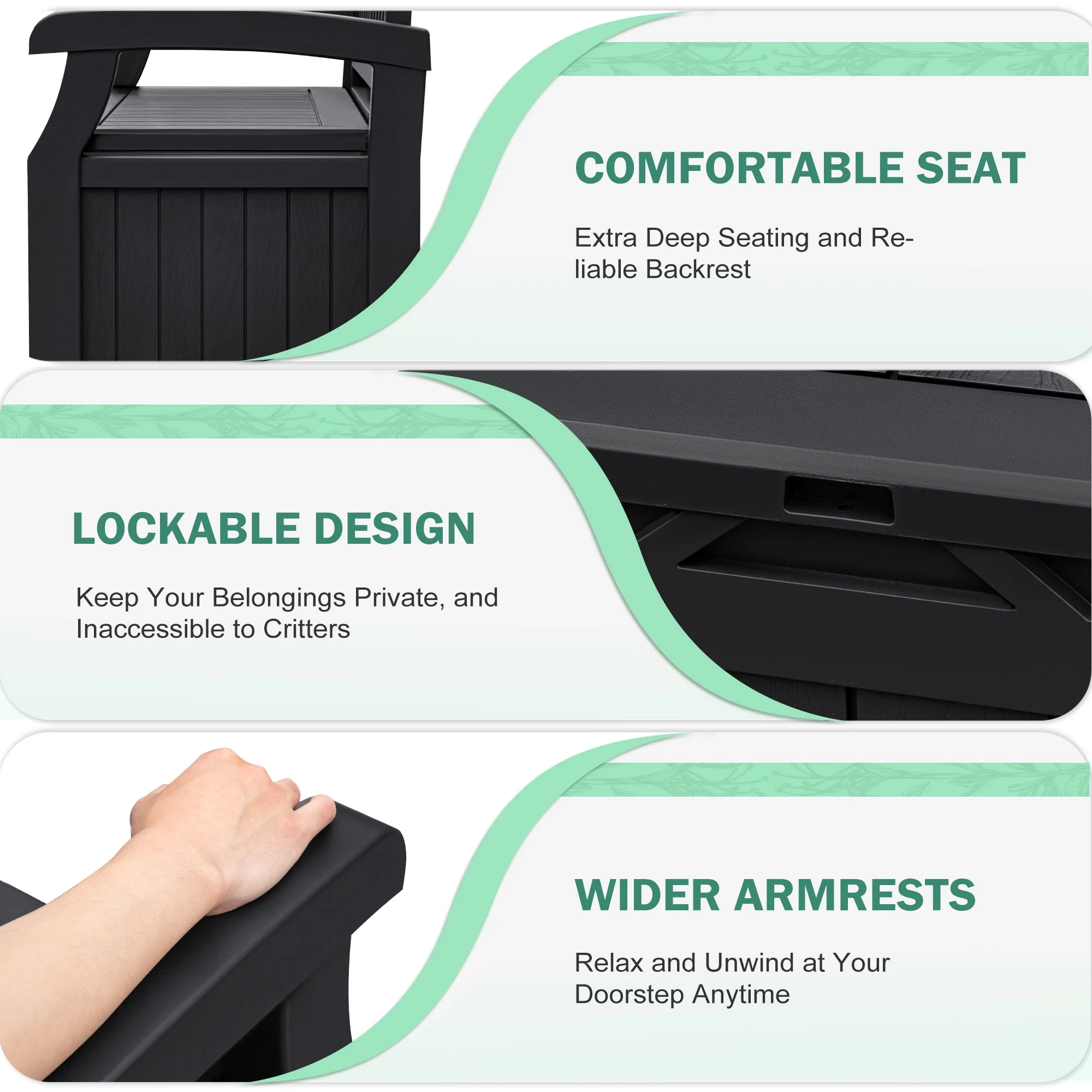 - This 80 gallon plastic storage bench is made of high quality resin material, which is environmentally friendly, safe and reliable, with excellent durability and stability. The resin material is not only lightweight and easy to carry, but also waterproof, moisture-proof and corrosion-resistant, which ensures that your belongings are safely stored and kept clean and tidy for a long time.