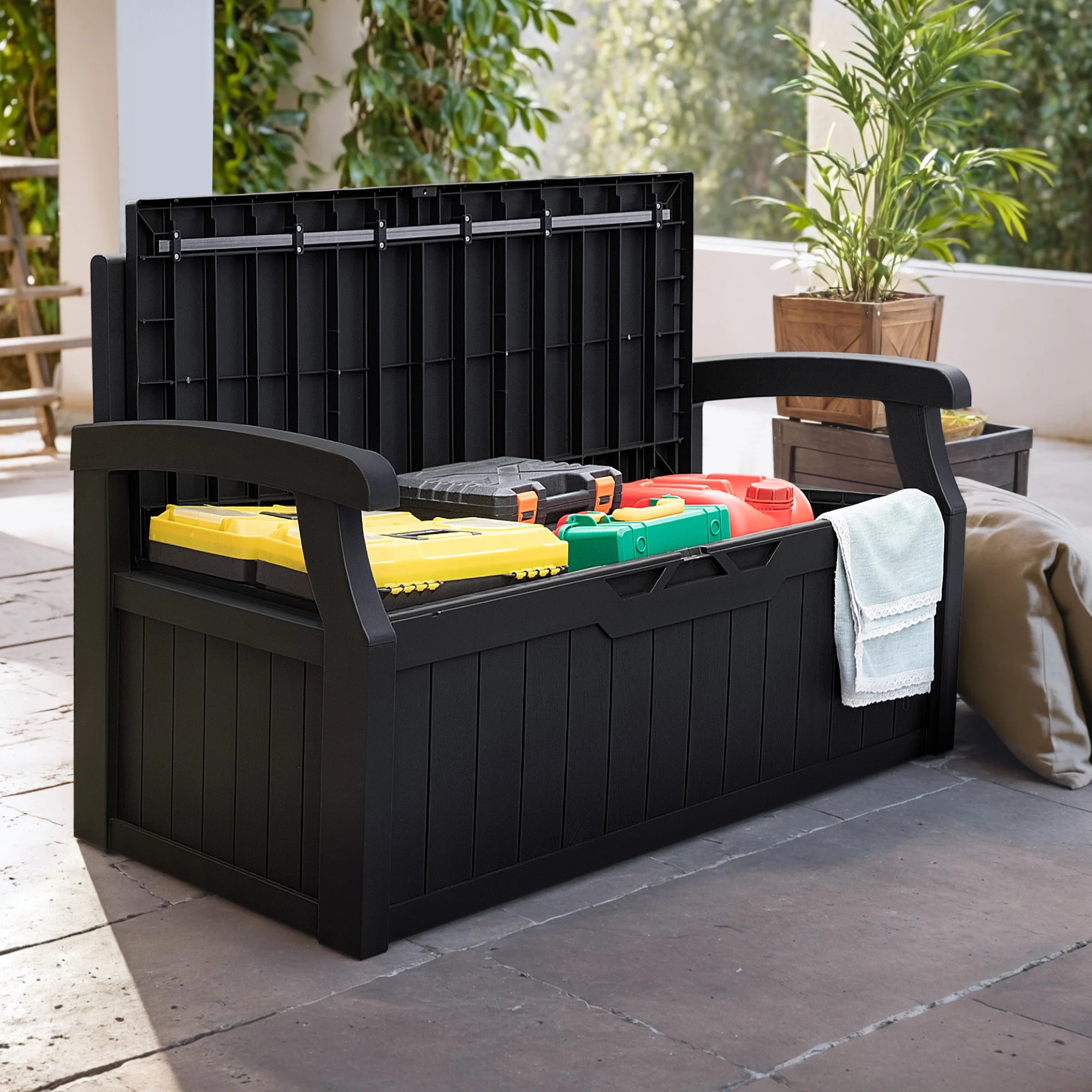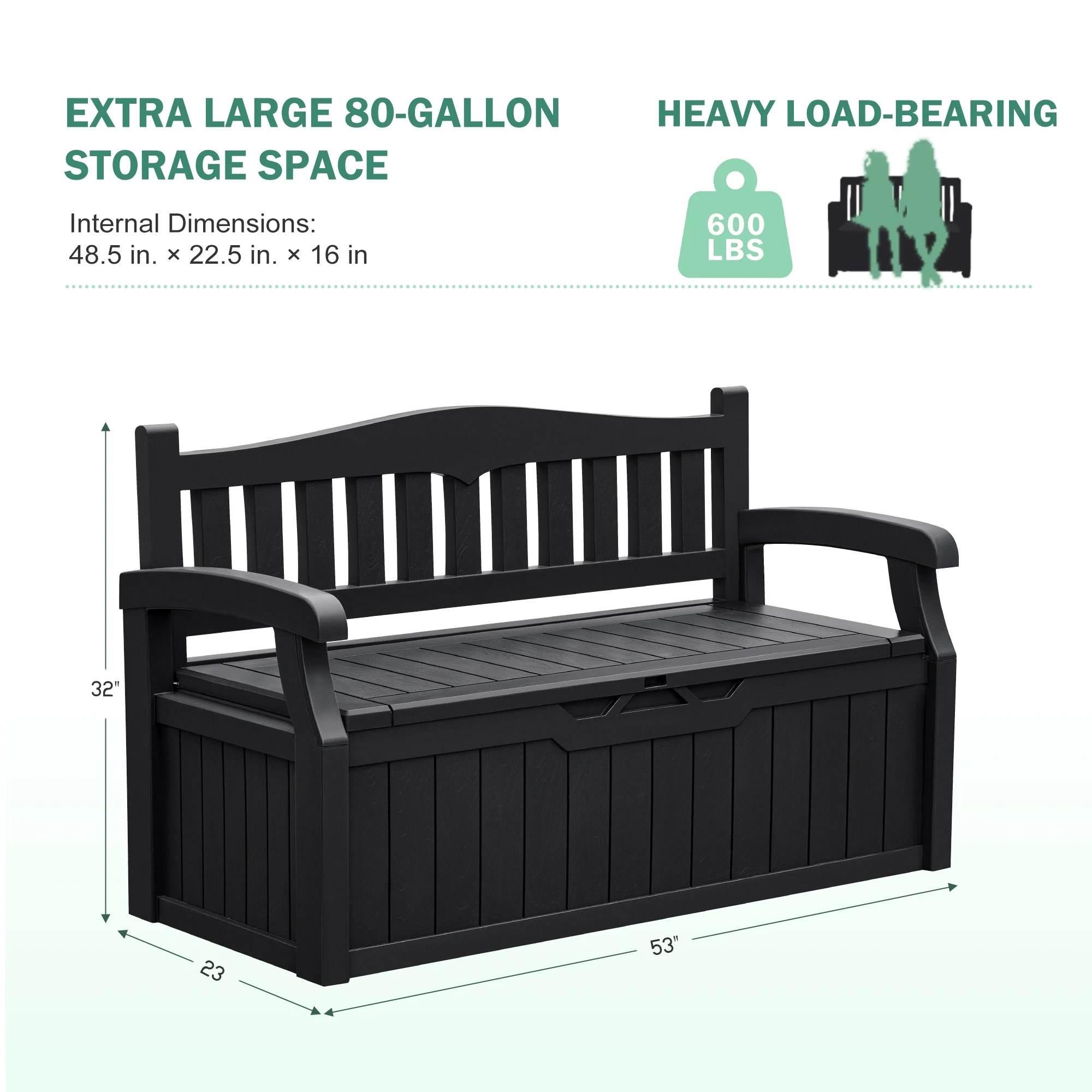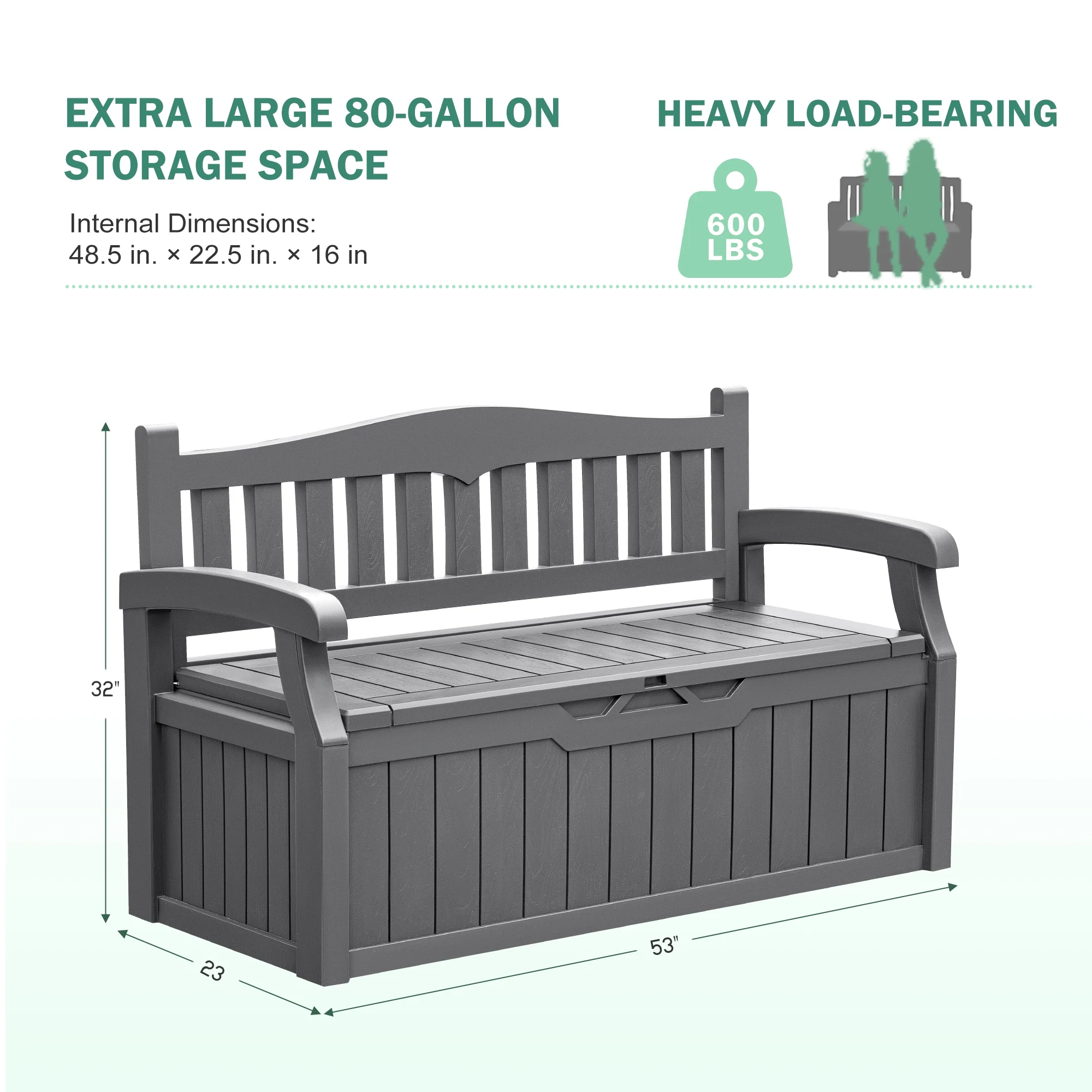 - The Homall 80 Gallon Plastic Storage Bench offers 80 gallons of storage space, which is large enough to hold a variety of outdoor items such as garden tools, pool toys, barbecue gear or seasonal decorations.