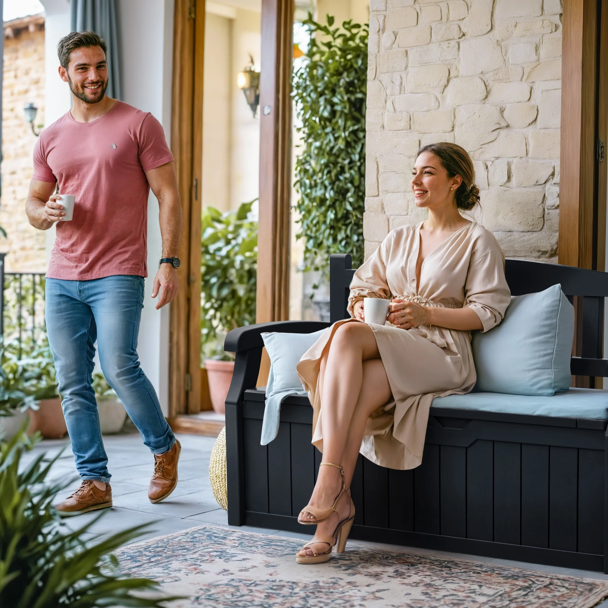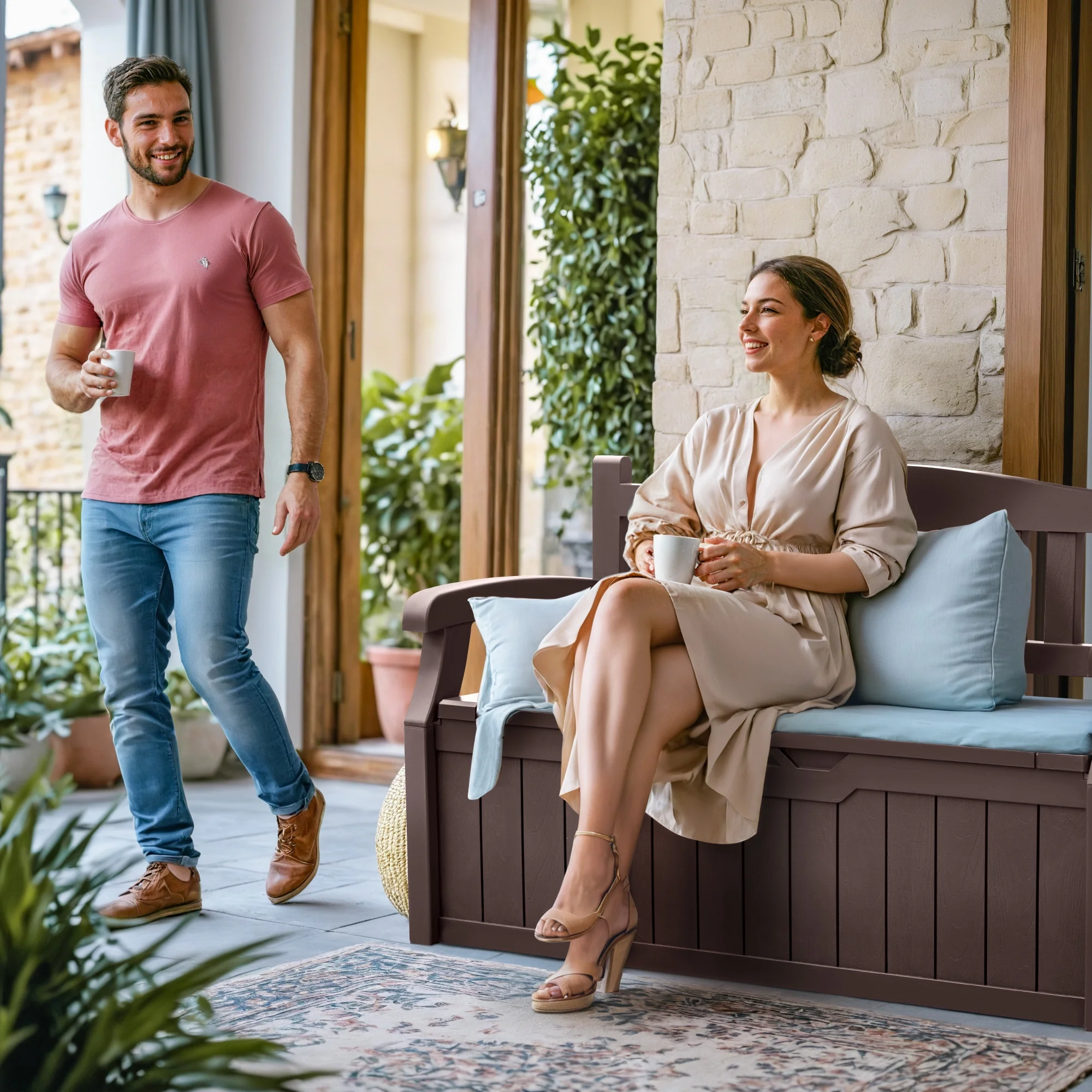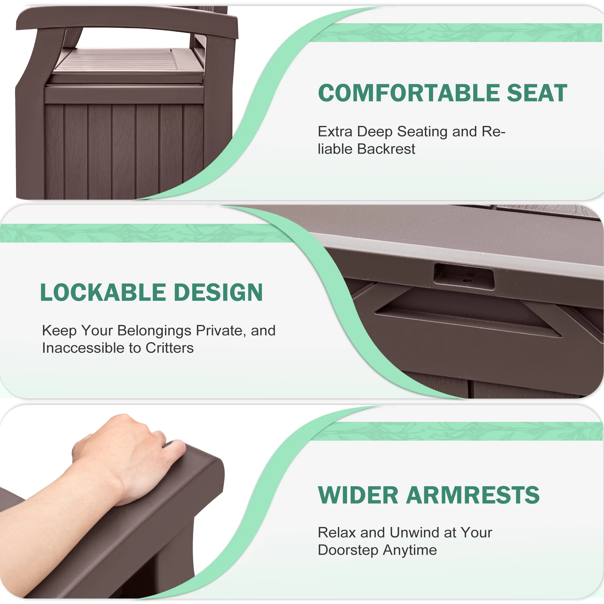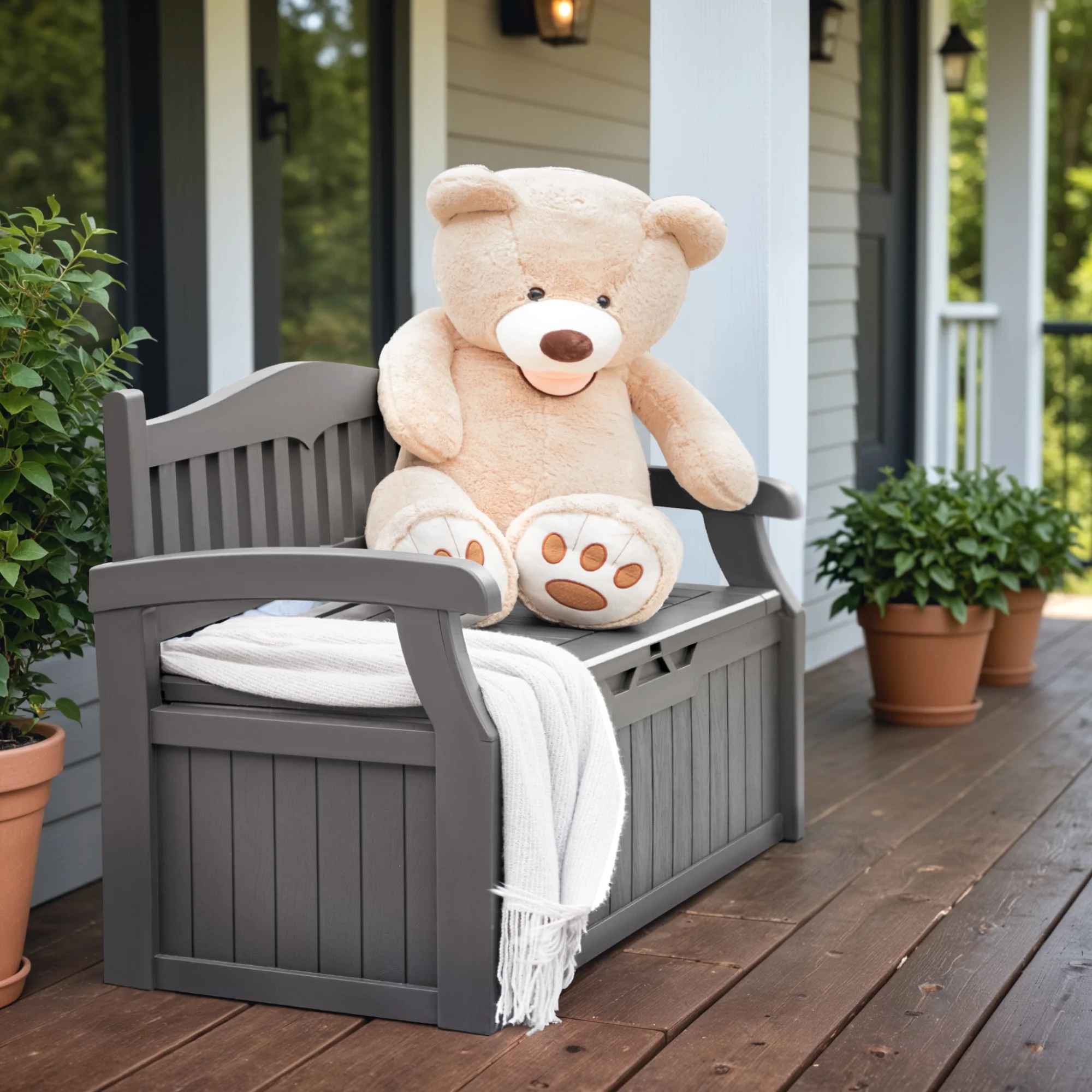 - The Homall 80 Gallon Plastic Storage Bench offers 80 gallons of storage space, which is large enough to hold a variety of outdoor items such as garden tools, pool toys, barbecue gear or seasonal decorations.