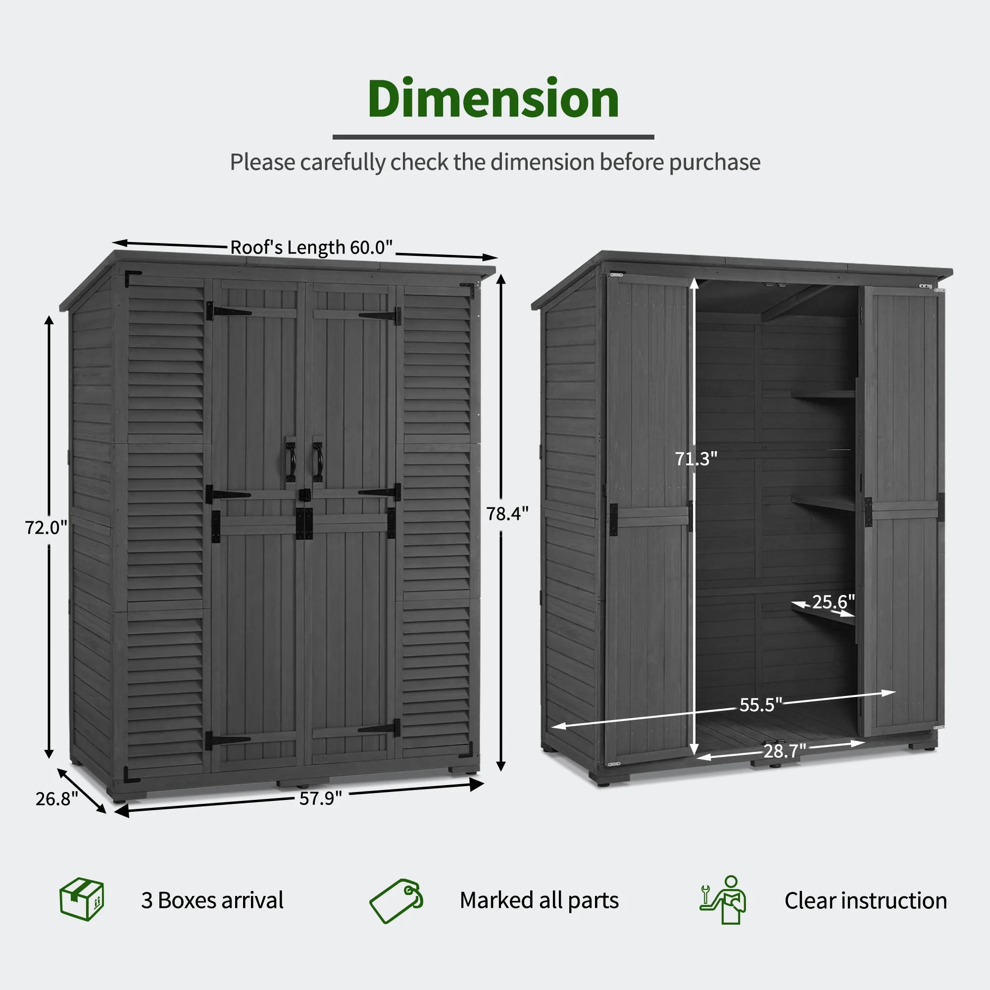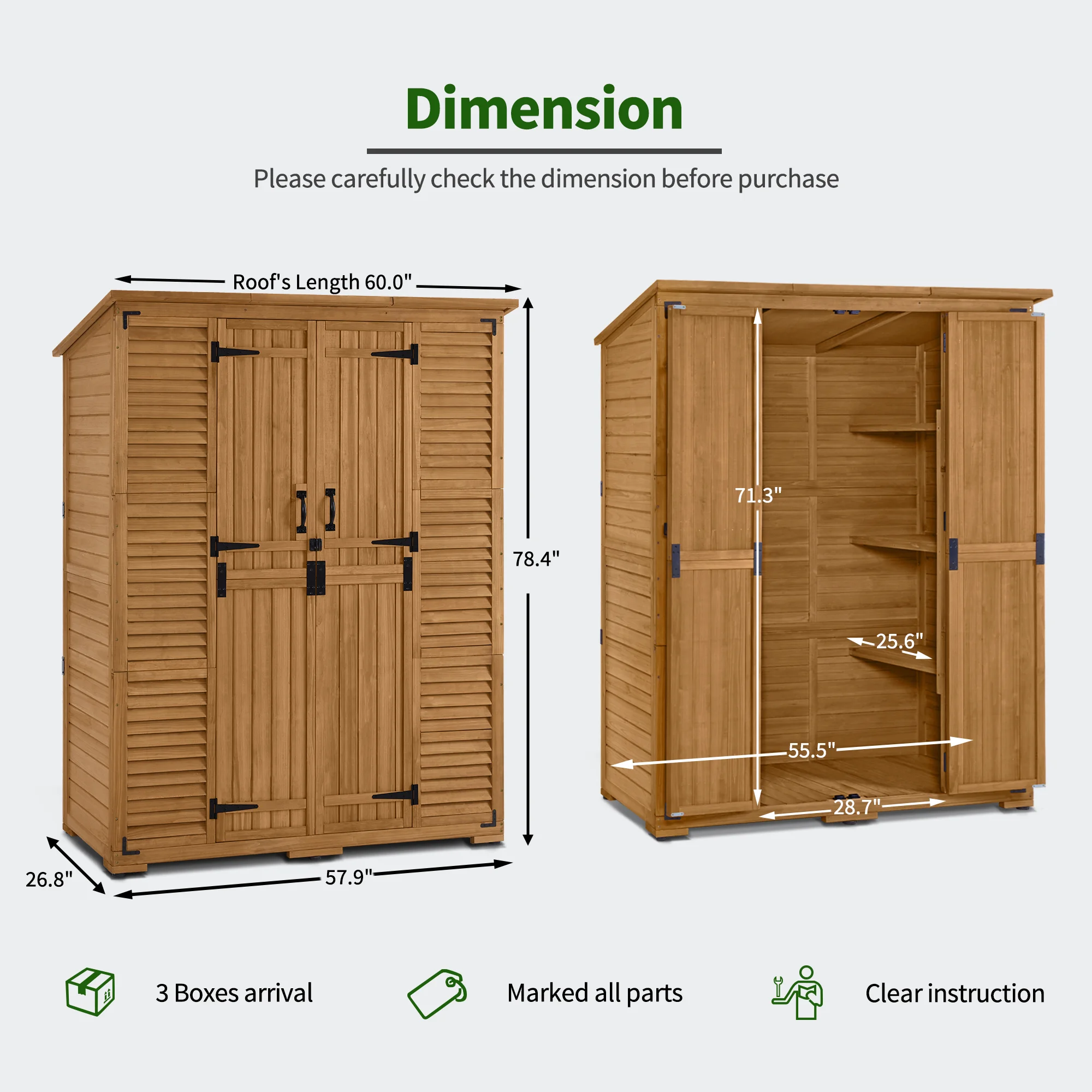 - Large Wood Shed: Hide the messy objects, pool equipment & chemicals and most garden tools, etc. The tool shed's size is the perfect addition to your garden, patio, deck, porch. (Dimension: 57.9" x 26.8" x 78.4")
