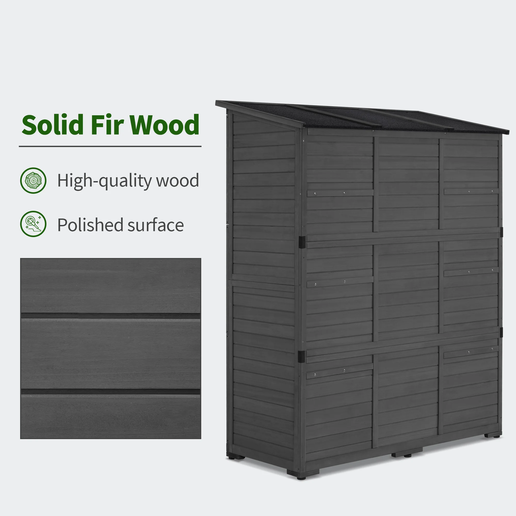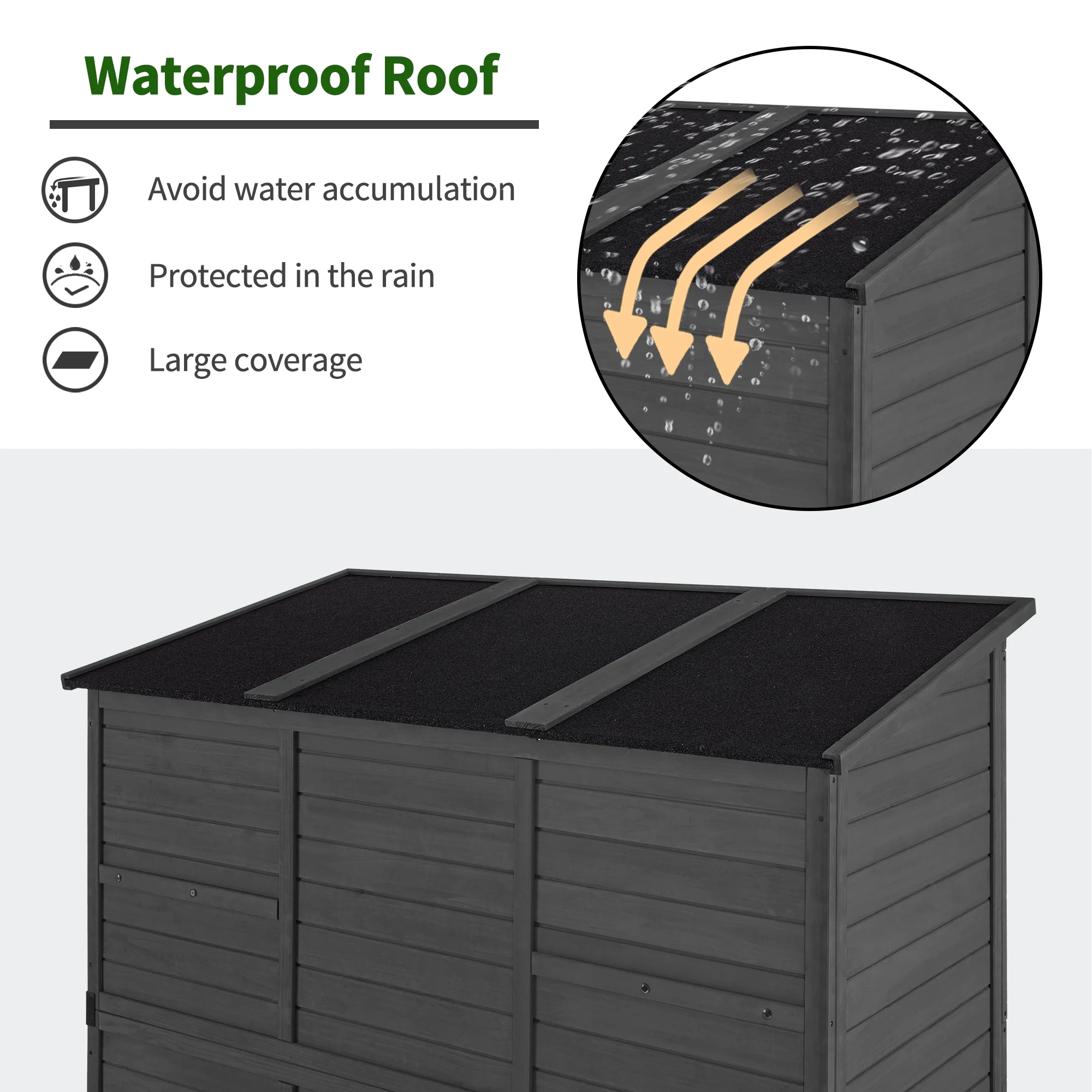 - Waterproof Roof: This sloping roof is covered with asphalt, it's not only waterproof but also void water accumulation, making the wooden storage upright longer service life outdoors.