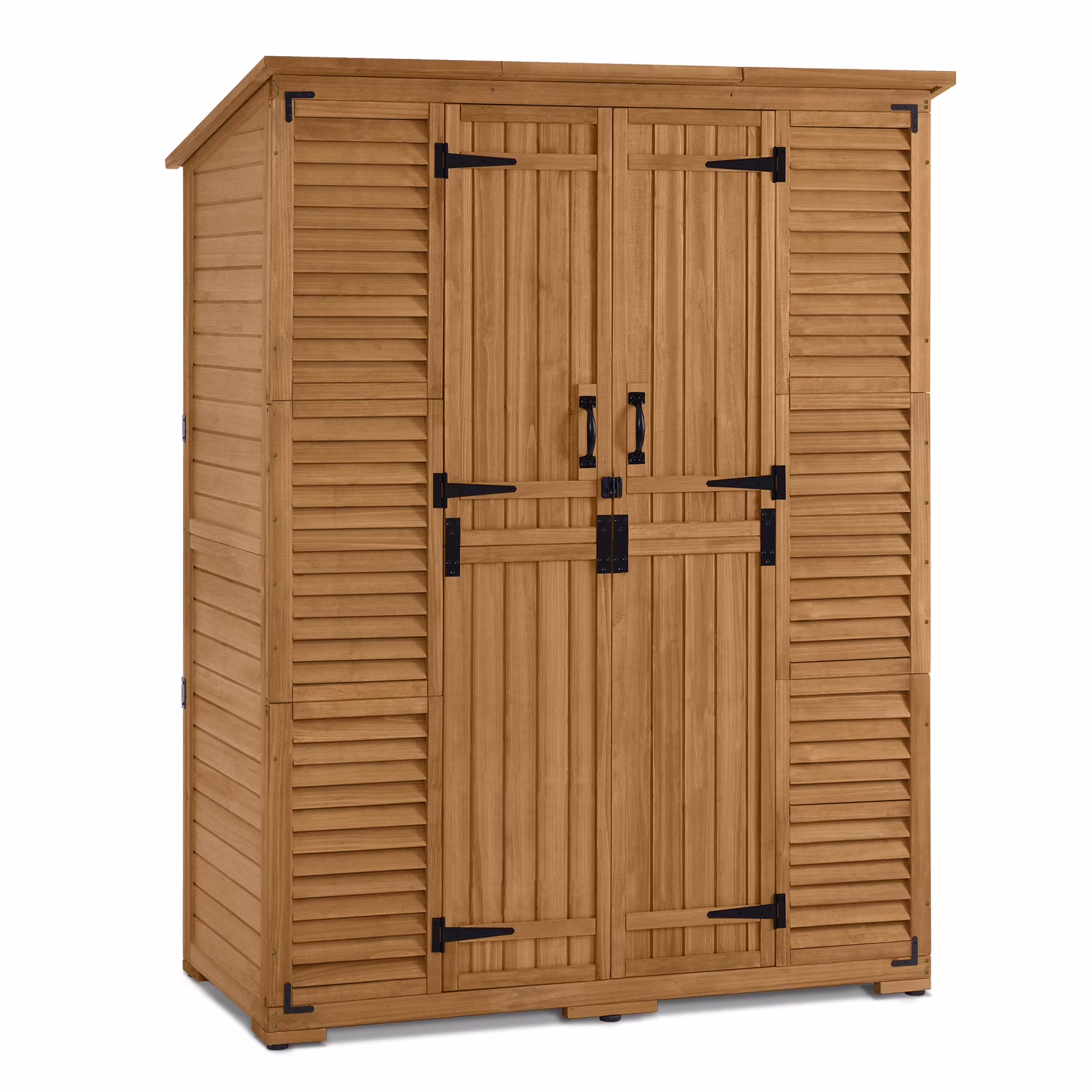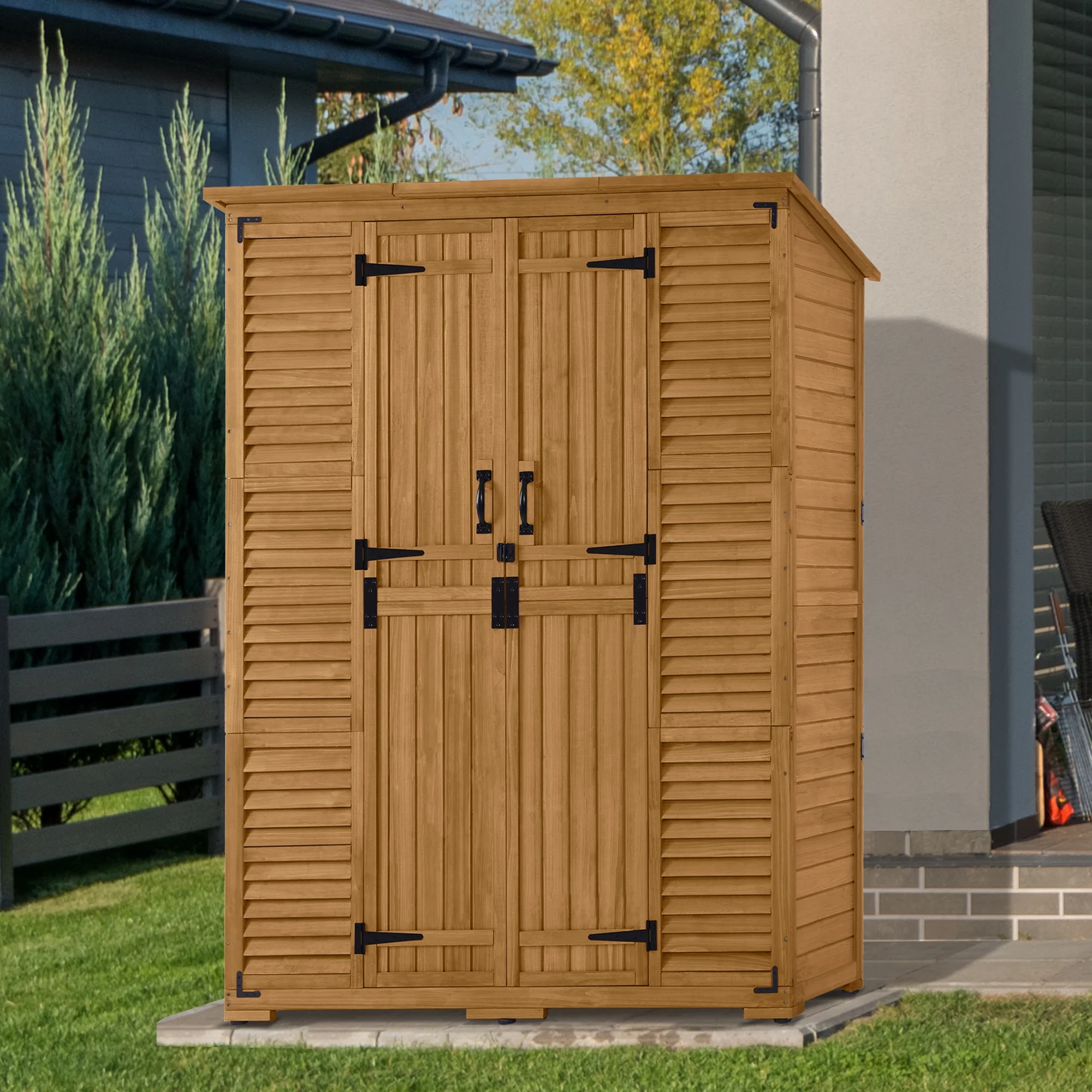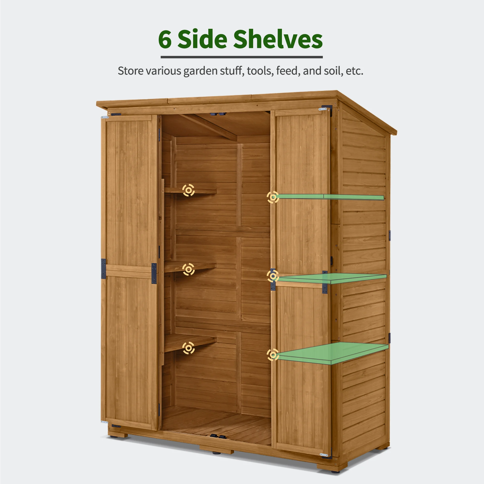 The wood outdoor storage cabinet shed can store most of your tools, such as watering can, water pipes, spades, pots, etc. Ending the messy garden life and tired back and forth.