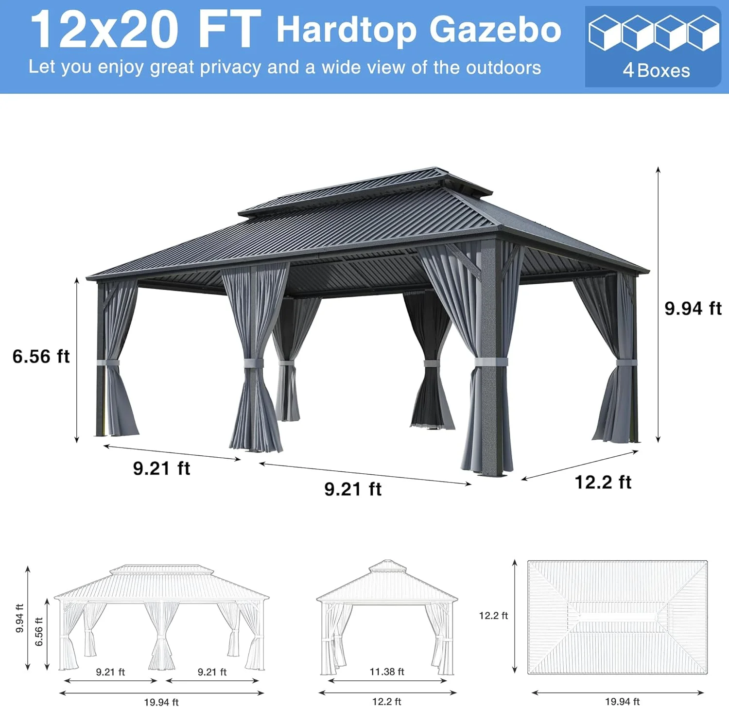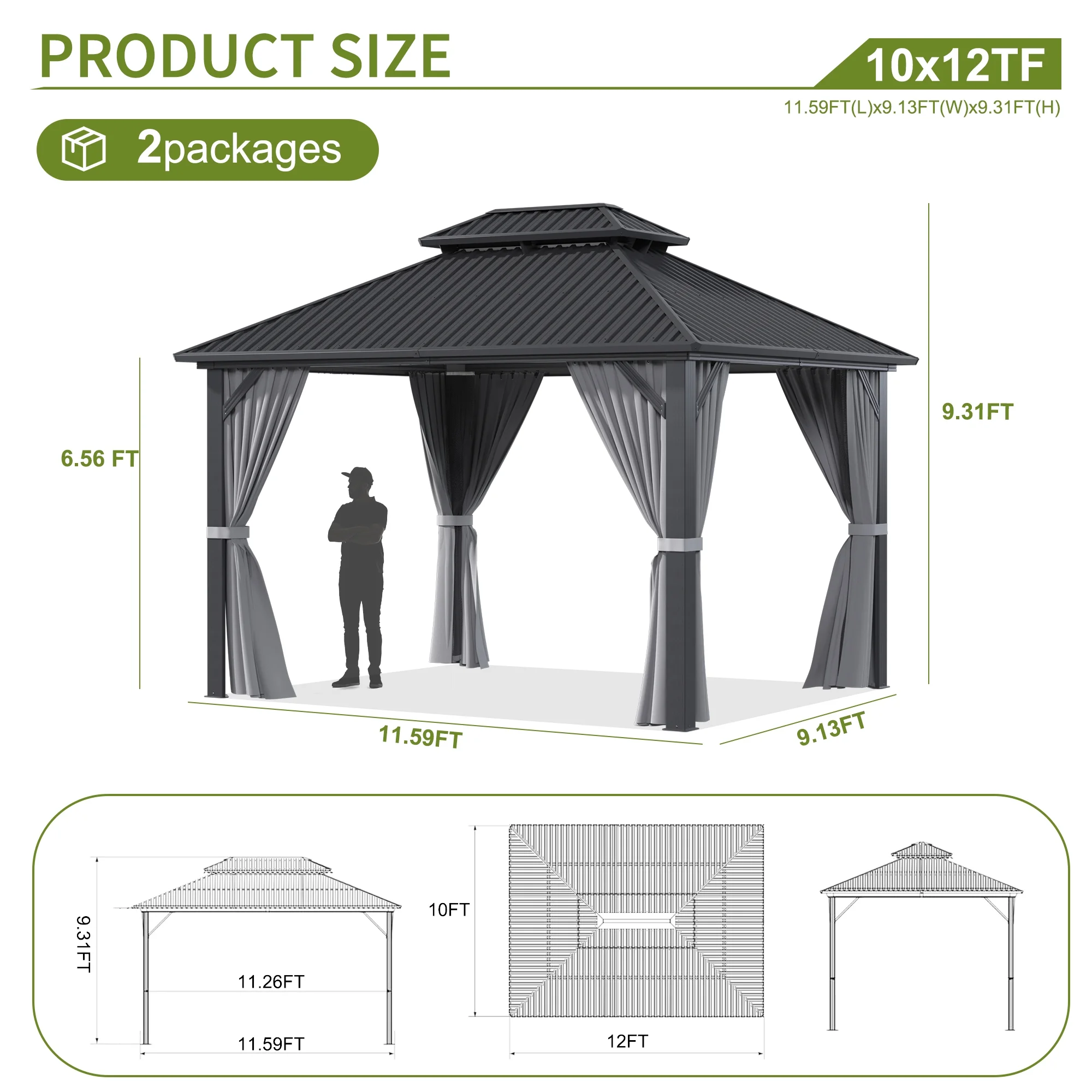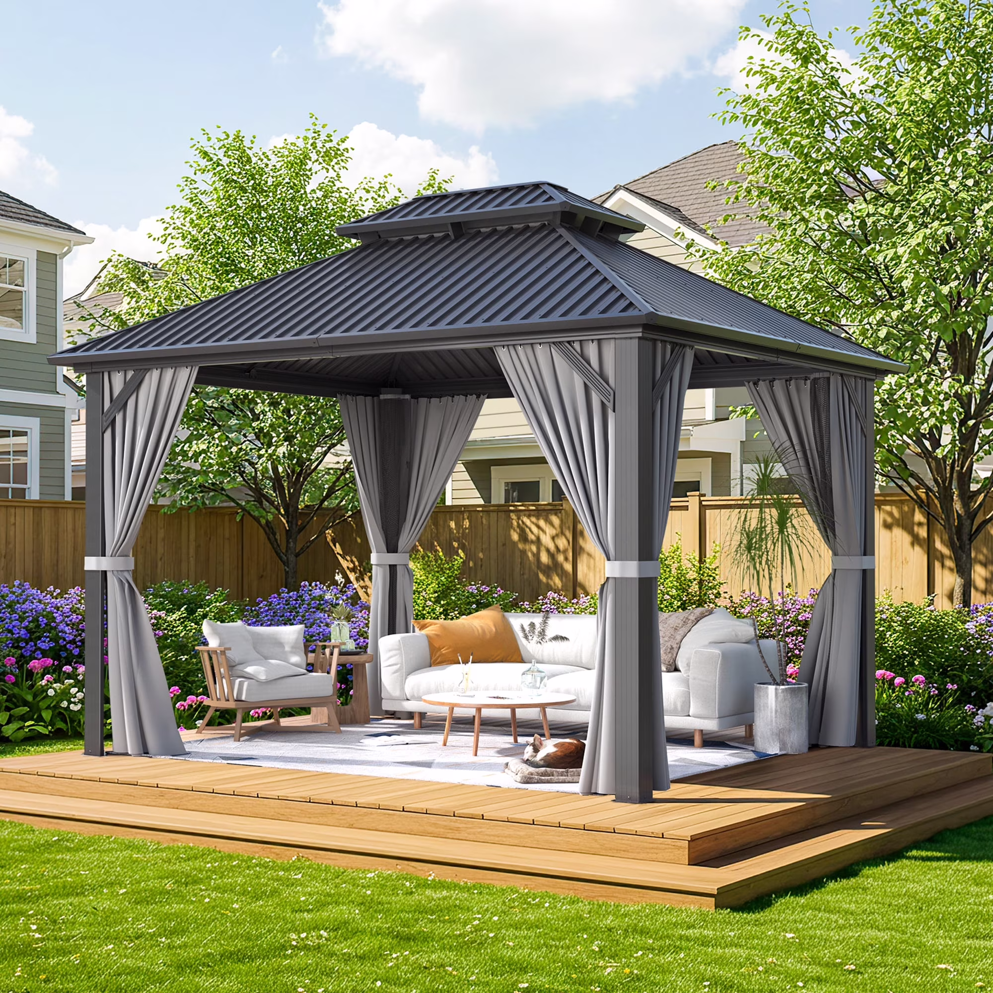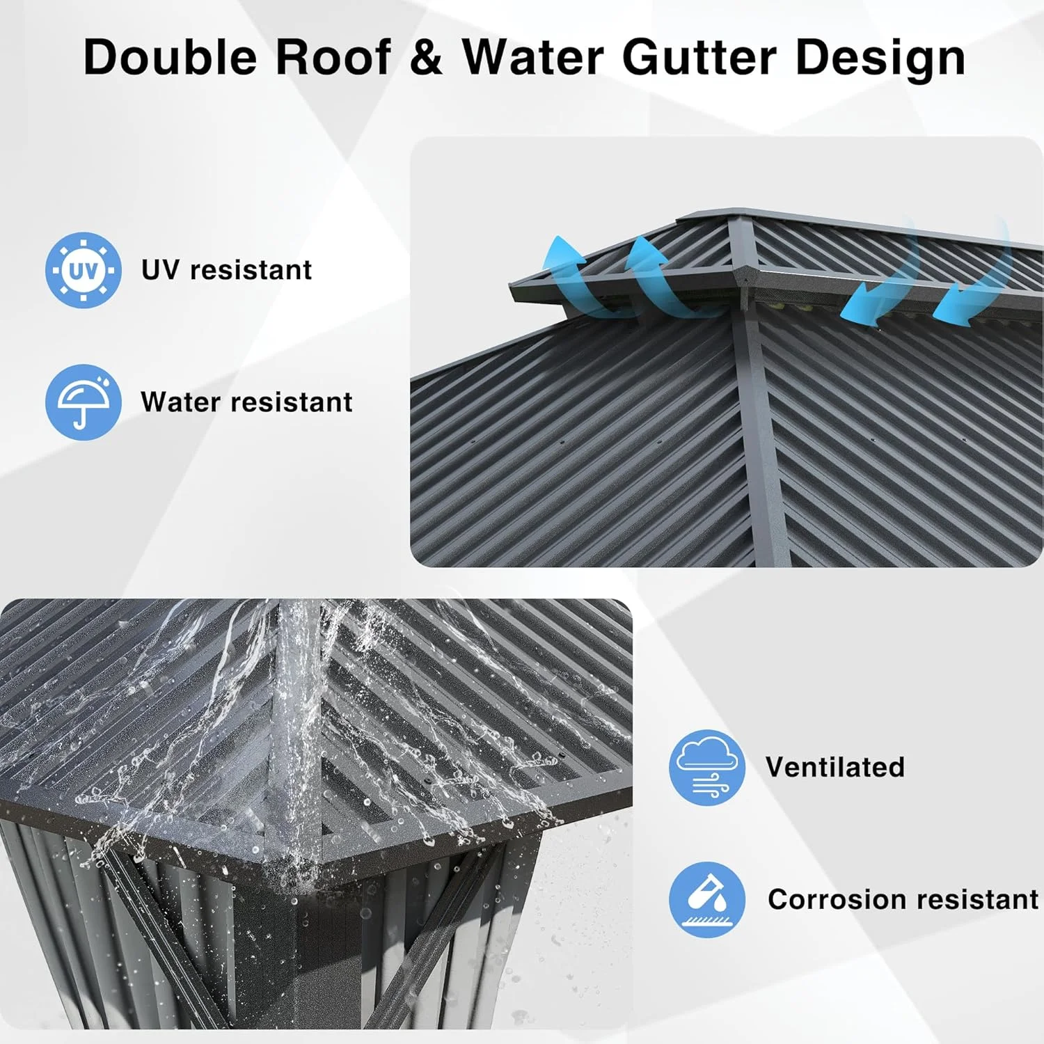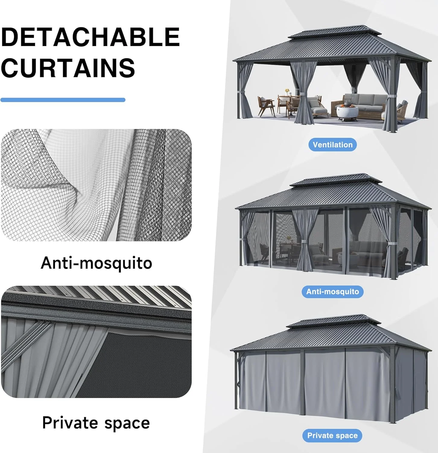- ��Practical Multi-functional Design��This gazebo offers full enclosure with zippered double sidewalls can effectively block UV rays and prevent mosquitoes from entering. The dual track system design ensures smooth sliding and easy adjustment of each curtain layer. The hardtop gazebo is topped with J-shaped hooks can hang the lights or fans to increase your outdoor comfort and ambiance.