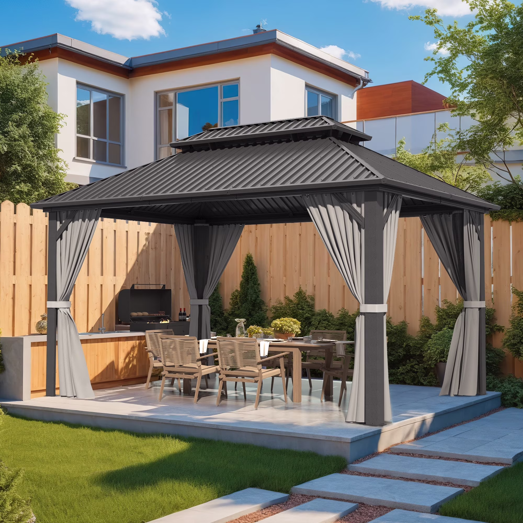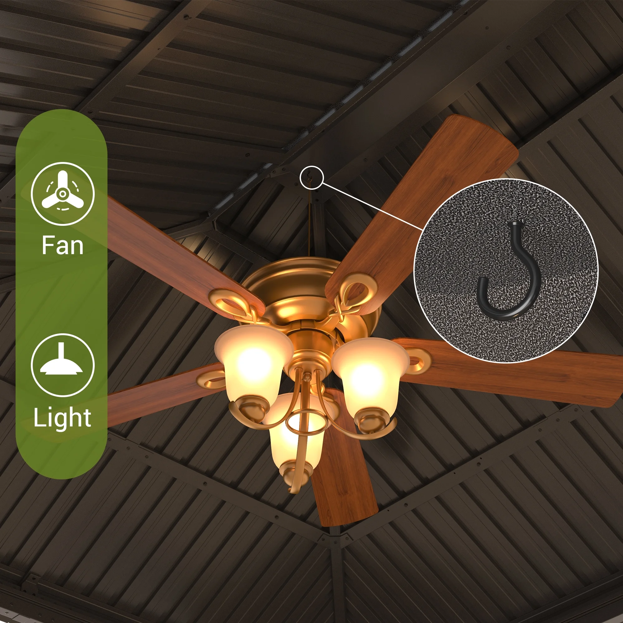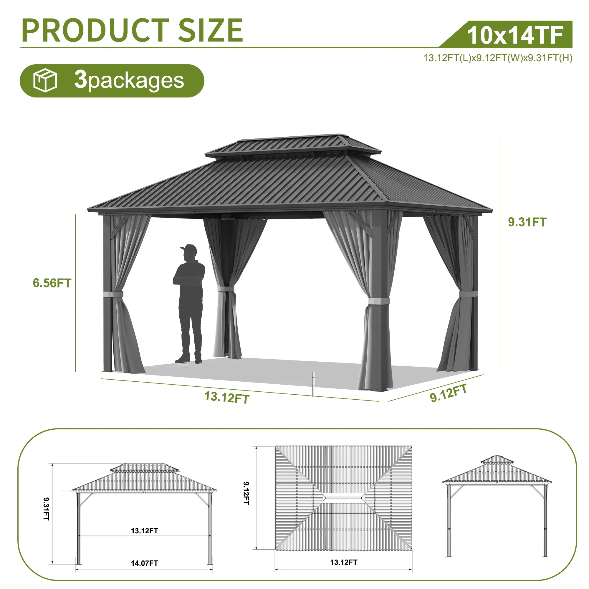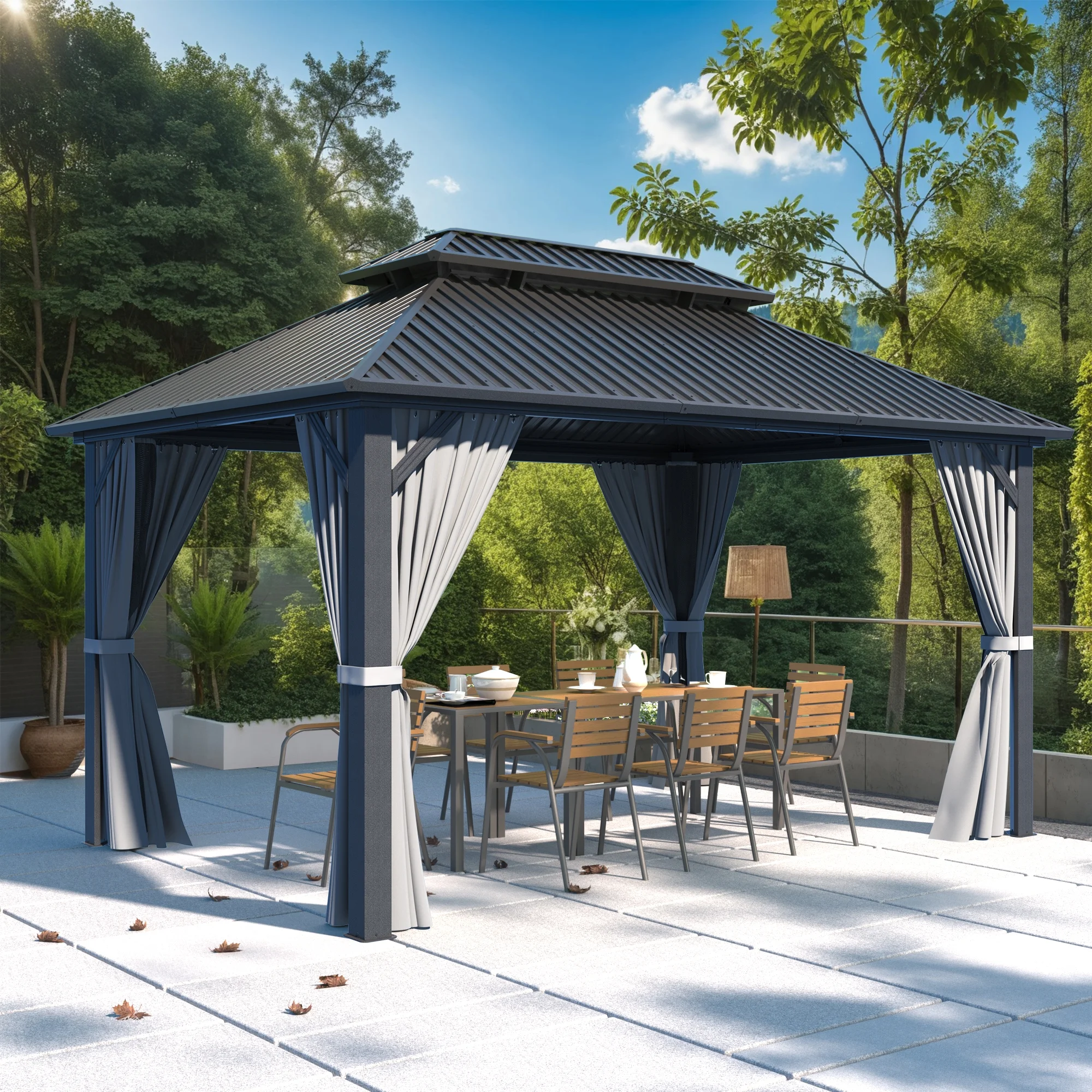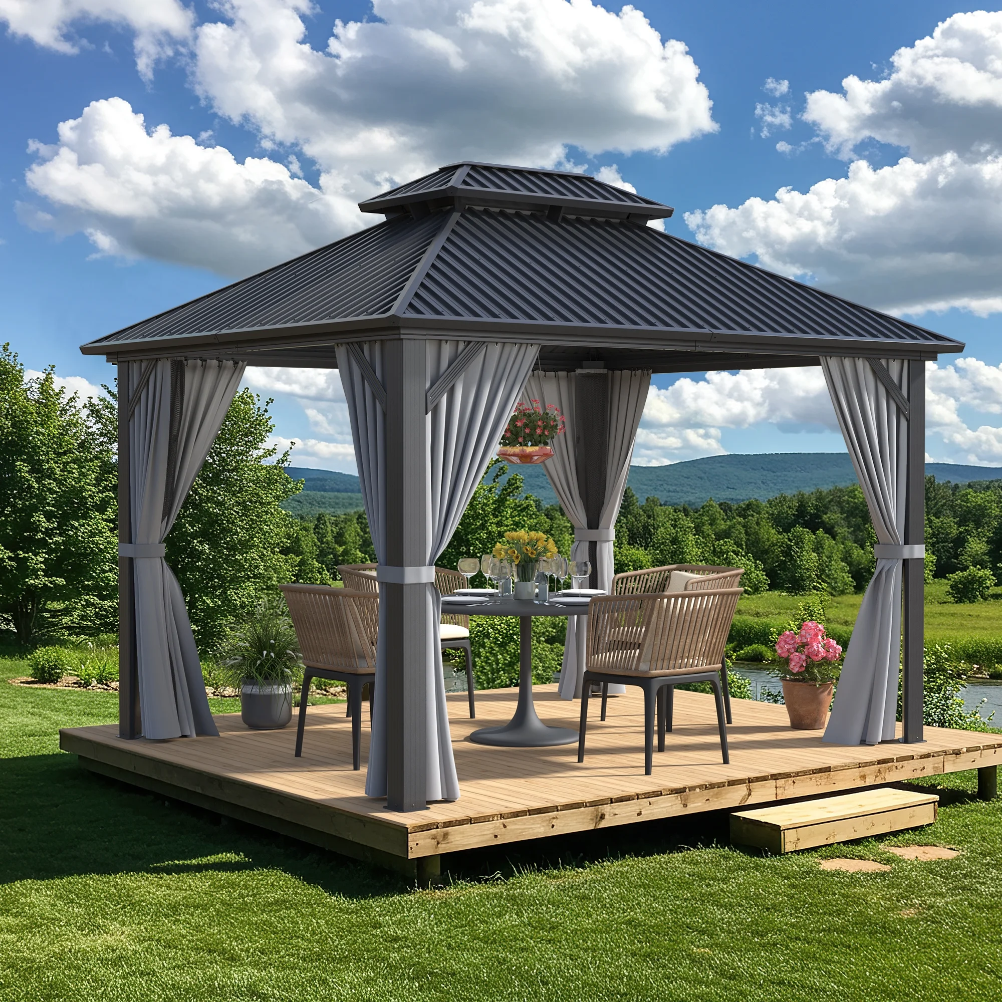 - ��Practical Multi-functional Design��This gazebo offers full enclosure with zippered double sidewalls can effectively block UV rays and prevent mosquitoes from entering. The dual track system design ensures smooth sliding and easy adjustment of each curtain layer. The hardtop gazebo is topped with J-shaped hooks can hang the lights or fans to increase your outdoor comfort and ambiance.